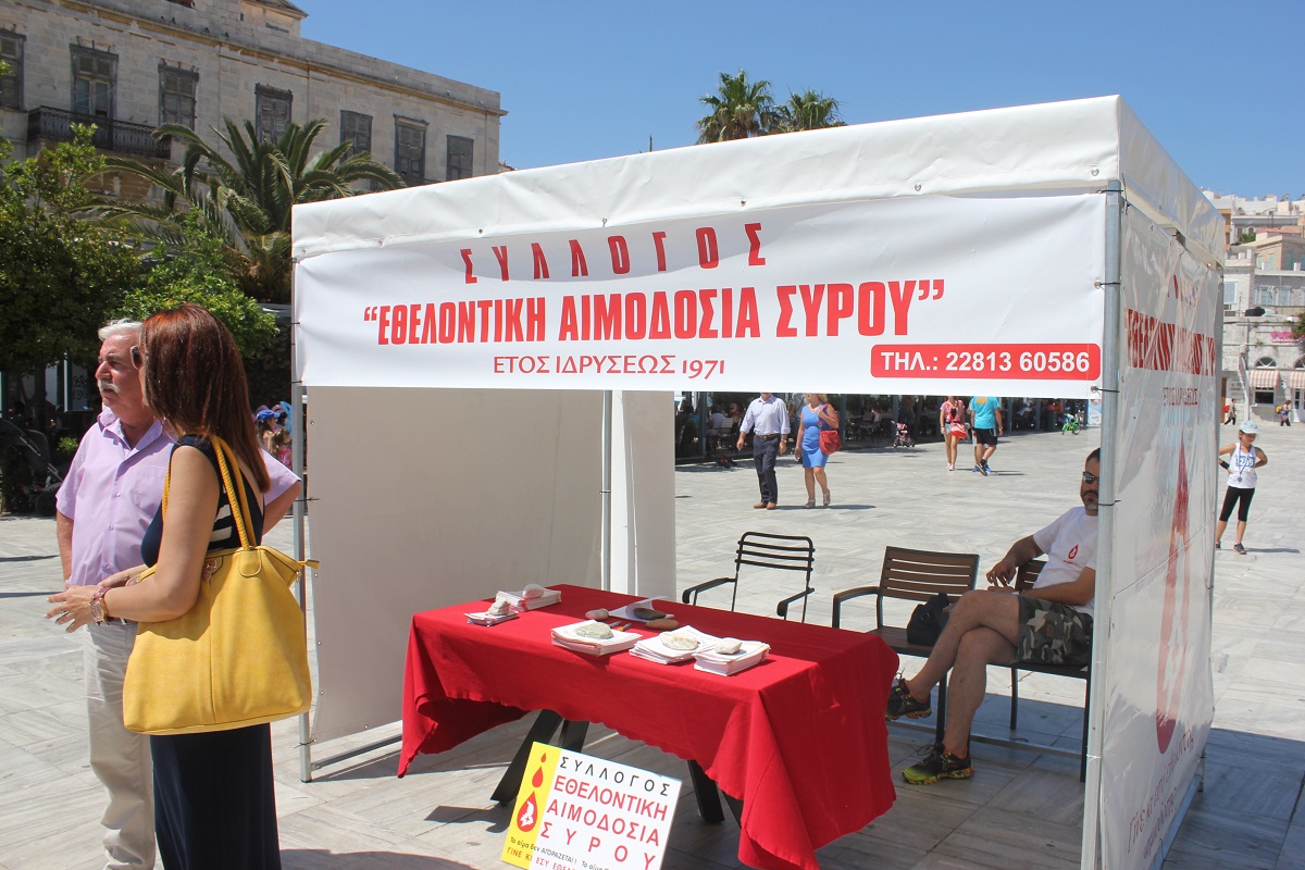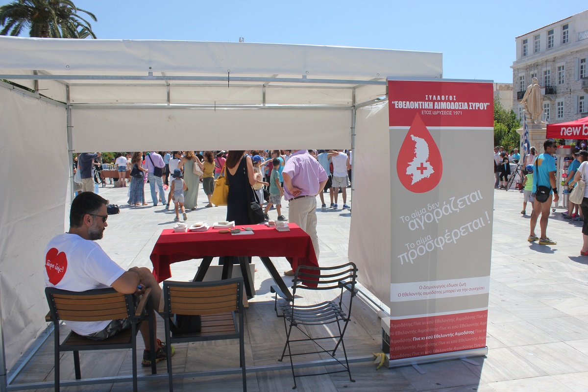 Τα μέλη του ιστορικού σωματείου, το οποίο από το 1971 προσφέρει πολύτιμο έργο στους κατοίκους του νησιού και όχι μόνο, χαρίζοντας το πολυτιμότερο αγαθό της ζωής σε εκείνους που το έχουν πραγματική ανάγκη, έστησαν το δικό τους περίπτερο στην πλατεία Μιαούλη, όπου είχαν την ευκαιρία να μιλήσουν στους επισκέπτες για τη σημασία της αιμοδοσίας.