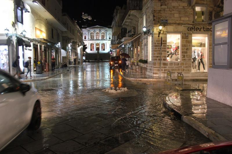 Η βαριά νεροποντή με τον αυξημένο όγκο ομβρίων υδάτων, καθώς και οι νότιοι άνεμοι δημιούργησαν έντονο πρόβλημα στο σημείο της Αγοράς (στο τέλος της οδού Χίου), όπου εκτελούνται εργασίες, στα πλαίσια της ανάπλασης της παραλίας, ταυτόχρονα με εργασίες της ΔΕΥΑΣ, τοποθέτησης νέων αγωγών απορροής υδάτων στην παραλία της Ερμούπολης.