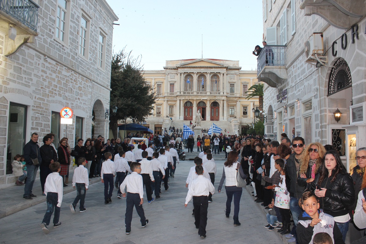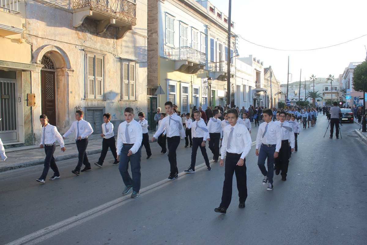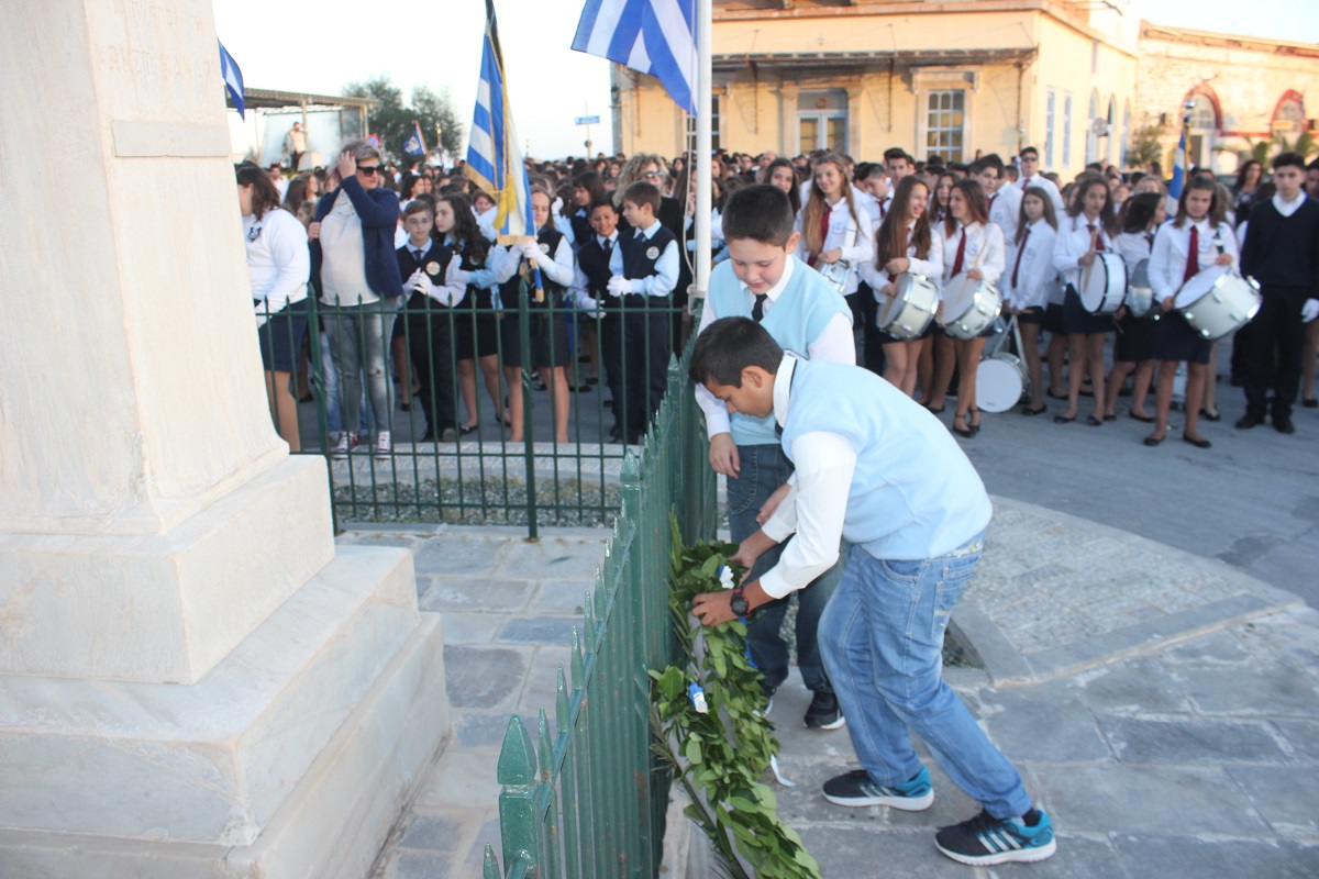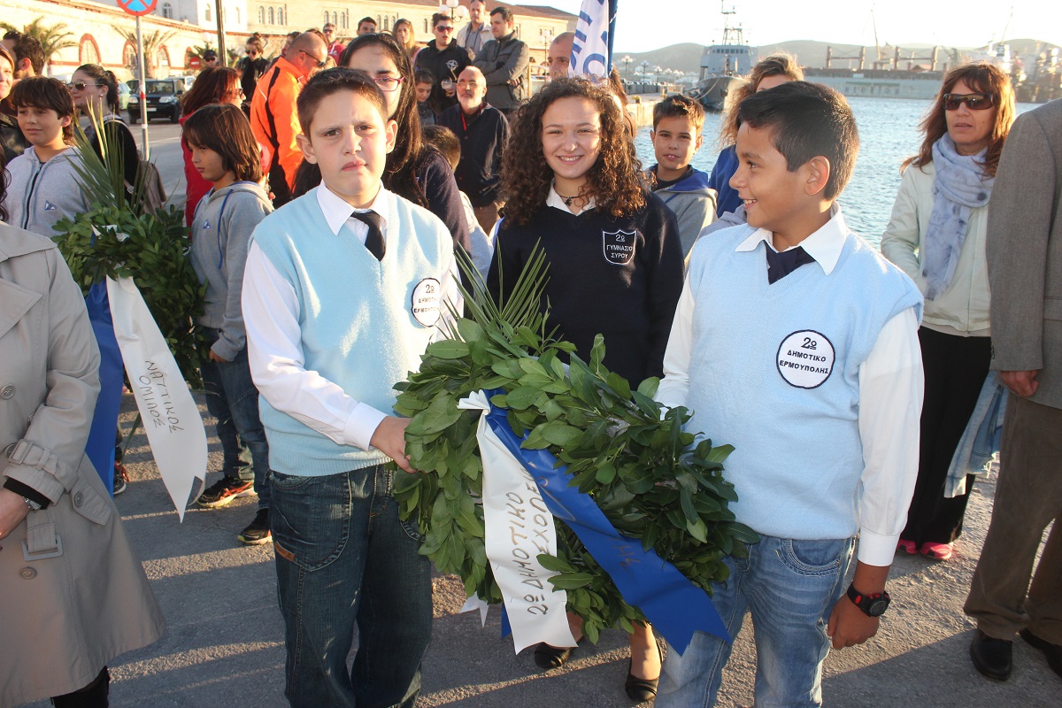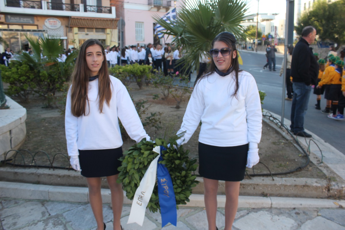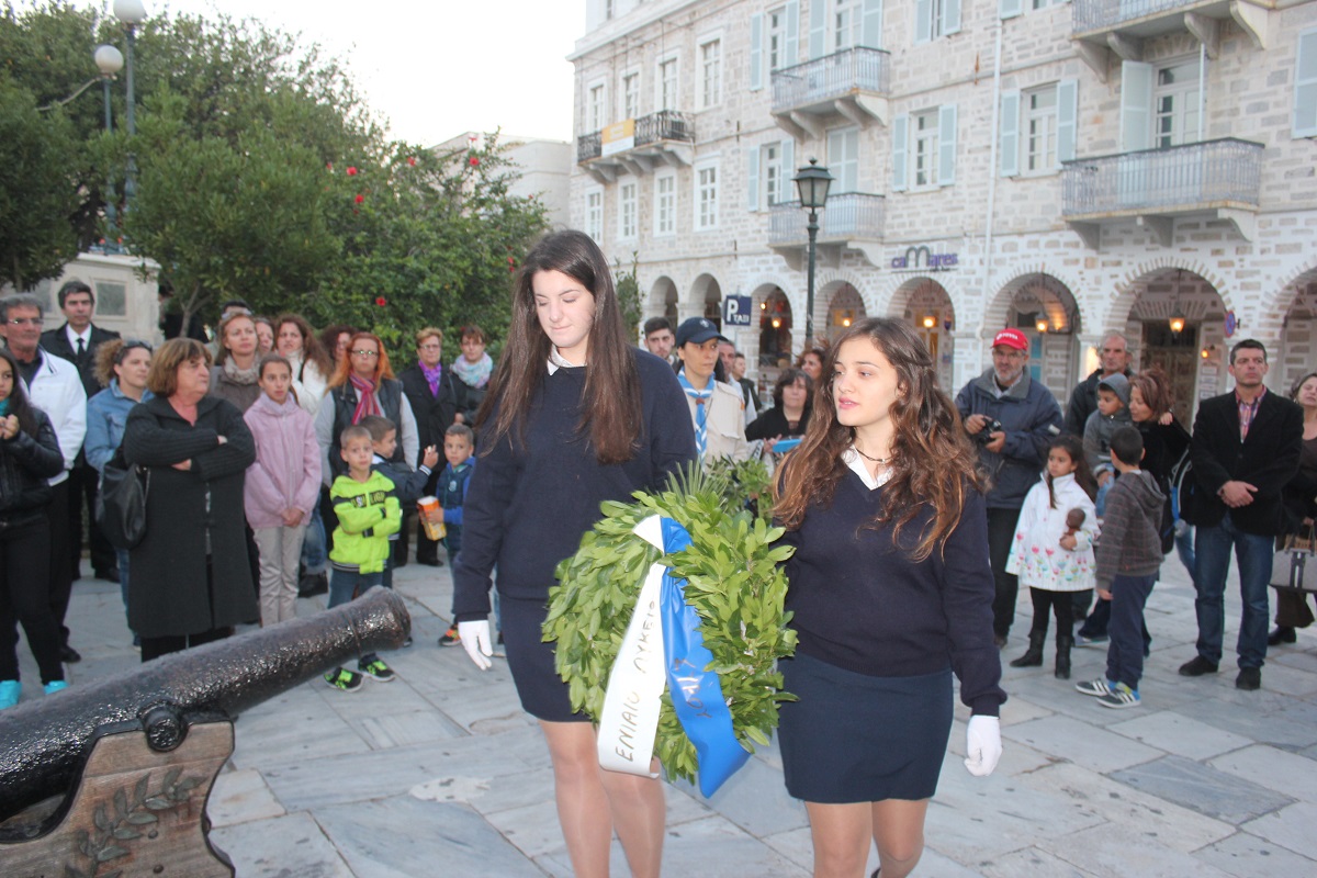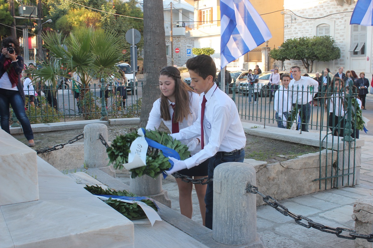 Με υψηλό το αίσθημα σεβασμού προς τον ηρωισμό των Ελλήνων που αντιστάθηκαν και αγωνίσθηκαν με περίσσευμα ψυχής πριν από 75 χρόνια, οι μαθητικές κοινότητες αφού συγκεντρώθηκαν στα προκαθορισμένα σημεία συνάντησης, παρέλασαν συντεταγμένες συνοδεία των δασκάλων και των καθηγητών τους προς έξι μνημεία της Ερμούπολης όπου και κατέθεσαν στεφάνια.