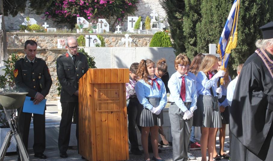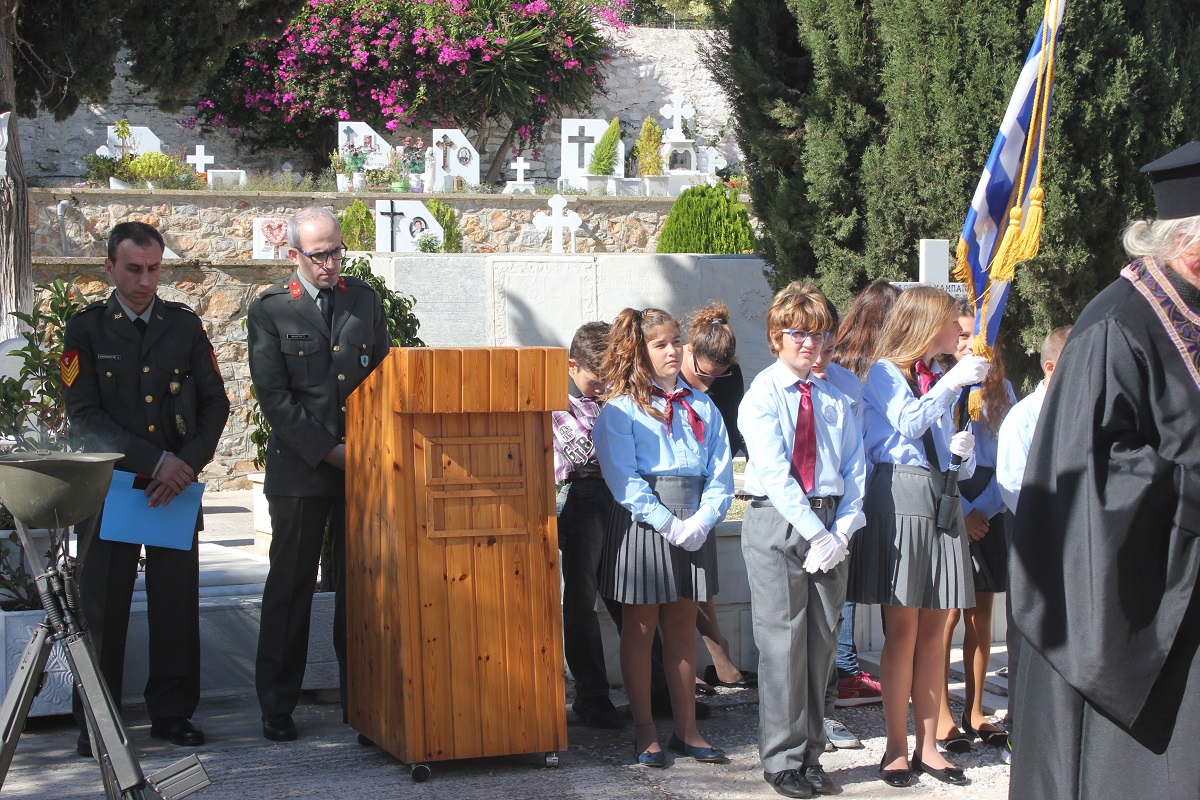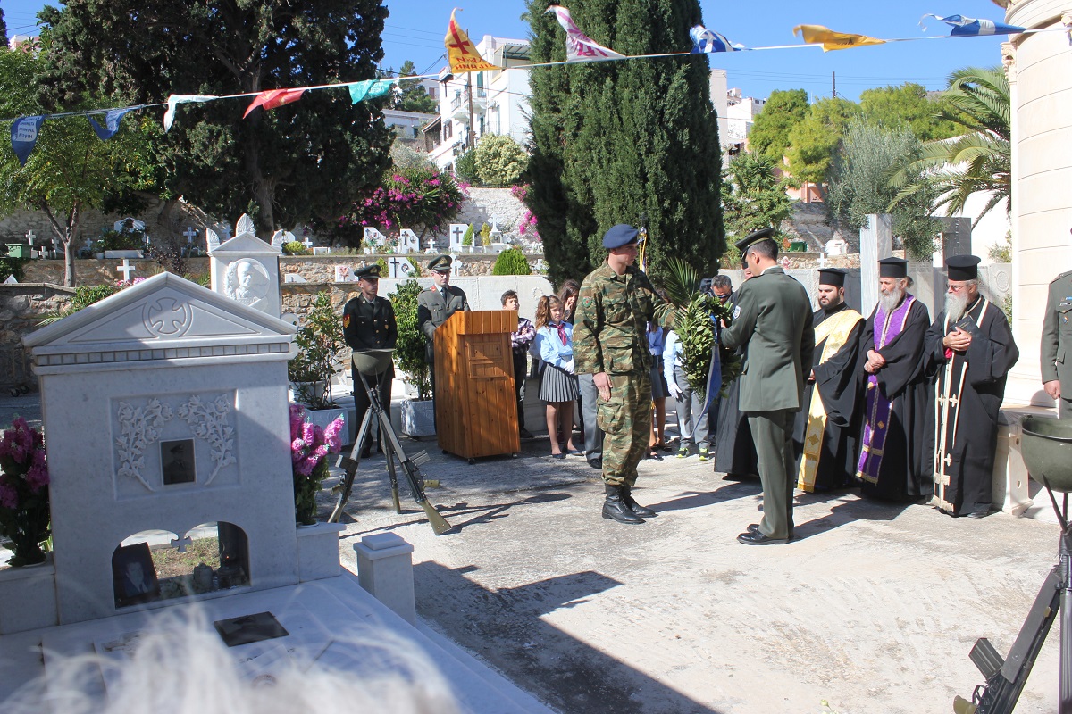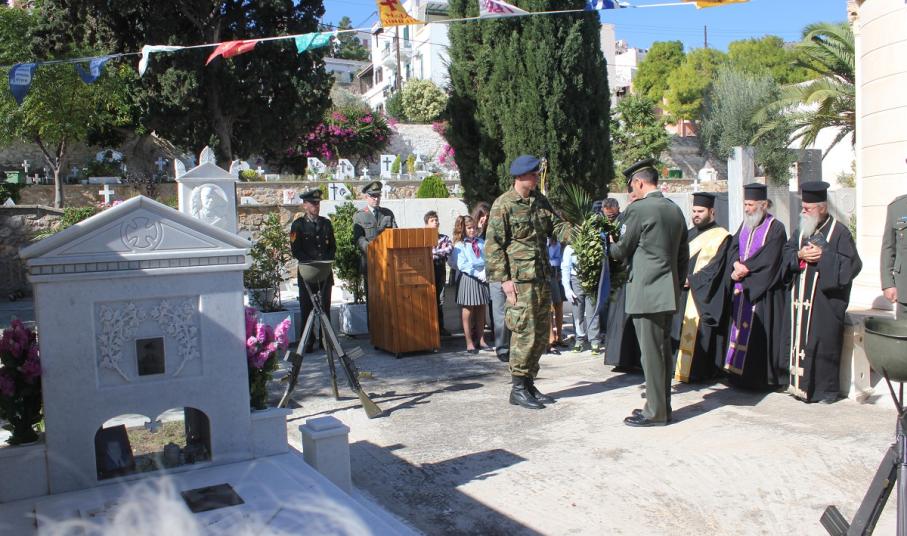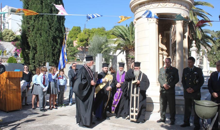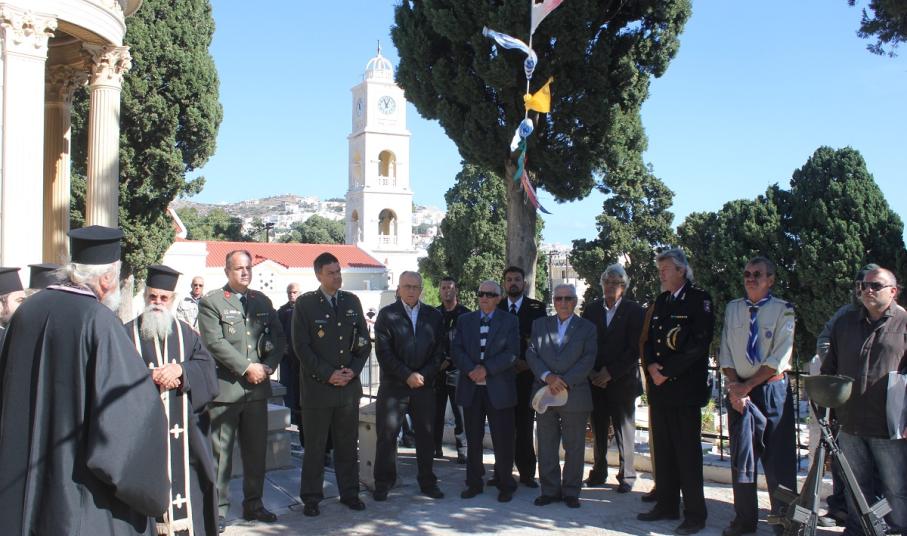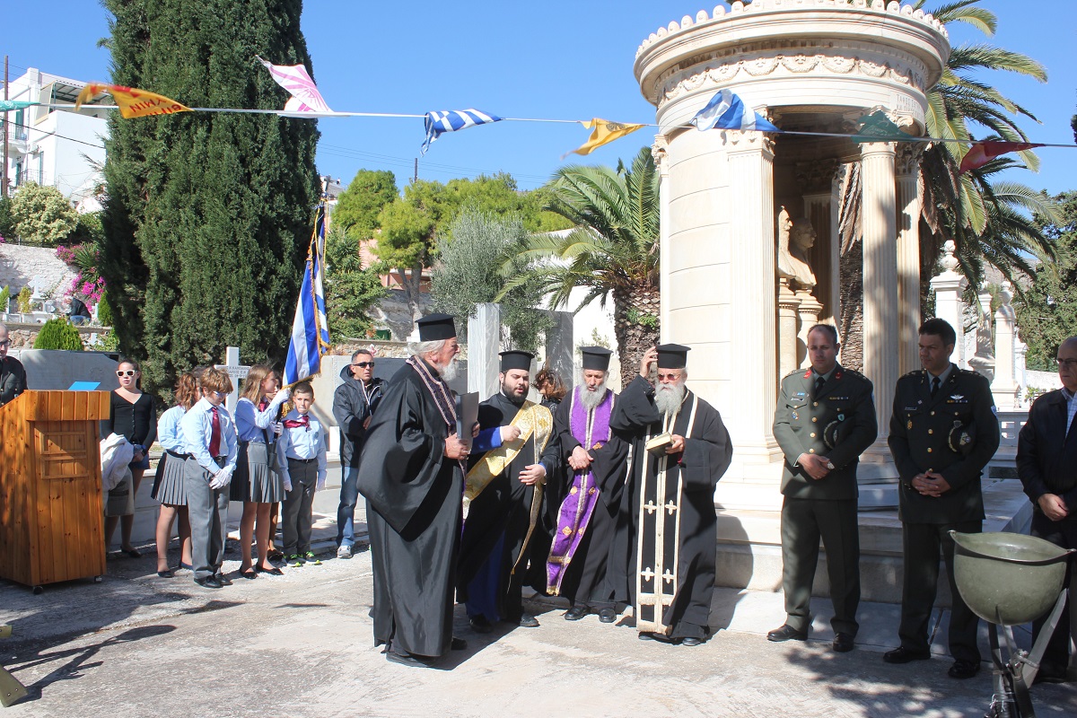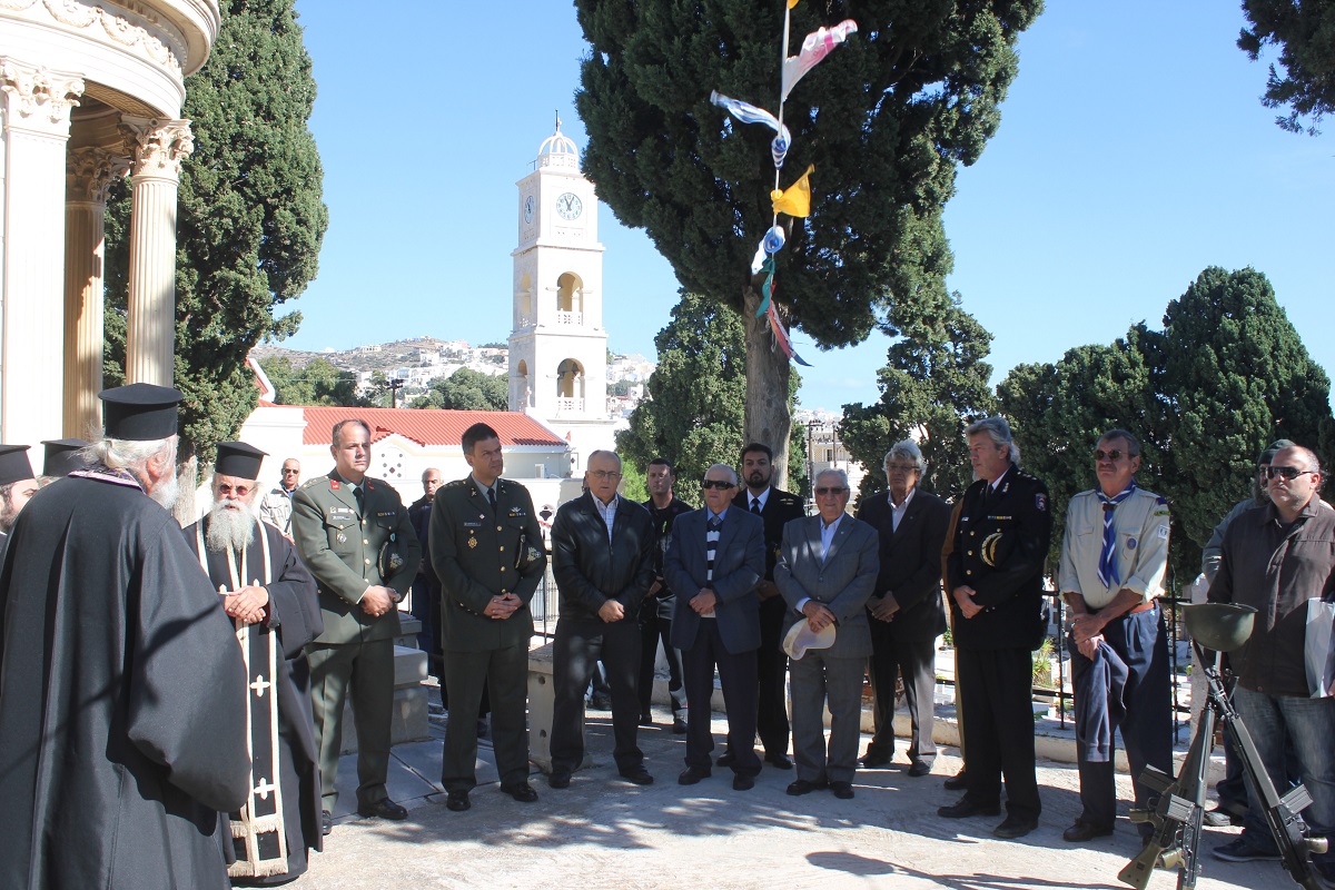 Η αυτοθυσία, η φιλοπατρία και η ανδρεία των αγωνιστών του τόπου μας ενάντια στις αξιώσεις των Ιταλών εξυμνήθηκε όπως κάθε χρόνο, παραμονή της Εθνικής Επετείου της 28ης Οκτωβρίου στο Κοιμητήριο του Ι.Ν. Αγίου Γεωργίου στην Ερμούπολη.
