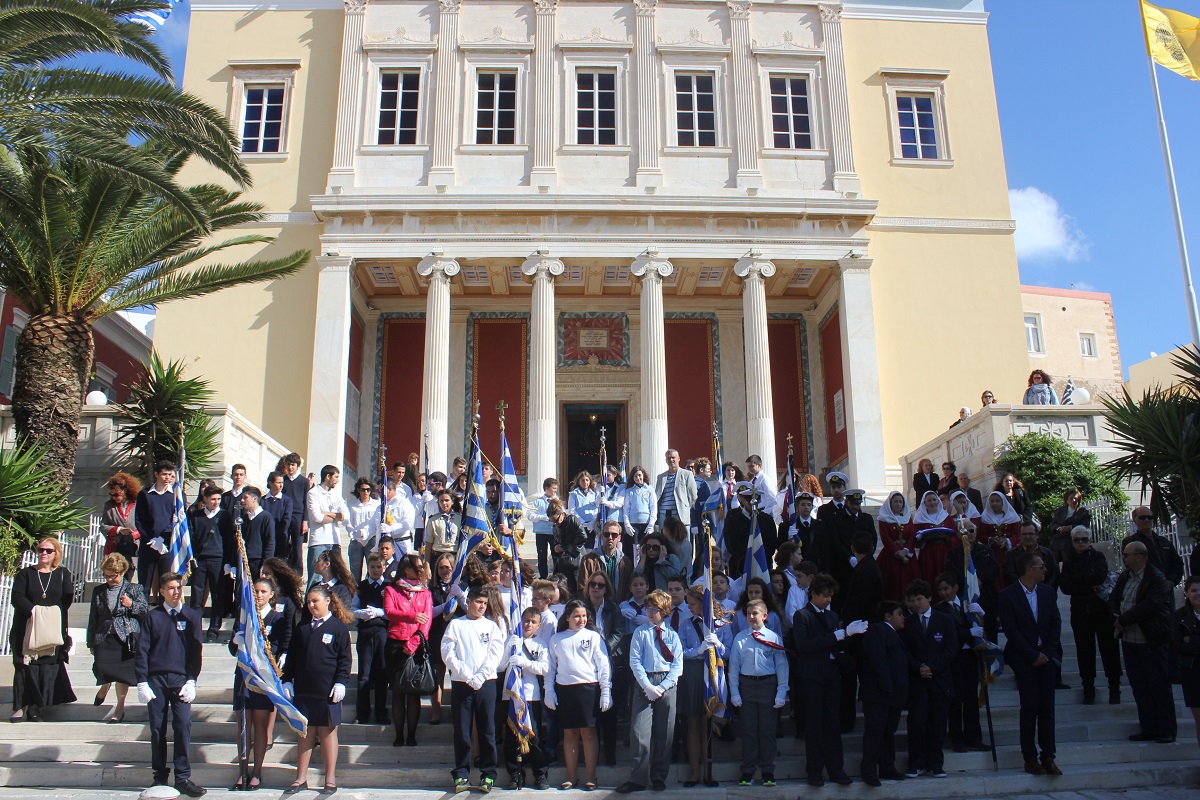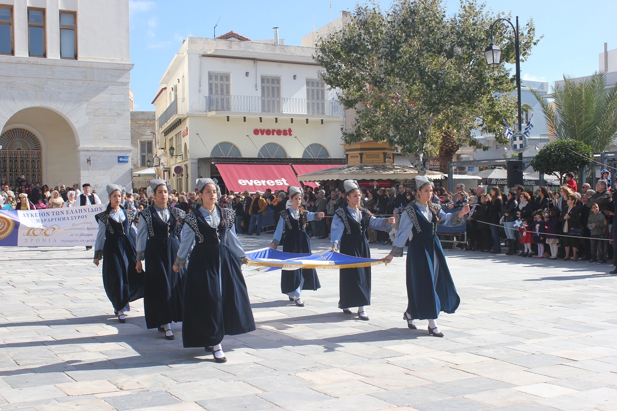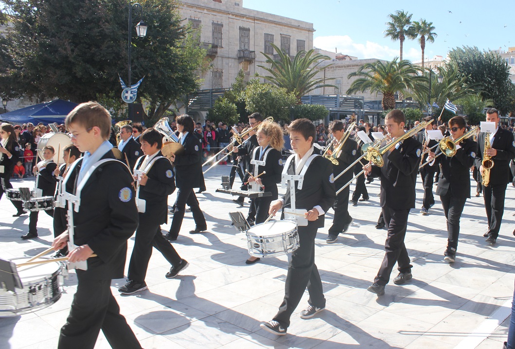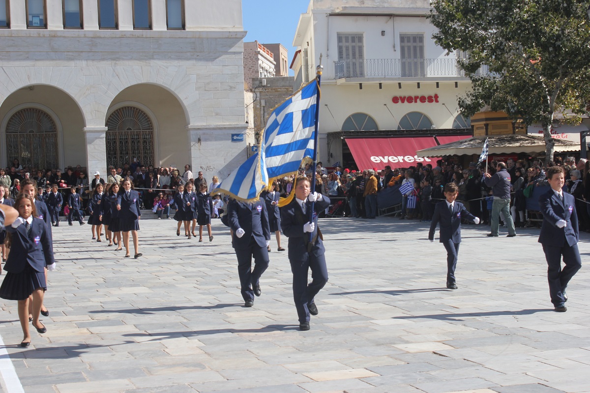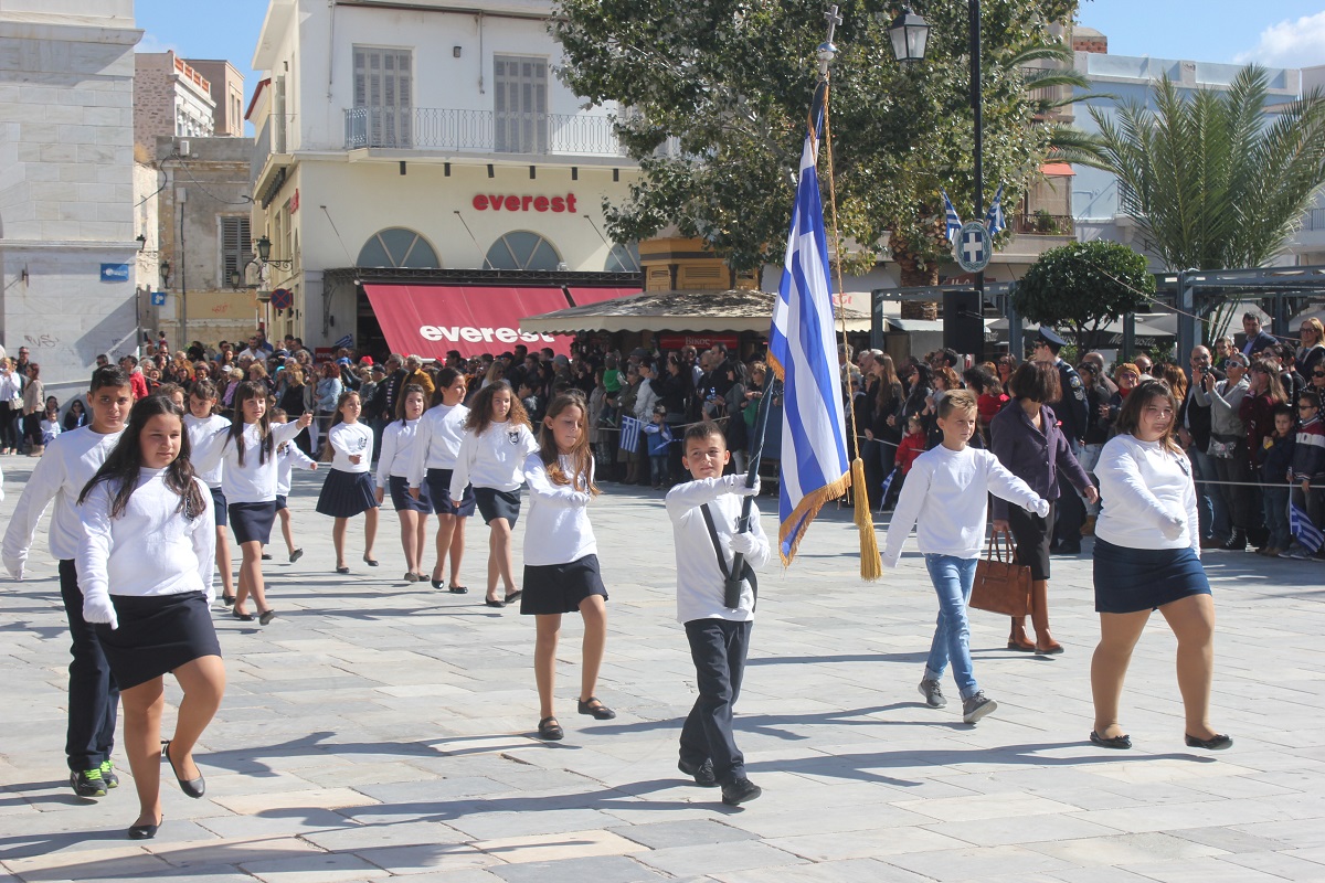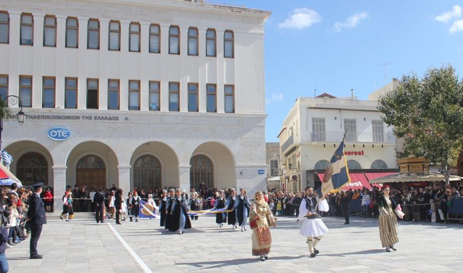 Στη συνέχεια πραγματοποιήθηκε η καθιερωμένη μαθητική παρέλαση στην πλατεία Μιαούλη, στην οποία συμμετείχαν επίσης η Φιλαρμονική του Δήμου Σύρου – Ερμούπολης, το Λύκειο Ελληνίδων Σύρου, ο Πολιτιστικός Σύλλογος Κρητών Σύρου, ο Σύλλογος Ποντίων και Βορειοελλαδιτών Σύρου ο Λαογραφικός Χορευτικός Όμιλος «η σοφία της παράδοσης», σπουδαστές της Ακαδημίας Εμπορικού Ναυτικού Σύρου, ο Ναυτικός Όμιλος Σύρου, ο Αθλητικός Σύλλογος Tae Kwon Do Ερμούπολης και το Σώμα Ελλήνων Προσκόπων.