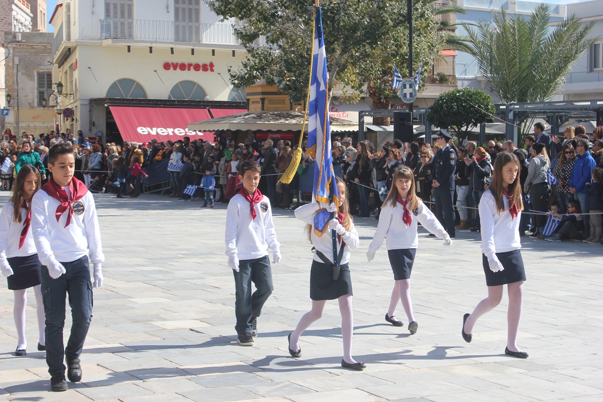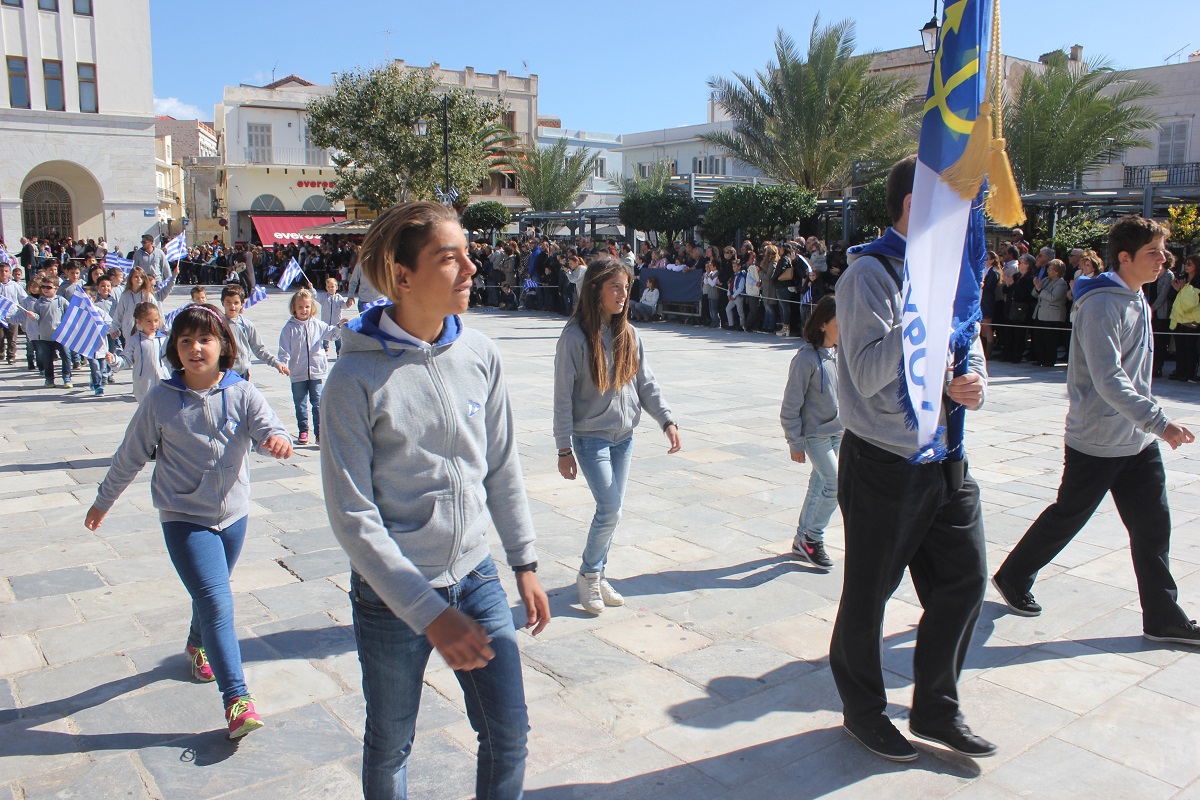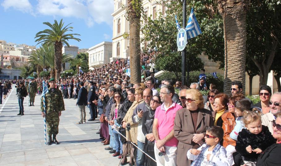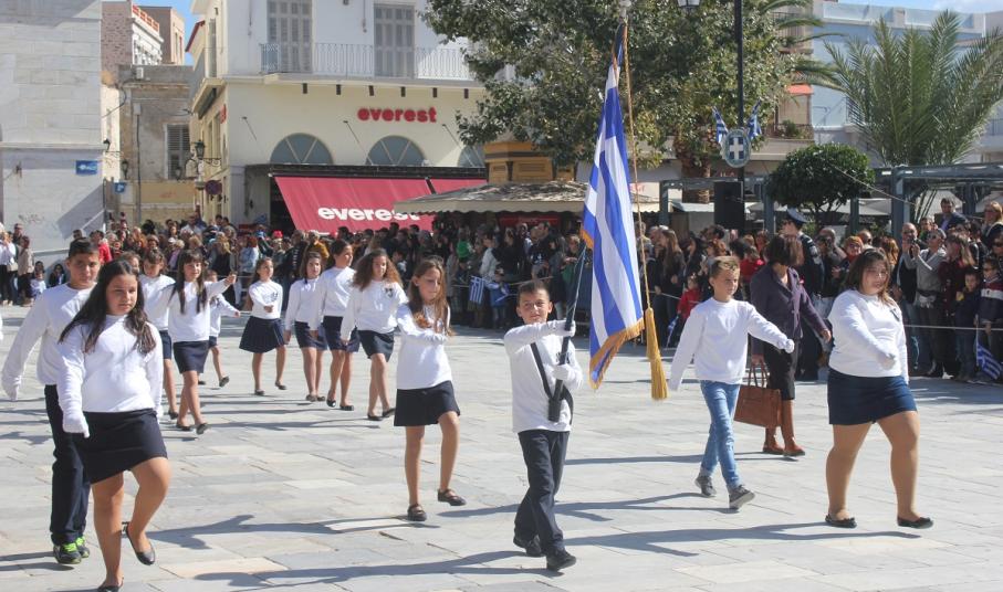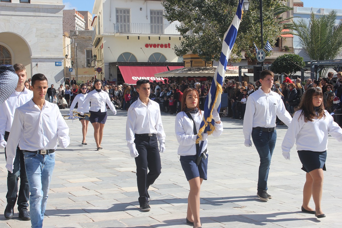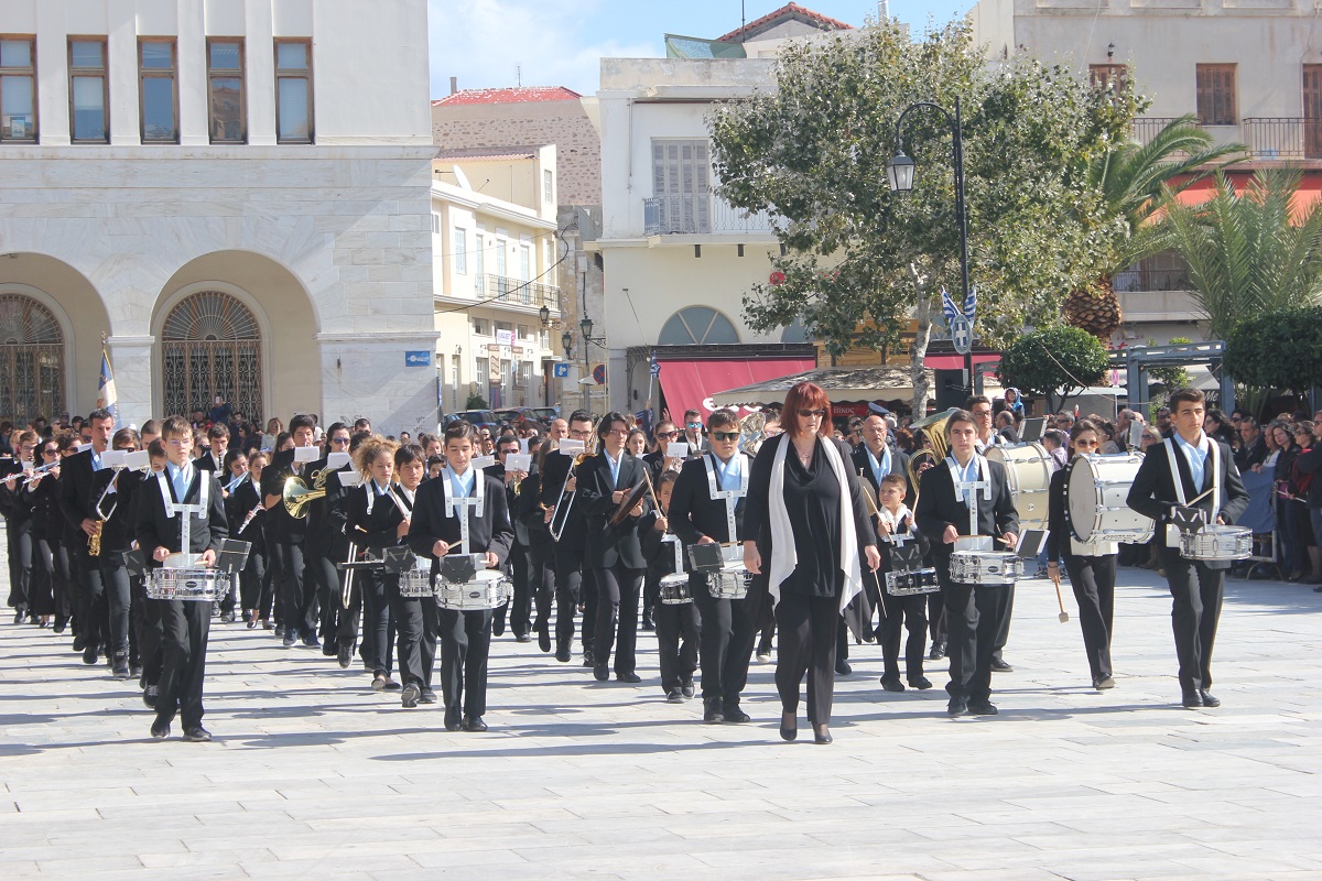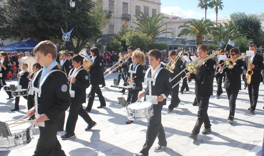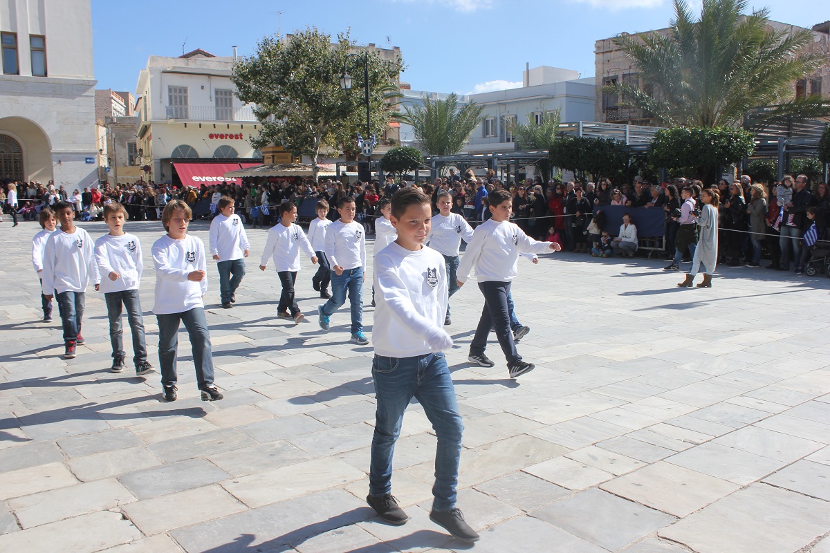 Στη συνέχεια πραγματοποιήθηκε η καθιερωμένη μαθητική παρέλαση στην πλατεία Μιαούλη, στην οποία συμμετείχαν επίσης η Φιλαρμονική του Δήμου Σύρου – Ερμούπολης, το Λύκειο Ελληνίδων Σύρου, ο Πολιτιστικός Σύλλογος Κρητών Σύρου, ο Σύλλογος Ποντίων και Βορειοελλαδιτών Σύρου ο Λαογραφικός Χορευτικός Όμιλος «η σοφία της παράδοσης», σπουδαστές της Ακαδημίας Εμπορικού Ναυτικού Σύρου, ο Ναυτικός Όμιλος Σύρου, ο Αθλητικός Σύλλογος Tae Kwon Do Ερμούπολης και το Σώμα Ελλήνων Προσκόπων.