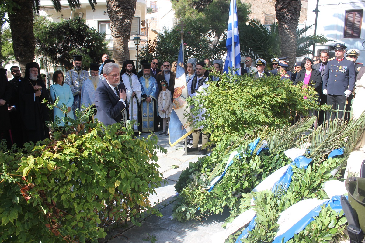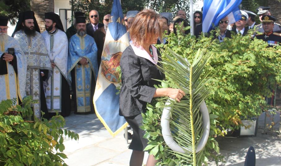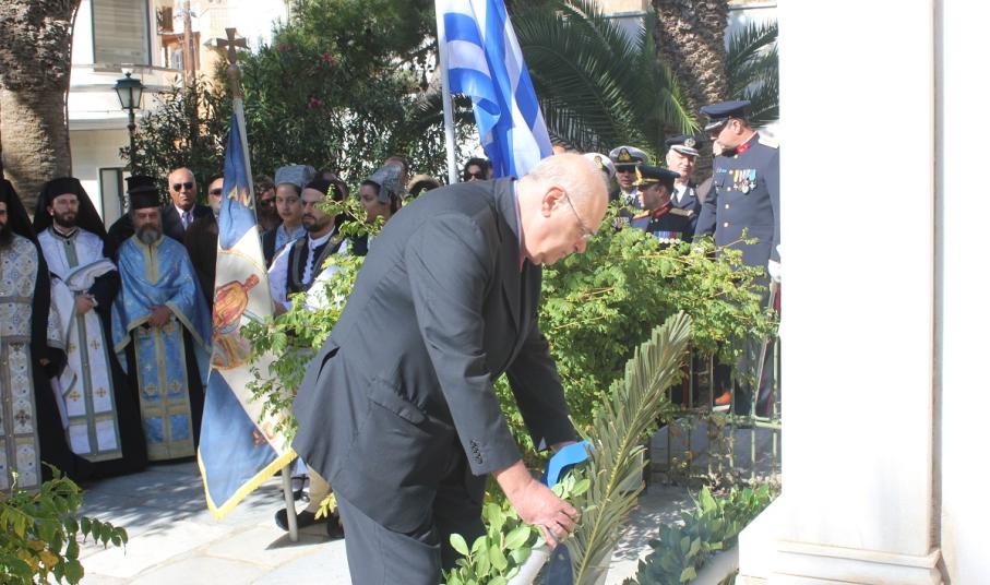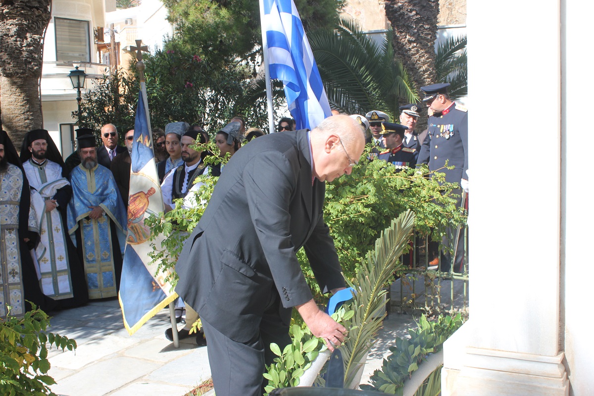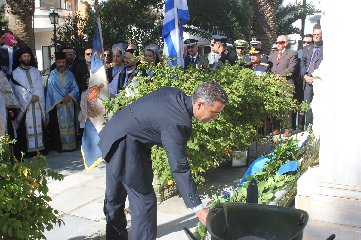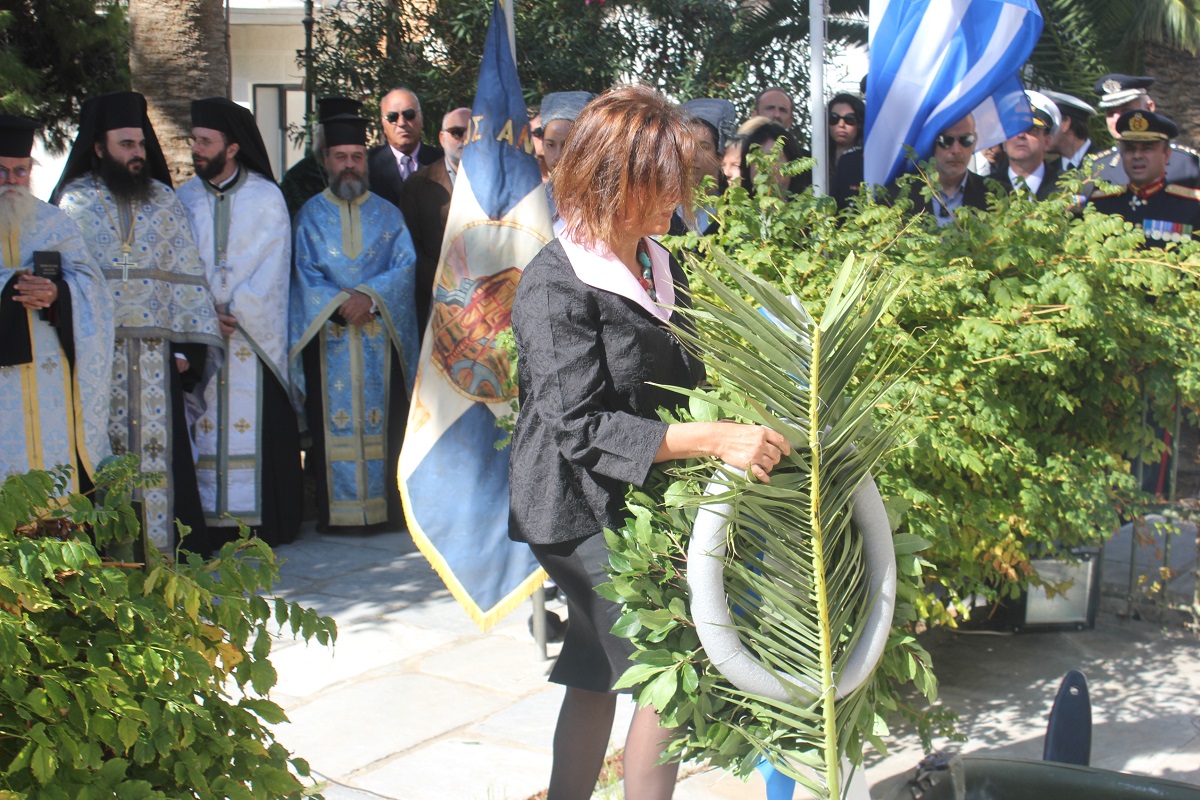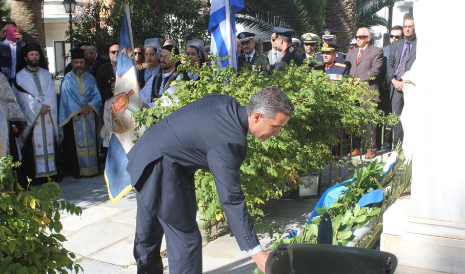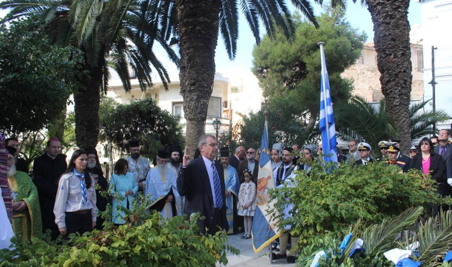 Μετά το πέρας της Δοξολογίας, εκφωνήθηκε ο Πανηγυρικός της Ημέρας από τη Διοικητική Υπάλληλο της Διεύθυνσης Πρωτοβάθμιας Εκπαίδευσης Κυκλάδων κ. Αναστασία Μπούρδου. Αμέσως μετά, τελέστηκε επιμνημόσυνη δέηση στο Εθνικό Ηρώο της πόλης και κατάθεση στεφάνων από τους εκπροσώπους των τοπικών φορέων.