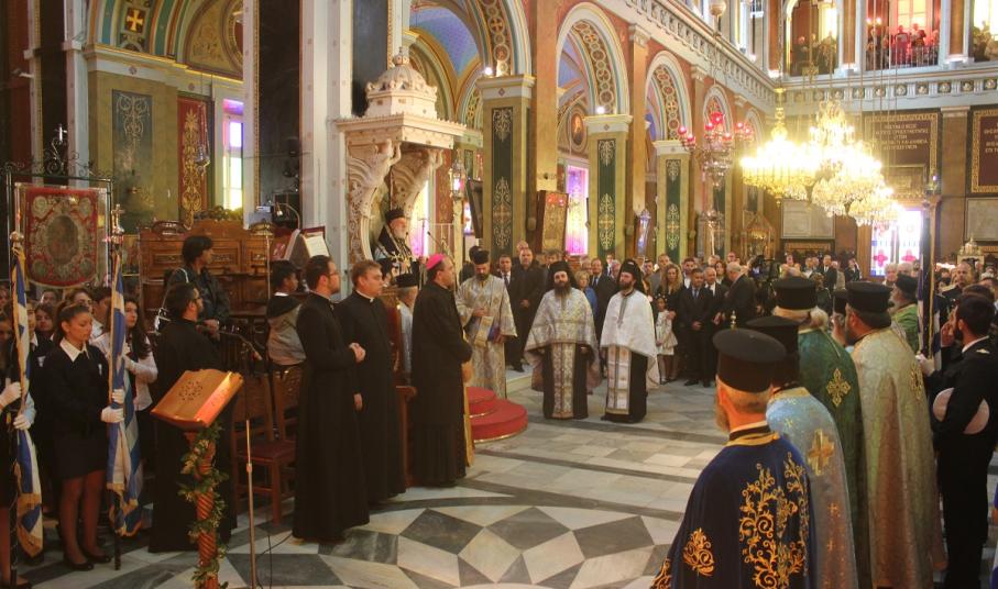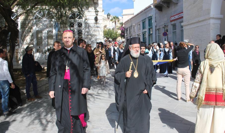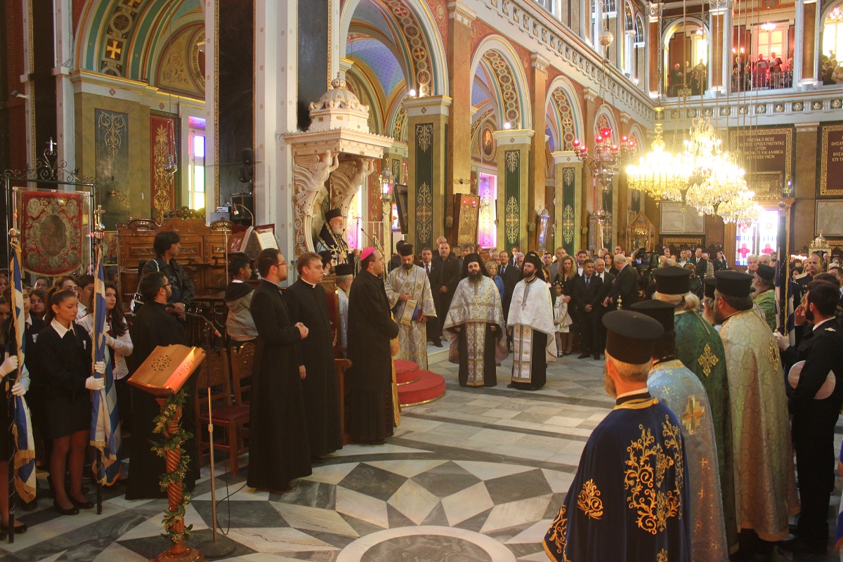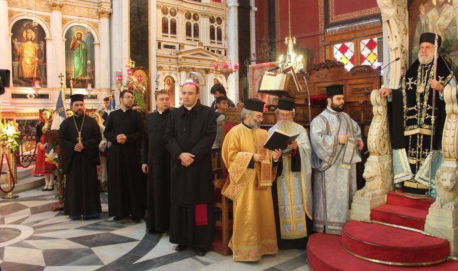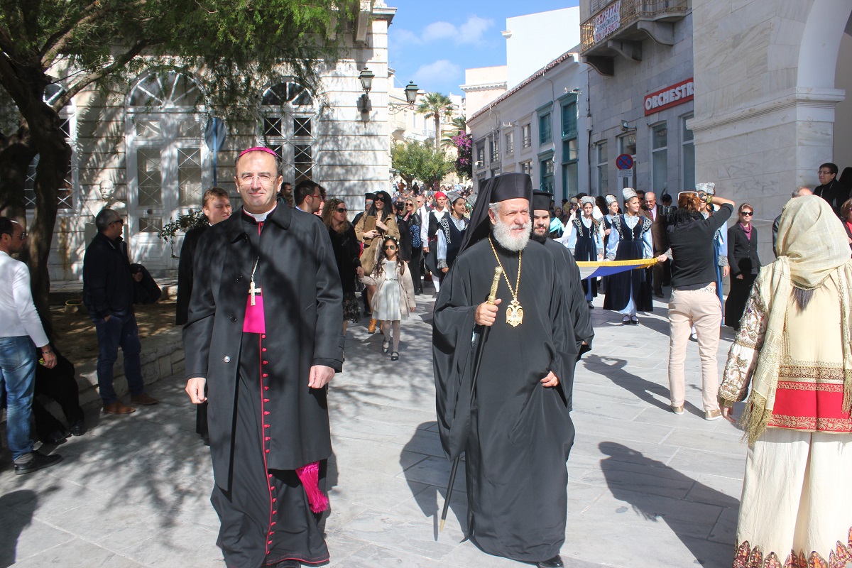 Παρουσία του Καθολικού Επισκόπου Σύρου Σεβ. π. Πέτρου Στεφάνου, της Υφυπουργού Εργασίας κ. Ράνιας Αντωνοπούλου, των Βουλευτών Κυκλάδων Αντώνη Συρίγου και Νίκου Συρμαλένιου, , του Δημάρχου Σύρου – Ερμούπολης Γιώργου Μαραγκού, εκπροσώπων της τοπικής αυτοδιοίκησης, της εκπαίδευσης, συλλόγων και σωματείων του νησιού, τελέστηκε σήμερα το πρωί επίσημη Δοξολογία στον Ιερό Ναό του Αγίου Νικολάου, χοροστατούντος του Σεβασμιωτάτου Μητροπολίτη Σύρου κ. Δωροθέου Β’.