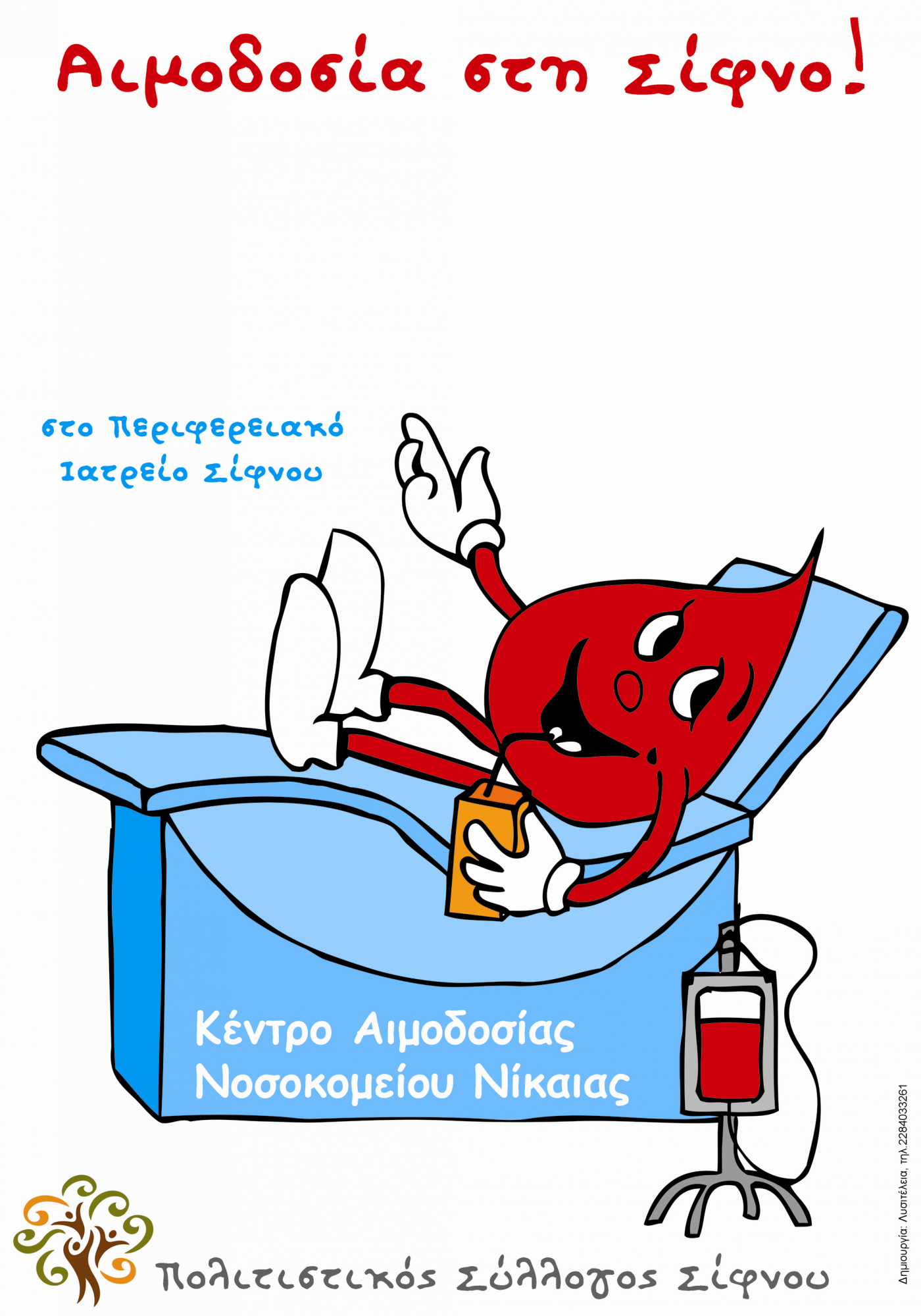 Ο Πολιτιστικός Σύλλογος Σίφνου και το Κέντρο Αιμοδοσίας του Νοσοκομείου Νίκαιας, σε συνεργασία με το Περιφερειακό Ιατρείο Σίφνου, σε καλούν να γίνεις για ακόμα μια φορά μέτοχος της χαράς και της ικανοποίησης που δίνει η εθελοντική αιμοδοσία.
