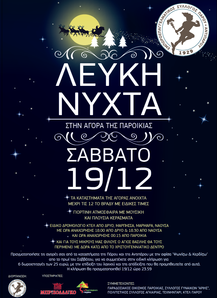 Με την υποστήριξη κατά κύριο λόγο του εμπορικού κόσμου θα πραγματοποιηθεί και φέτος η Λευκή Νύχτα στην Πάρο στις 19 Δεκεμβρίου.