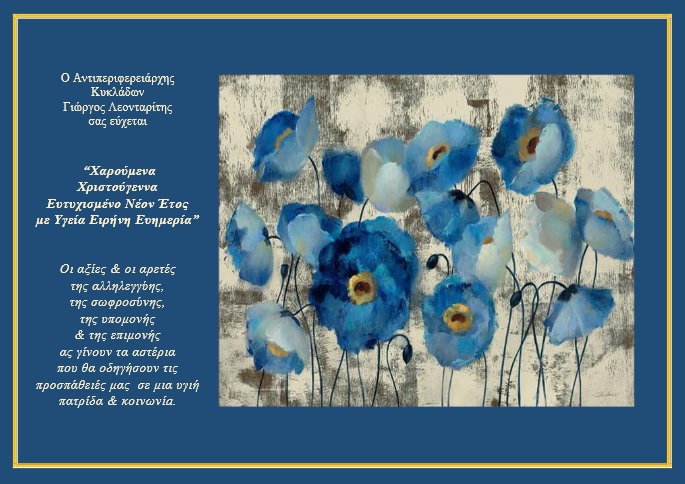 Ο Αντιπεριφερειάρχης Κυκλάδων Γιώργος Λεονταρίτης σας εύχεται “Χαρούμενα Χριστούγεννα Ευτυχισμένο Νέον Έτος με Υγεία, Ειρήνη, Ευημερία”.