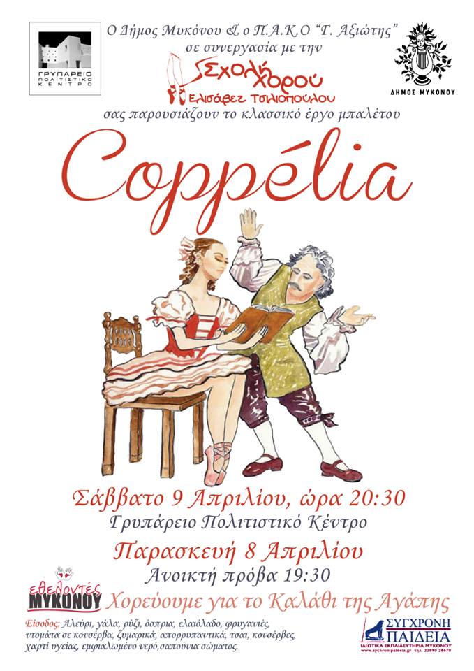 Σήμερα Σάββατο 9 Απριλίου 2016 στις 20:30, στο Γρυπάρειο Πολιτιστικό Κέντρο η Σχολή της Ελισάβετ Τσιλιοπούλου θα παρουσιάσει το κλασσικό έργο μπαλέτου COPPELIA.