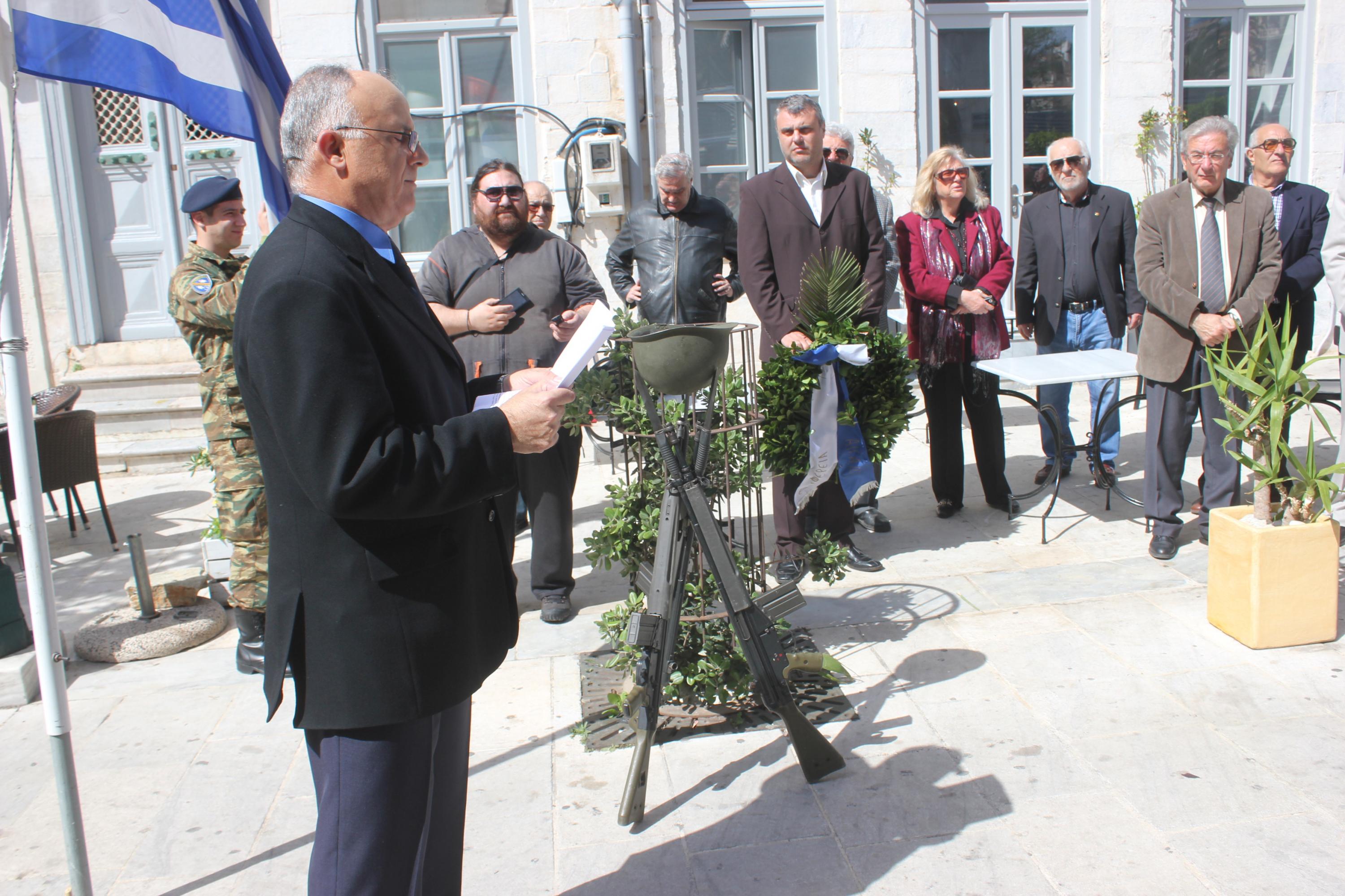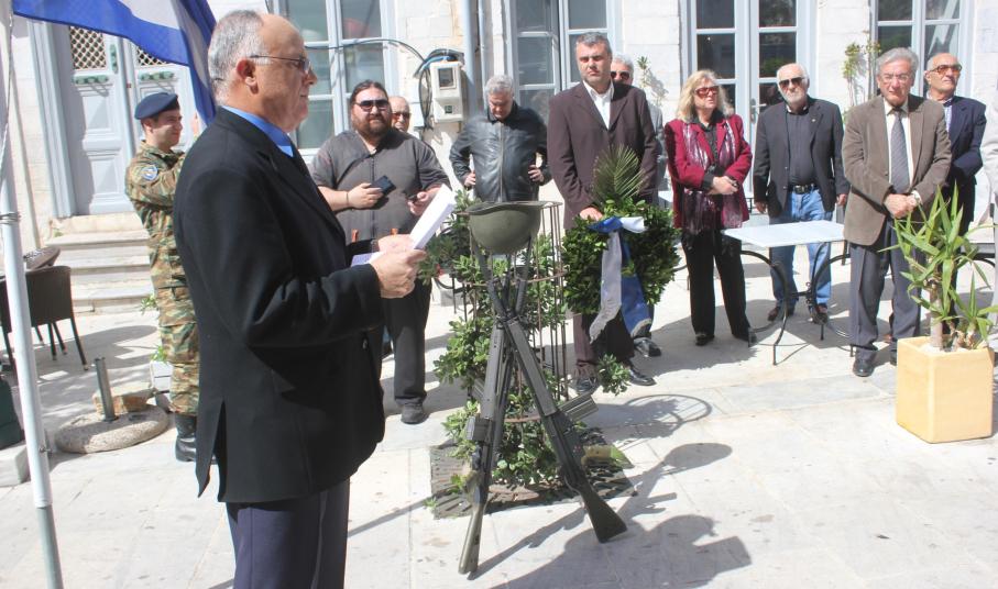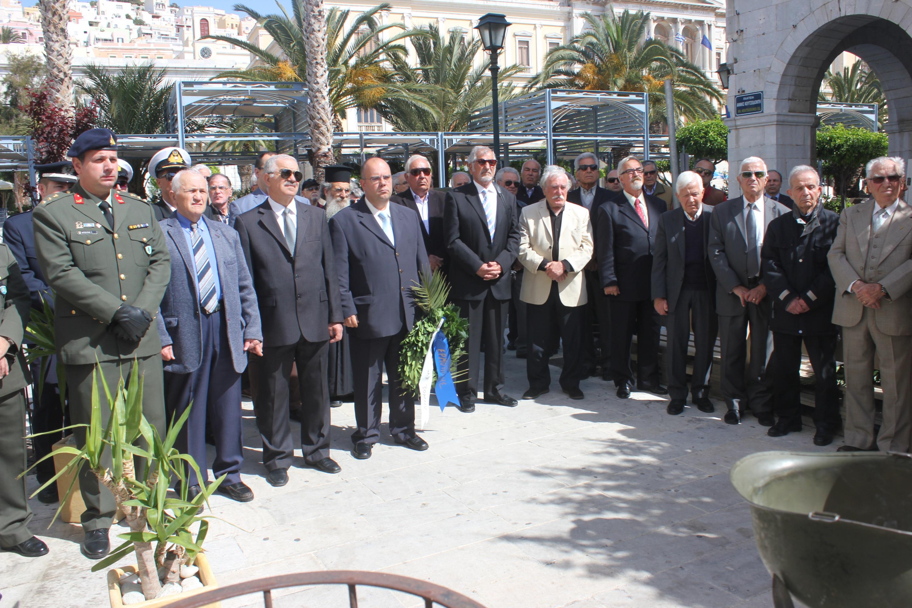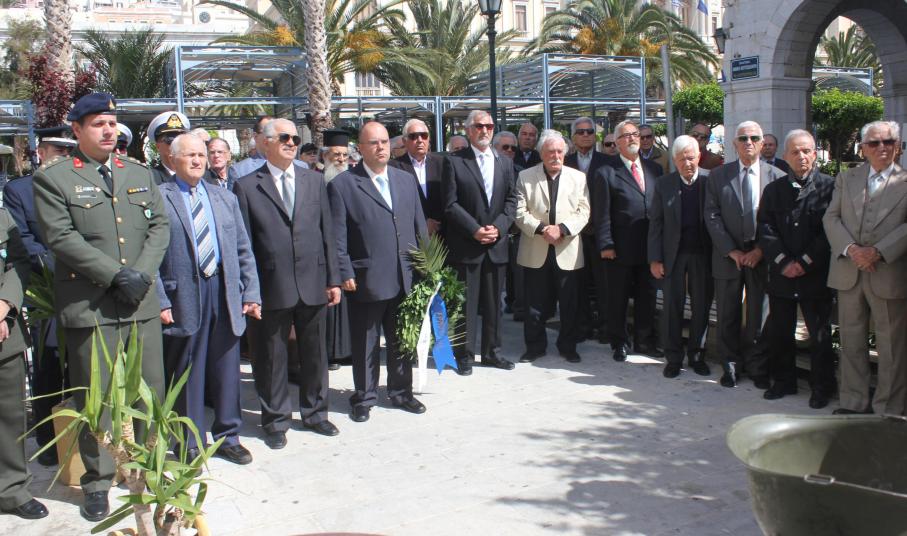 Την αυτοθυσία και την αυταπάρνηση όλων εκείνων που έχασαν τη ζωή τους στον αγώνα, τίμησε και φέτος, η κοινωνία της Σύρου. Στο πλαίσιο αυτό, κατατέθηκαν στεφάνια από τον εκπρόσωπο της Περιφέρειας Νοτίου Αιγαίου Μάρκο Δαδάο, τον Ανώτερο Διοικητή Φρουράς Σύρου, τον Αντιδήμαρχο Σύρου – Ερμούπολης Αλέξη Αθανασίου, τον πρόεδρο του παραρτήματος Ν. Κυκλάδων της Ένωσης Αποστράτων Αξιωματικών Στρατού και τον εκπρόσωπο του Συνδέσμου Εφέδρων Αξιωματικών.