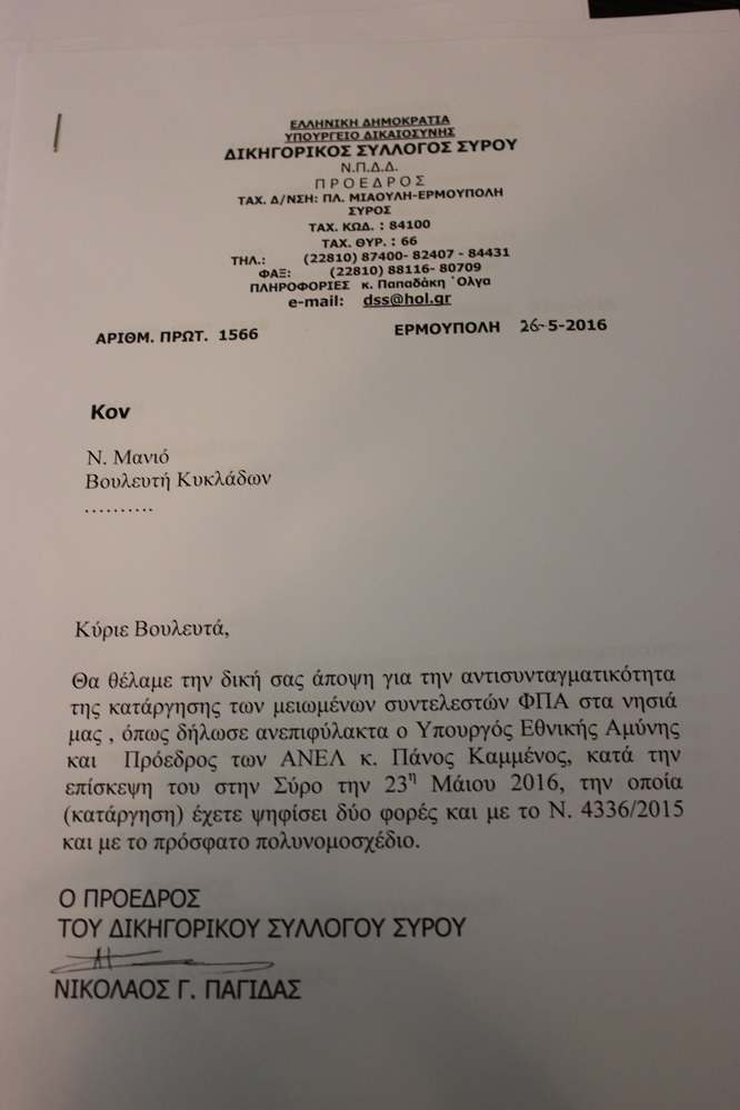 Προτεραιότητα για τον Δικηγορικό Σύλλογο Σύρου ο νησιώτικος ΦΠΑ