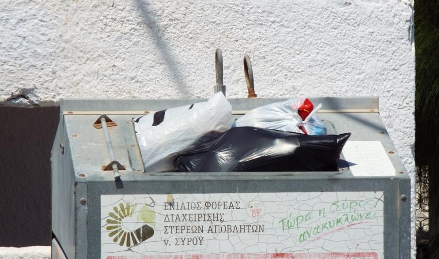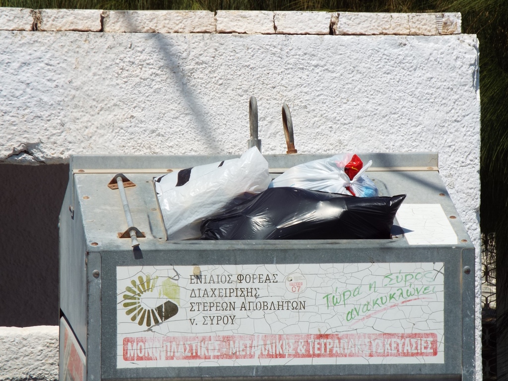 Παράλληλα, ακόμη και οι συμβατικοί πράσινοι κάδοι, βρίσκονται γεμάτοι ως πάνω, ωστόσο, η συλλογή τους πραγματοποιείται απρόσκοπτα από τους υπαλλήλους της Υπηρεσίας Καθαριότητας του Δήμου Σύρου-Ερμούπολης.