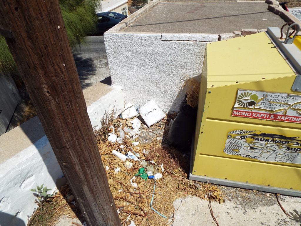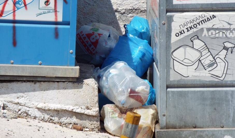 Οι κάδοι ανακύκλωσης στο συγκεκριμένο σημείο βρίσκονται γεμάτοι έως και υπερχειλισμένοι, με τσάντες και σακούλες σκουπιδιών, οι οποίες δεν φαίνεται να περιέχουν μόνο τα επιτρεπόμενα υλικά (αλουμίνιο, γυαλί, χαρτί, πλαστικό), με αποτέλεσμα τα σύμμεικτα απορρίμματα να ζεσταίνονται από τον ήλιο και να μυρίζουν, αφού η συλλογή των ανακυκλώσιμων, δεν πραγματοποιείται τόσο συχνά, όσο των σύμμεικτων.