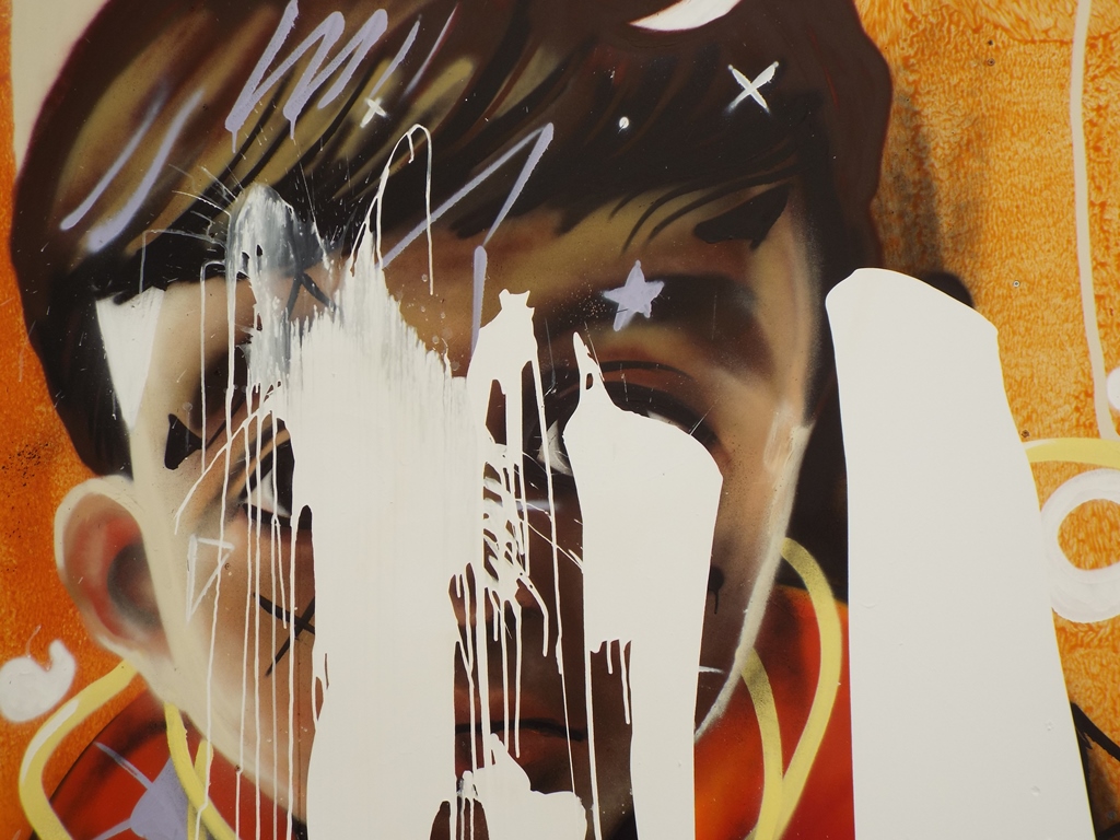 Στο γκράφιτι, το οποίο σημειωτέον, ζωγραφίστηκε σε ξύλο και όχι σε κάποια επιφάνεια τοίχου και είχε τοποθετηθεί έναντι της εισόδου του Αρχαιολογικού Μουσείου Ερμούπολης, προκειμένου να είναι ανοιχτό στο κοινό και μετά το πέρας της διοργάνωσης, απεικονιζόταν το πρόσωπο ενός προσφυγόπουλου, σημαδεμένο από την οδύσσεια του πολέμου και των αλλεπάλληλων κακουχιών.