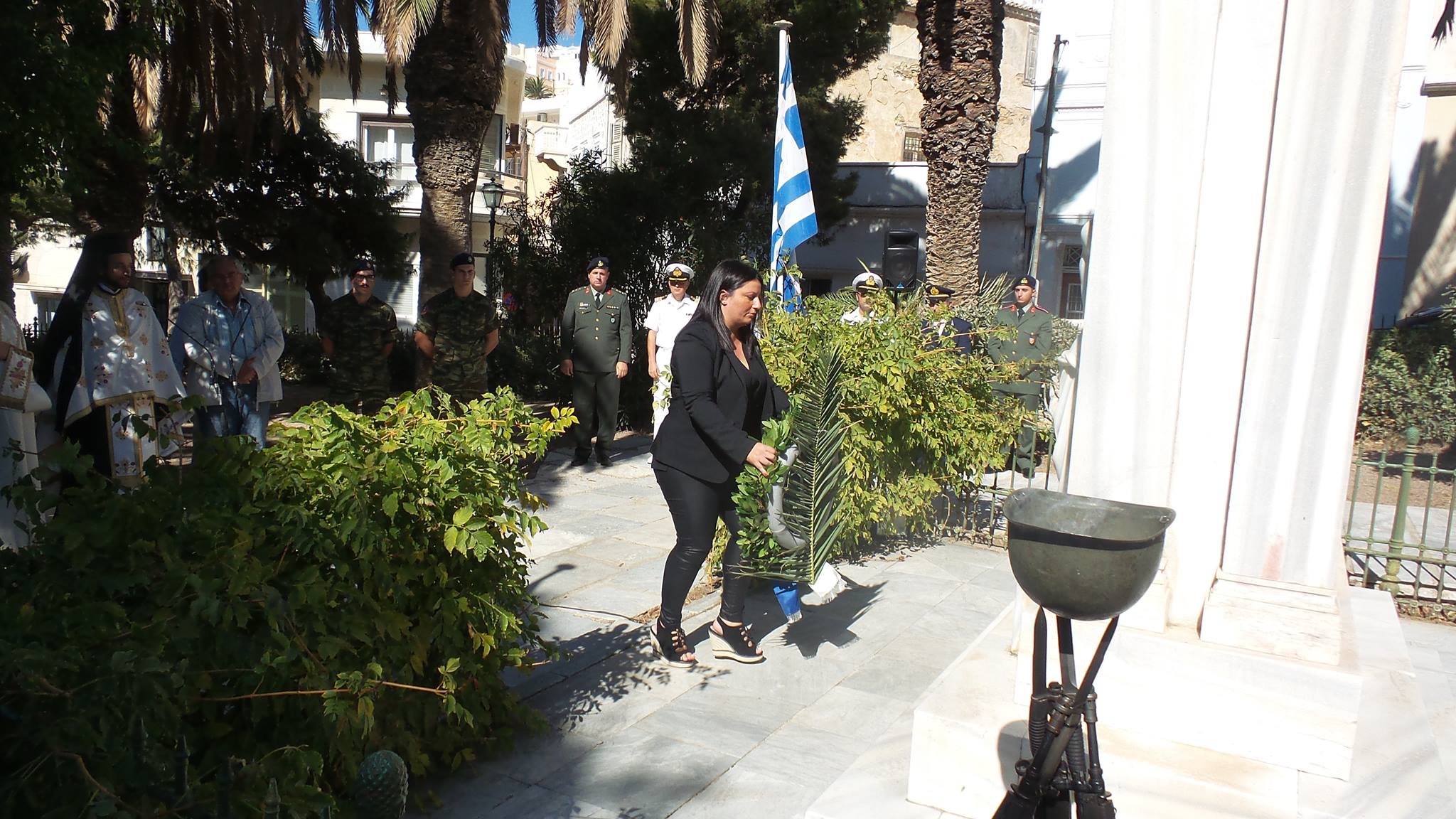 Μετά το πέρας της ομιλίας, ακολούθησε Επιμνημόσυνη Δέηση στο Εθνικό Ηρώο της πόλης και κατάθεση στεφάνων από τους εκπροσώπους της Περιφέρειας, του Δήμου, των σωμάτων ασφαλείας και λοιπών φορέων του νησιού.