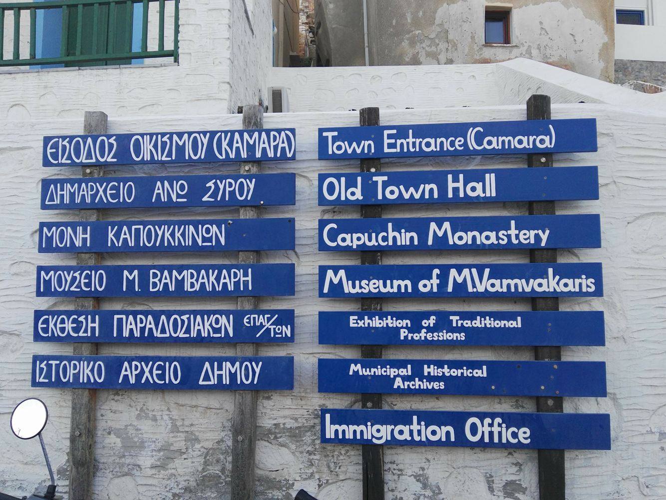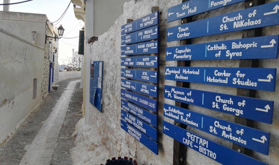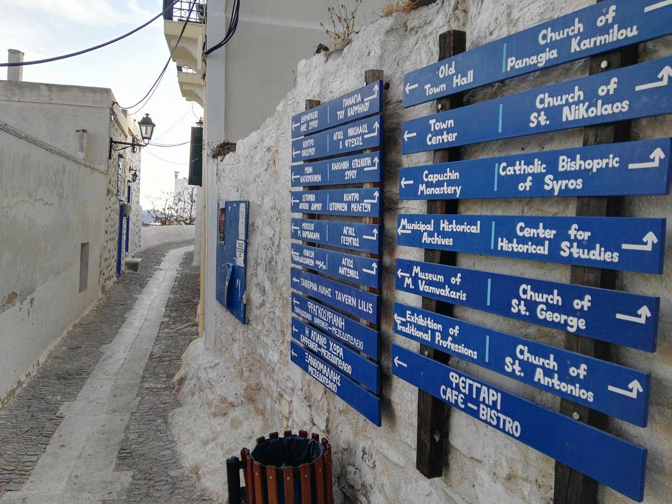 Δεδομένου, ότι ο μεσαιωνικός οικισμός της Άνω Σύρου αποτελεί μία περιοχή, που βρίθει επισκεψιμότητας κατά τη διάρκεια του καλοκαιριού, η ενημέρωση των επισκεπτών, αλλά και των ντόπιων, οι οποίοι συχνά δεν γνωρίζουν καλά τα «κατατόπια» της «ακρόπολης» του νησιού, με τα δεκάδες στενά, κρίνεται απαραίτητη. Ως εκ τούτου, αρκετές νέες μπλε ξύλινες πινακίδες, διατηρώντας το παραδοσιακό στοιχείο, έχουν τοποθετηθεί, οι οποίες ωστόσο, έρχονται σε αντίθεση με άλλες, παλαιότερες πινακίδες, οι οποίες έχουν τοποθετηθεί τα προηγούμενα χρόνια και δεν έχουν συντηρηθεί από τότε.