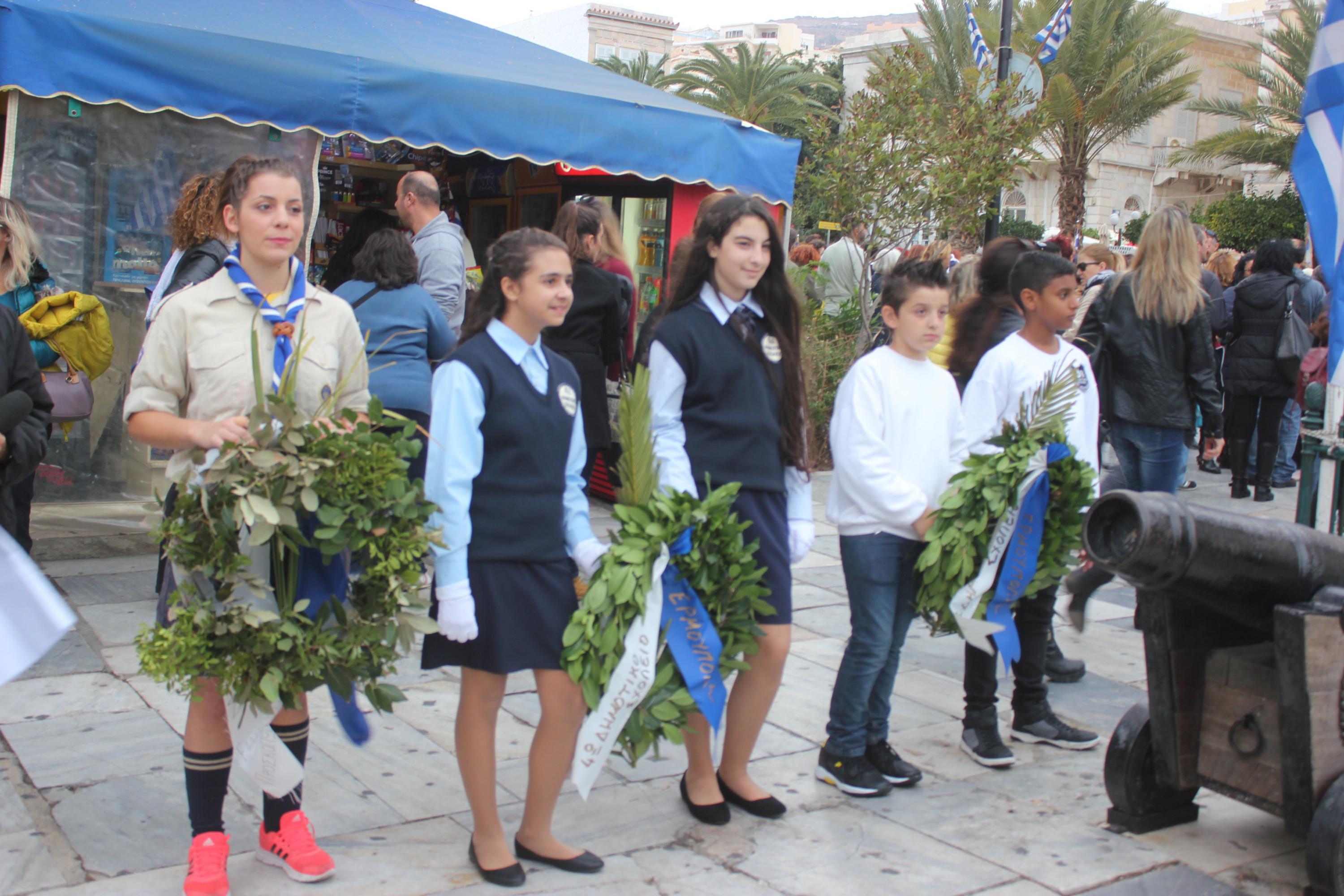 Στο Ηρώο Πεσόντων, στέφανα κατέθεσαν οι μαθητές του του 5ου Δημοτικού Σχολείου Ερμούπολης, του 3ου Γυμνασίου Σύρου, ΕΠΑΛ Σύρου, του Εσπερινού ΕΠΑΛ Σύρου και οι σπουδαστές και οι σπουδάστριες της ΕΠΑΣ Βοηθών Νοσηλευτών του Γενικού Νοσοκομείου Σύρου.