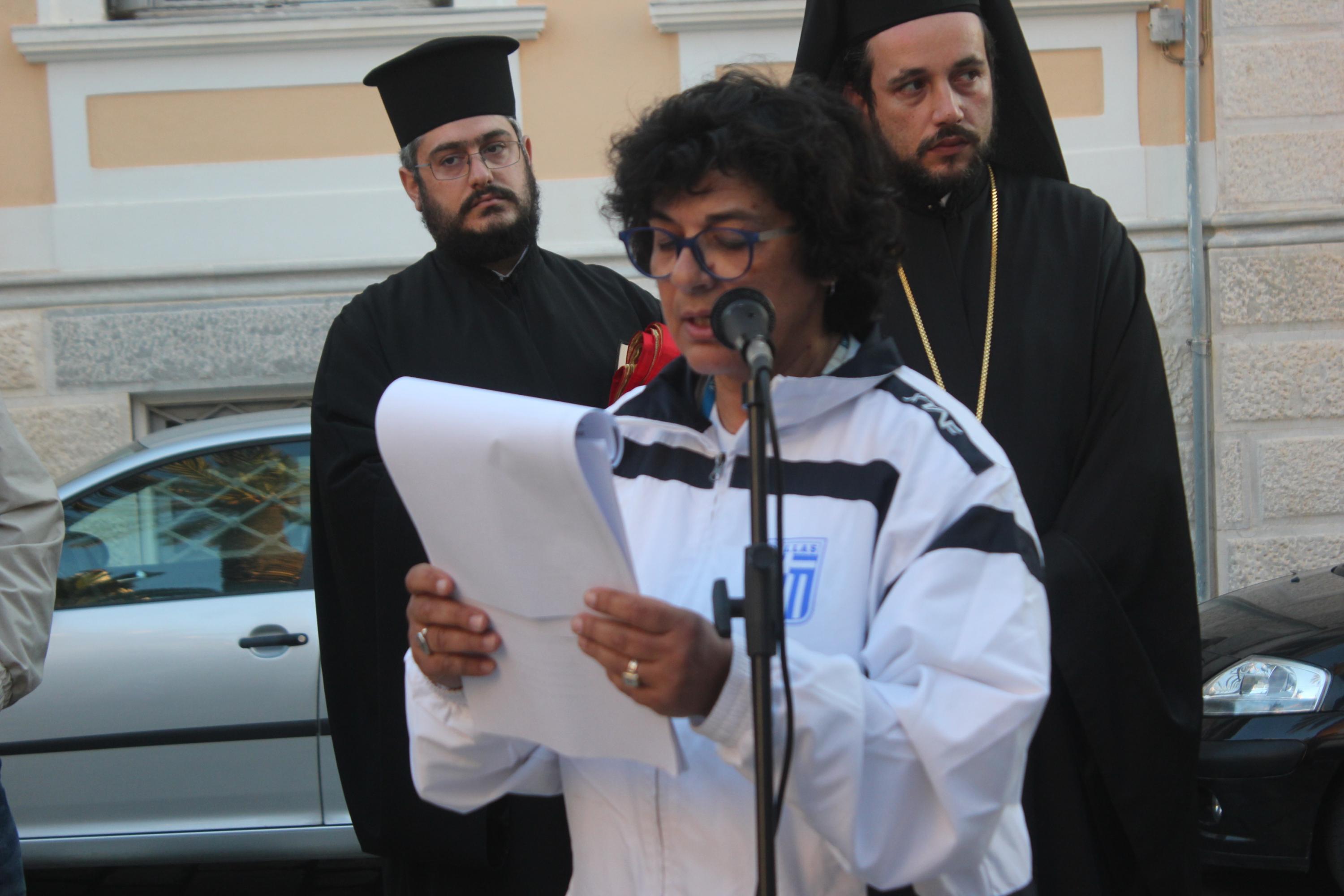 «Σε τούτο εδώ τον τόπο τον μέγα, το μικρό, έχουν μάθει από χρόνια οι υπηρέτες να υπηρετούνται και όλοι μαζί να τους προσκυνούνε. Μιλούν χωρίς να ακούν, χαιρετούν δίχως να βλέπουν, πράττοντας πάντα κατά τις υποδείξεις. Κι εμείς οι άλλοι οι μικροί μάθαμε να σιωπούμε, μα μη ξεχνούμε πως η ιστορία γράφεται με πράξεις, θυσίες και όχι με λόγια, μόνο με αγώνες. Πολλές φορές με αίμα. Έτσι γεννιούνται μνήμες, αυτή την προίκα και κληρονομιά αφήνουμε εις τους αιώνες. Ας μάθουμε λοιπόν στους νέους να παλεύουν όχι μόνο για το βόλεμα, για την πατρίδα μόνο κι αυτή η έρημη πατρίδα χάνεται γιατί δεν την υπηρετούμε, δεν μας αξίζει, την πουλάμε και μόνοι μας λογομαχούμε. Αντίσταση πρέπει να μάθουμε στους νέους, στα παιδιά μας, και όχι να περπατούν σκυφτά και ντροπιασμένα, αλλά μόνο καμαρωτά, υπερήφανα, καθώς θα το αξίζουν» σημείωσε στον λόγο της η κ. Λακαταμίτου.