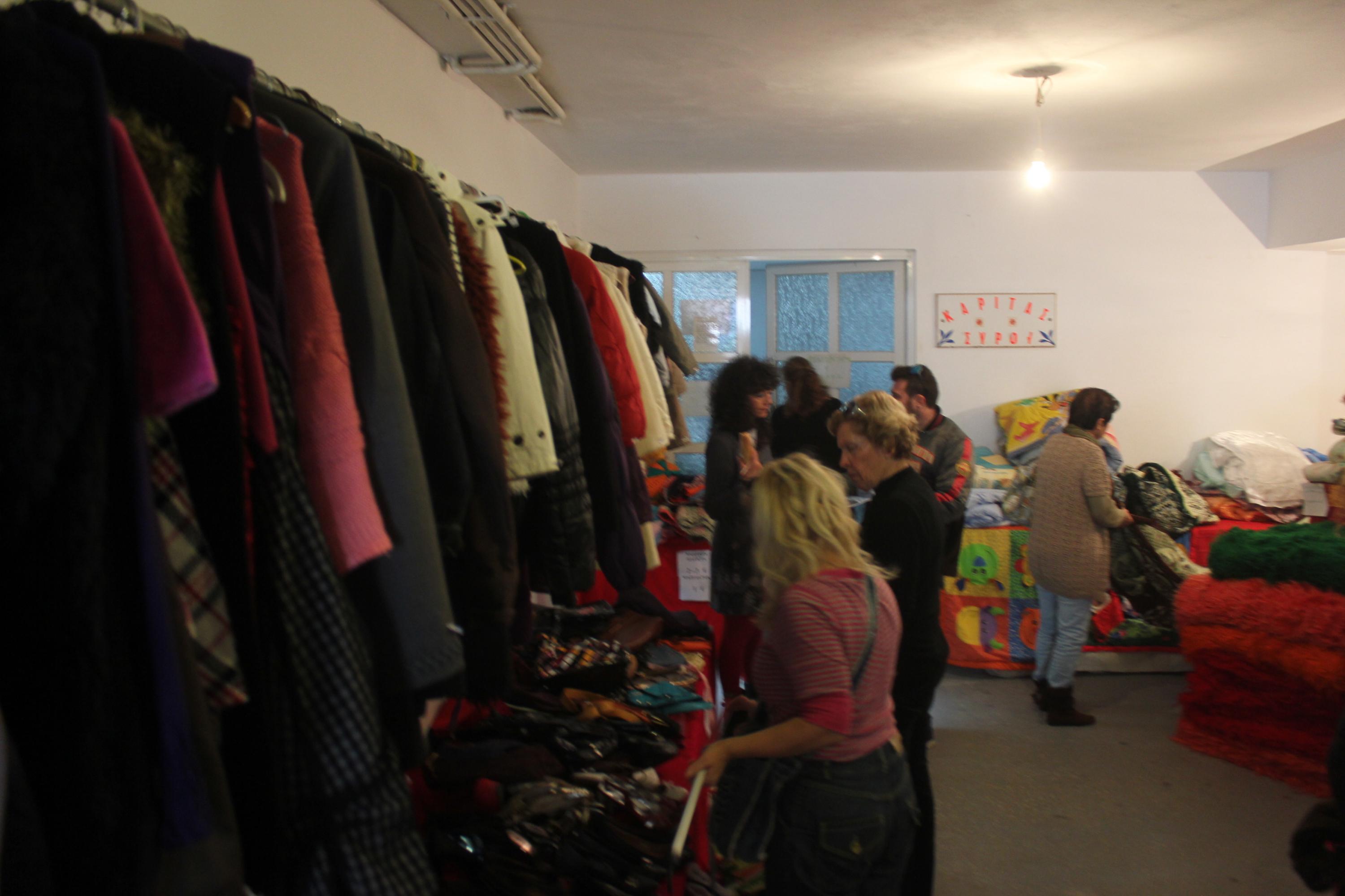 «Πέρα από τις ανάγκες που συνεχώς αυξάνονται, αυτό που μας κάνει περισσότερη εντύπωση είναι ο αριθμός των ενδυμάτων που έχουν συγκεντρωθεί», τονίζει η ταμίας της Κάριτας Σύρου κ. Γεωργίου Βουτσίνου. «Δεν προλαβαίνουμε να ξεδιαλέγουμε ρούχα. Πιστεύαμε ότι λόγω κρίσης, αυτά θα μειωθούν κι όμως, έχουμε φτάσει στο σημείο να στέλνουμε ρούχα και στην Αθήνα. Είμαστε πολύ ικανοποιημένοι. Επιλέγουμε για το παζάρι εκείνα που είναι σε καλύτερη κατάσταση και τα υπόλοιπα δίνονται δωρεάν τις Τετάρτες, όπου ο κόσμος έρχεται εδώ και με συμμετοχή ενός ευρώ γεμίζει μία τσάντα».
