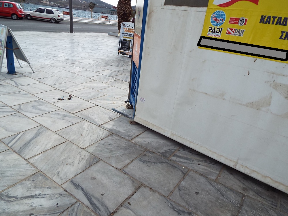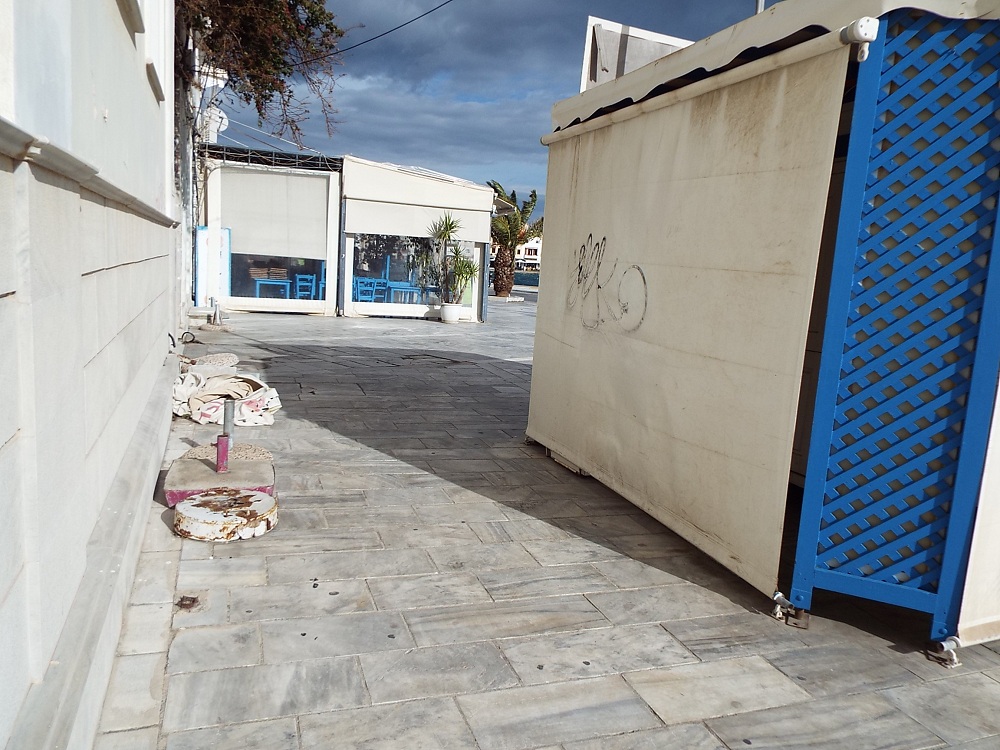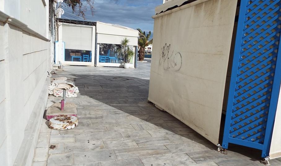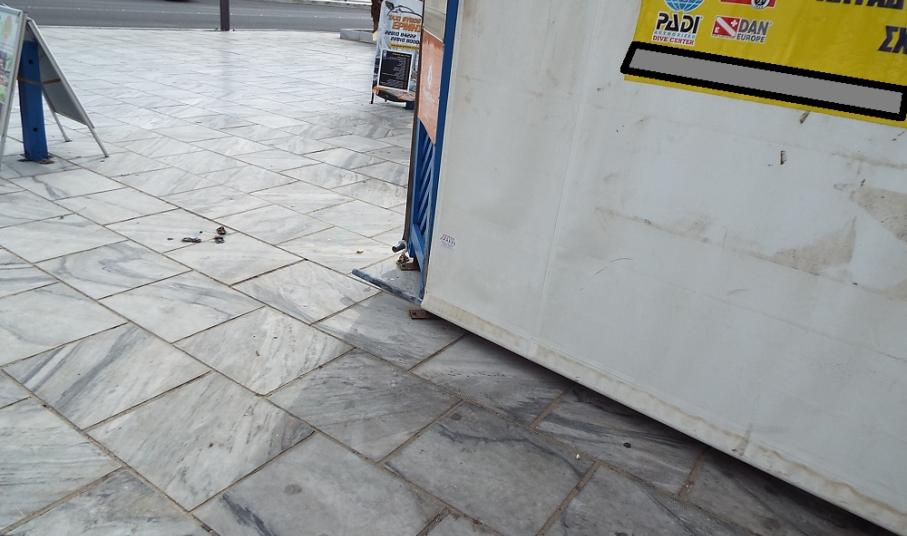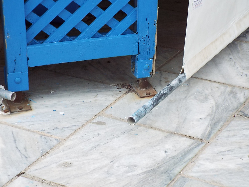 Παράλληλα, λόγω των ανέμων, μία εκ των σιδερένιων δοκών, που χρησιμεύουν για τη σταθεροποίηση των προστατευτικών πανιών, έχει ξεφύγει από το σημείο στήριξης, που τη συγκρατεί σταθερή, με αποτέλεσμα, να παρασύρεται από τον άνεμο, αφήνοντας εκτεθειμένο το περίπτερο, αλλά και να αποτελεί πιθανό κίνδυνο, στην περίπτωση που κάποιος περαστικός διέρχεται πλησίον του περιπτέρου.