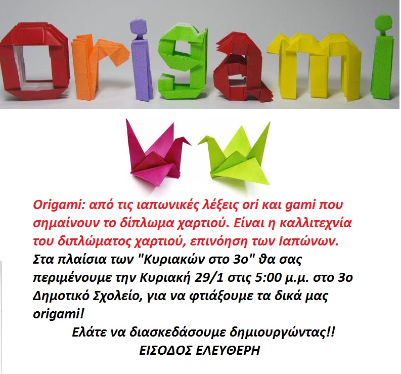 “Με χαρά σας προσκαλούμε την Κυριακή 29 Ιανουαρίου, στις 5 το απόγευμα στο χώρο του 3ου Δημοτικού Σχολείου & Νηπιαγωγείου Ερμούπολης (στο Βροντάδο, Τρεις Ιεράρχες), όπου στο πλαίσιο των δράσεων "Κυριακές στο 3ο", θα πραγματοποιηθεί Εργαστήρι Κατασκευών, με την τεχνική Origami.