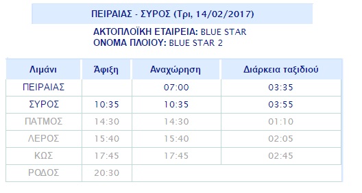 Συγκεκριμένα, το Blue Star 2 θα αναχωρήσει από το λιμάνι του Πειραιά στις 7 το πρωί με προορισμό το λιμάνι της Σύρου, στο οποίο και θα φθάσει στις 10.20, ενώ μετά θα εκτελέσει κανονικά το ταξίδι του (10.35) για τα νησιά Πάτμο, Λέρο, Κω και Ρόδο.