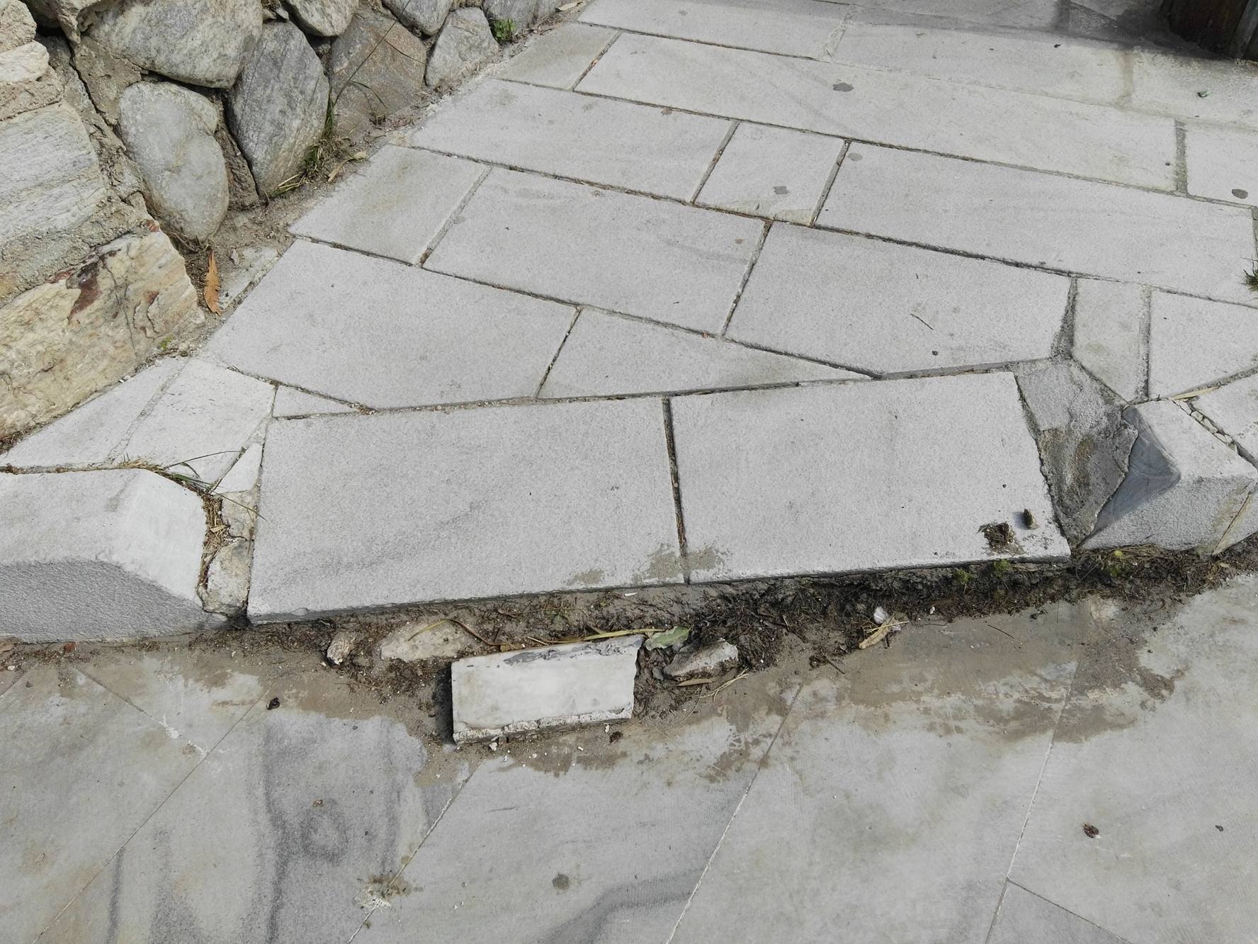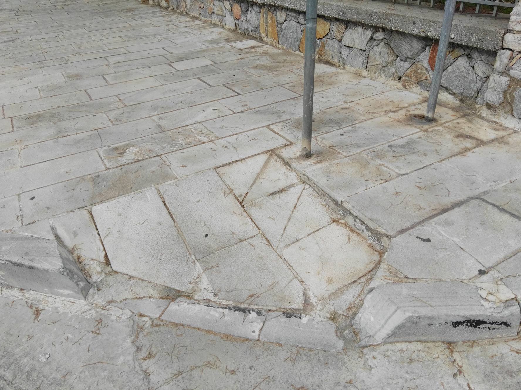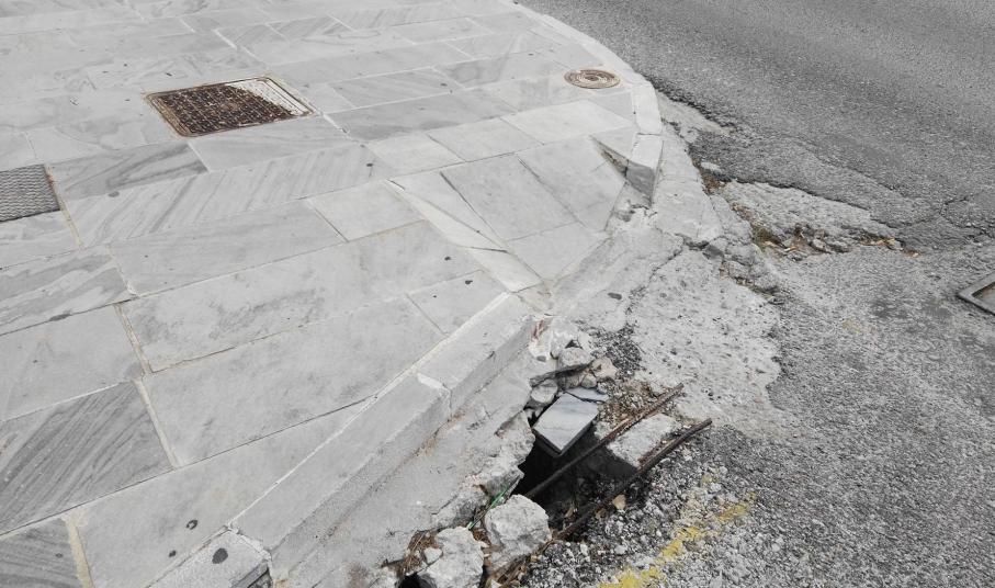 Σοβαρές φθορές στη έναρξη των πεζοδρομίων και συγκεκριμένα στα ταπεινωμένα μαρμάρινα τμήματα, όπως σπάσιμο πλακών, αλλά ακόμη και ξήλωμα της ασφάλτου που αποτελεί συνέχειά τους, με αποτέλεσμα να έχουν έρθει στην επιφάνεια μέχρι και σίδερα (εξοπλισμός) που βρίσκονταν κάτω από την επιφάνεια του οδοστρώματος, “στήνουν” μεγάλους κινδύνους σε όσους συμπολίτες μας που μετακινούνται με αναπηρικά αμαξίδια.