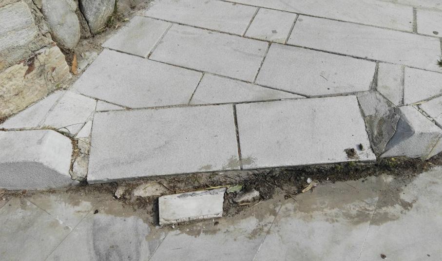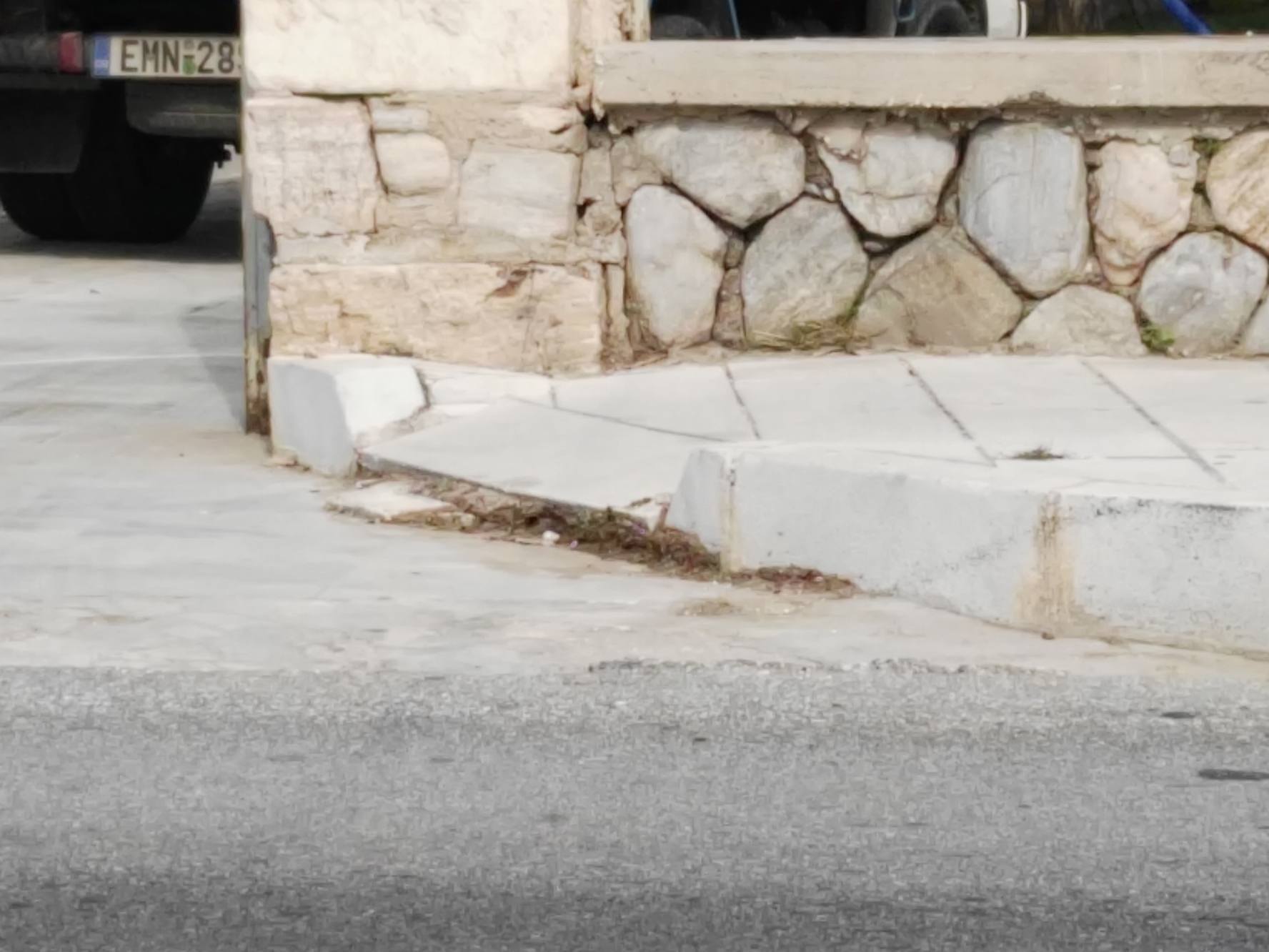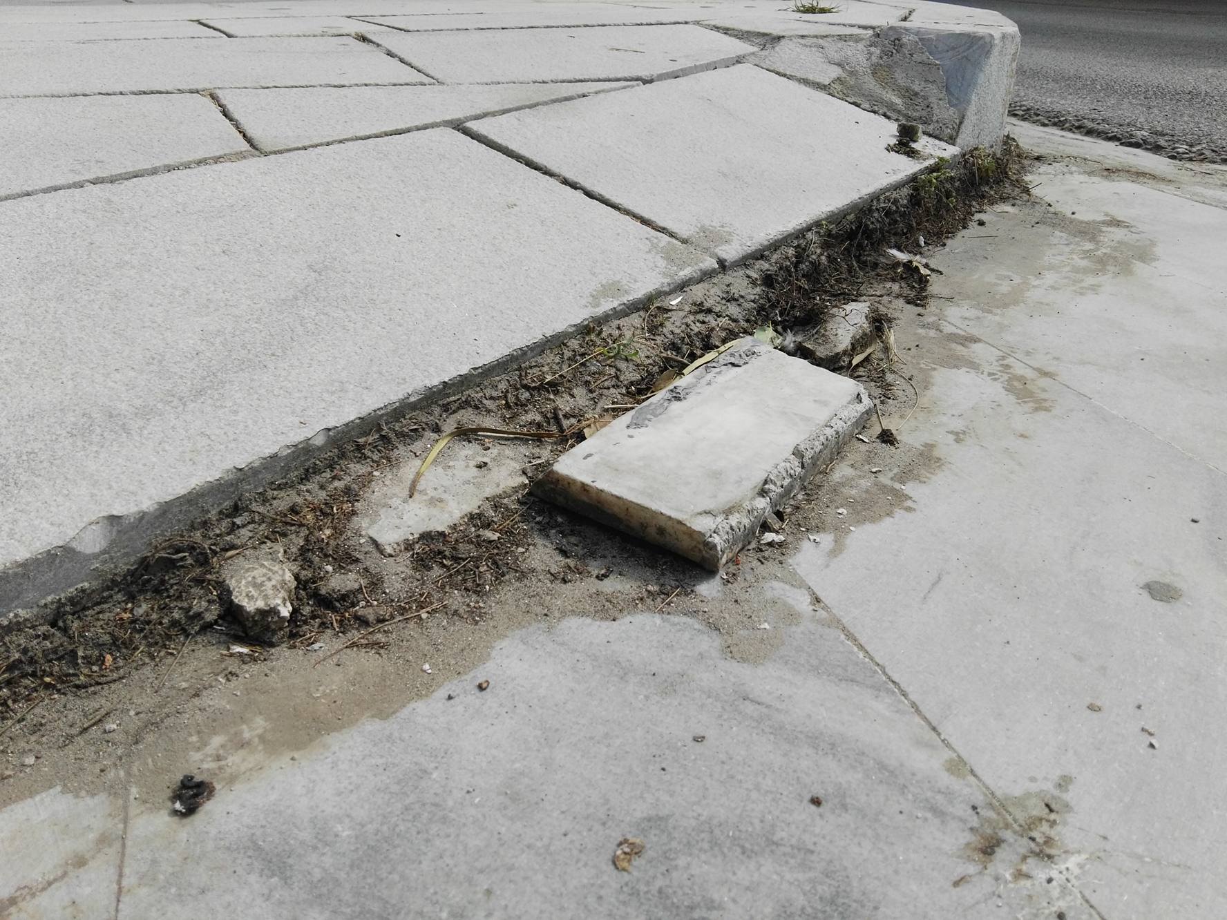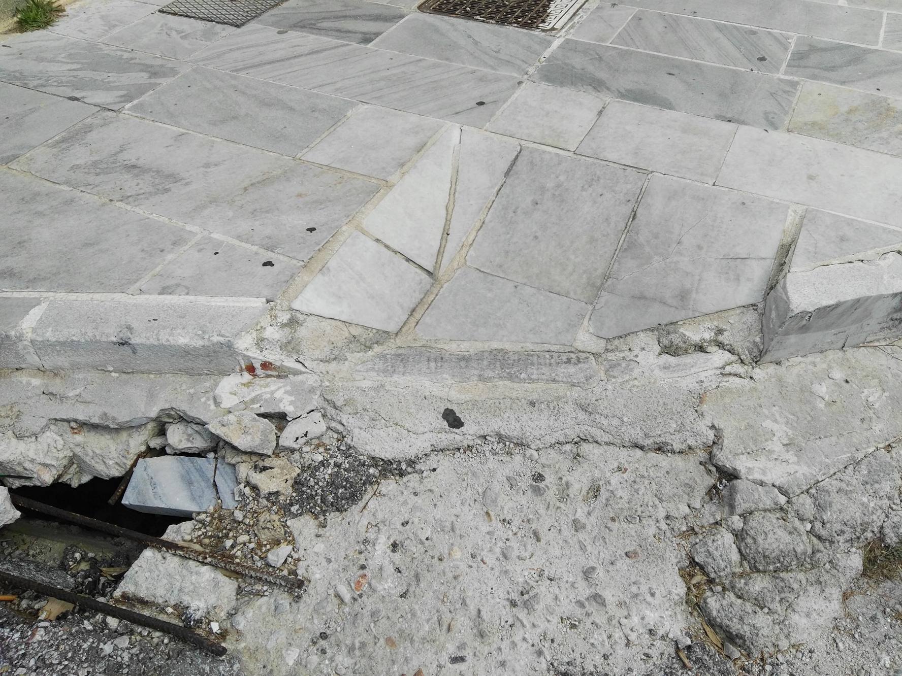 Σοβαρές φθορές στη έναρξη των πεζοδρομίων και συγκεκριμένα στα ταπεινωμένα μαρμάρινα τμήματα, όπως σπάσιμο πλακών, αλλά ακόμη και ξήλωμα της ασφάλτου που αποτελεί συνέχειά τους, με αποτέλεσμα να έχουν έρθει στην επιφάνεια μέχρι και σίδερα (εξοπλισμός) που βρίσκονταν κάτω από την επιφάνεια του οδοστρώματος, “στήνουν” μεγάλους κινδύνους σε όσους συμπολίτες μας που μετακινούνται με αναπηρικά αμαξίδια.