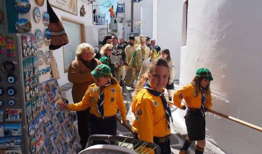 Σύσσωμος ήταν ο Λαός της Μυκόνου και στον εορτασμό της Κυριακής των Βαΐων, στον Ιερό Μητροπολιτικό Ναό της Μεγάλης Παναγιάς. Πριν από τη λιτανεία, πρόσκοποι και παιδιά της Μυκόνου, ανέμιζαν πανηγυρικά τα περίτεχνα Βάϊα (κλαδιά) από φοίνικες, που κατασκεύασαν, αναγγέλλοντας την έναρξη της Αγίας και Μεγάλης Εβδομάδας και την θριαμβευτική είσοδο του Χριστού στα Ιεροσόλυμα και στη ζωή των ανθρώπων.