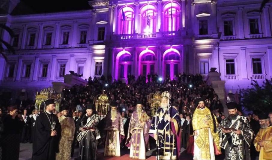 Τους ευγενείς και εκλεκτούς επισκέπτες της τρισένδοξης και ευλογημένης Σύρου, που δημιούργησαν και ανέδειξαν οι πρόσφυγες πατέρες μας από τα ματωμένα Ψαρά, την Χίο και την ελληνική Ιωνία καλωσόρισε, κατά τον χαιρετισμό του, ο Σεβασμιώτατος κ. Δωρόθεος, υπογραμμίζοντας ότι, για πρώτη φορά, η ιστορική πλατεία Μιαούλη πλημμύρισε με τόσο πολύ κόσμο το βράδυ της Μεγάλης Παρασκευής.