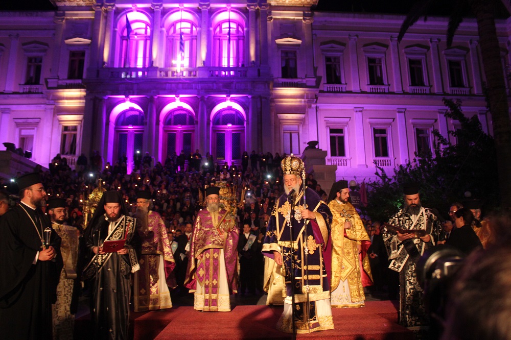 Ο Σεβασμιώτατος ευχαρίστησε τους επισκέπτες που επέλεξαν τη Σύρο για να εορτάσουν τα Πάθη και την Ανάσταση του Χριστού και να διακηρύξουν από αυτήν σε ολόκληρο τον κόσμο ότι, ο Θεός δεν πέθανε, αλλά ζει μέσα στους αιώνες και την ιστορία, δίνοντας στους ανθρώπους τον τρόπο να ξεφεύγουν από τα καθημερινά και τα στενάχωρα. Τους προέτρεψε μάλιστα να ψηλαφίσουν το νησί, να αναζητήσουν και να αγγίξουν τα διάσπαρτα δακτυλικά αποτυπώματα της ιστορίας, κληρονομιάς των προγόνων μας που πριν από 190 χρόνια δημιούργησαν έναν τόπο μοναδικό και ανεπανάληπτο, που φημίζεται για την ευγένεια και την αρχοντιά του.
