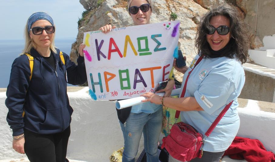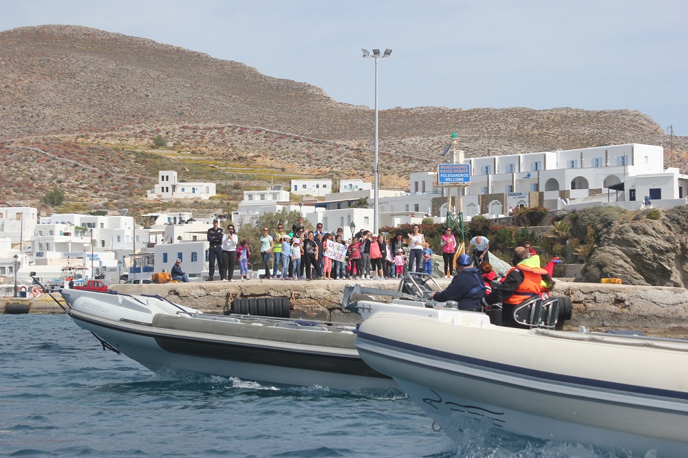 Πέντε φουσκωτά το Ομίλου και ένα της WWF ξεκίνησαν το ταξίδι τους νωρίς το πρωί από τη Μαρίνα της Σύρου. Λίγο πριν τις 11, μαθητές του τριθέσιου Δημοτικού Σχολείου Φολεγάνδρου καλωσόρισαν τα πληρώματα στο λιμάνι του νησιού, χαρίζοντας τους απλόχερα χαμόγελα, αγκαλιές και ένα όμορφο πανό, με το οποίο εκδήλωσαν τη χαρά τους.