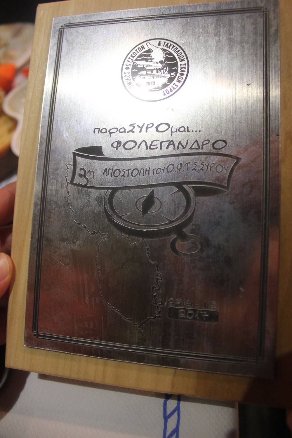 Σημειώνεται, ότι από την πρώτη κιόλας στιγμή, στο πλευρό του Ομίλου βρισκόταν η Αντιδήμαρχος Φολεγάνδρου Ευθαλία Παπαδοπούλου, συμβάλλοντας ενεργά στην ομαλή πραγματοποίηση των προγραμματισμένων δράσεων. Από την πλευρά του, ο Όμιλος ευχαρίστησε τόσο την κ. Παπαδοπούλου όσο και τον Δήμαρχο Φολεγάνδρου Λευτέρη Βενιό για την αγάπη και την εγκάρδια φιλοξενία τους, απονέμοντάς τους μία αναμνηστική πλακέτα. Τα μέλη της αποστολής είχαν μάλιστα την ευκαιρία να παρακολουθήσουν και το παραδοσιακό έθιμο του νησιού για την υποδοχή της Πρωτομαγιάς με τα «στολισμένα» γαϊδουράκια στα σοκάκια της Χώρας, συνοδεία μουσικών οργάνων και πλήθους κατοίκων, κάθε ηλικίας, που τραγουδούσαν με όλη τους την ψυχή.