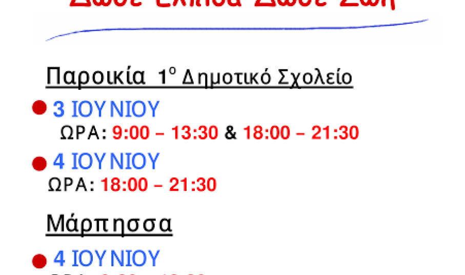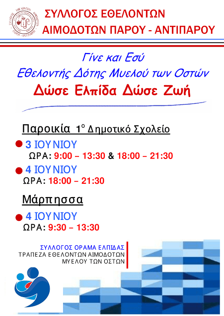 Το προσεχές διήμερο του Ιουνίου αφιερώνει στην εθελοντική αιμοδοσία ο Σύλλογος Εθελοντών Αιμοδοτών Πάρου συνεχίζοντας το πολύτιμο έργο και την προσφορά του και καλώντας τους πολίτες να δώσουν αίμα.