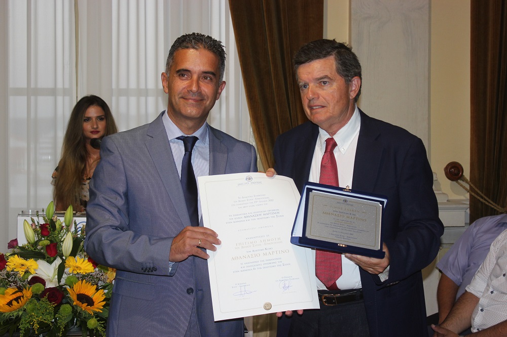 Την πολυετή και πάντοτε αθόρυβη προσφορά του Αθανάσιου Μαρτίνου προς τους ανθρώπους της Σύρου και τον πολιτισμό του νησιού αναγνώρισε το δημοτικό συμβούλιο του Δήμου Σύρου – Ερμούπολης, ανακηρύσσοντας τον ίδιο, το βράδυ της Κυριακής, σε Επίτιμο Δημότη του τόπου.