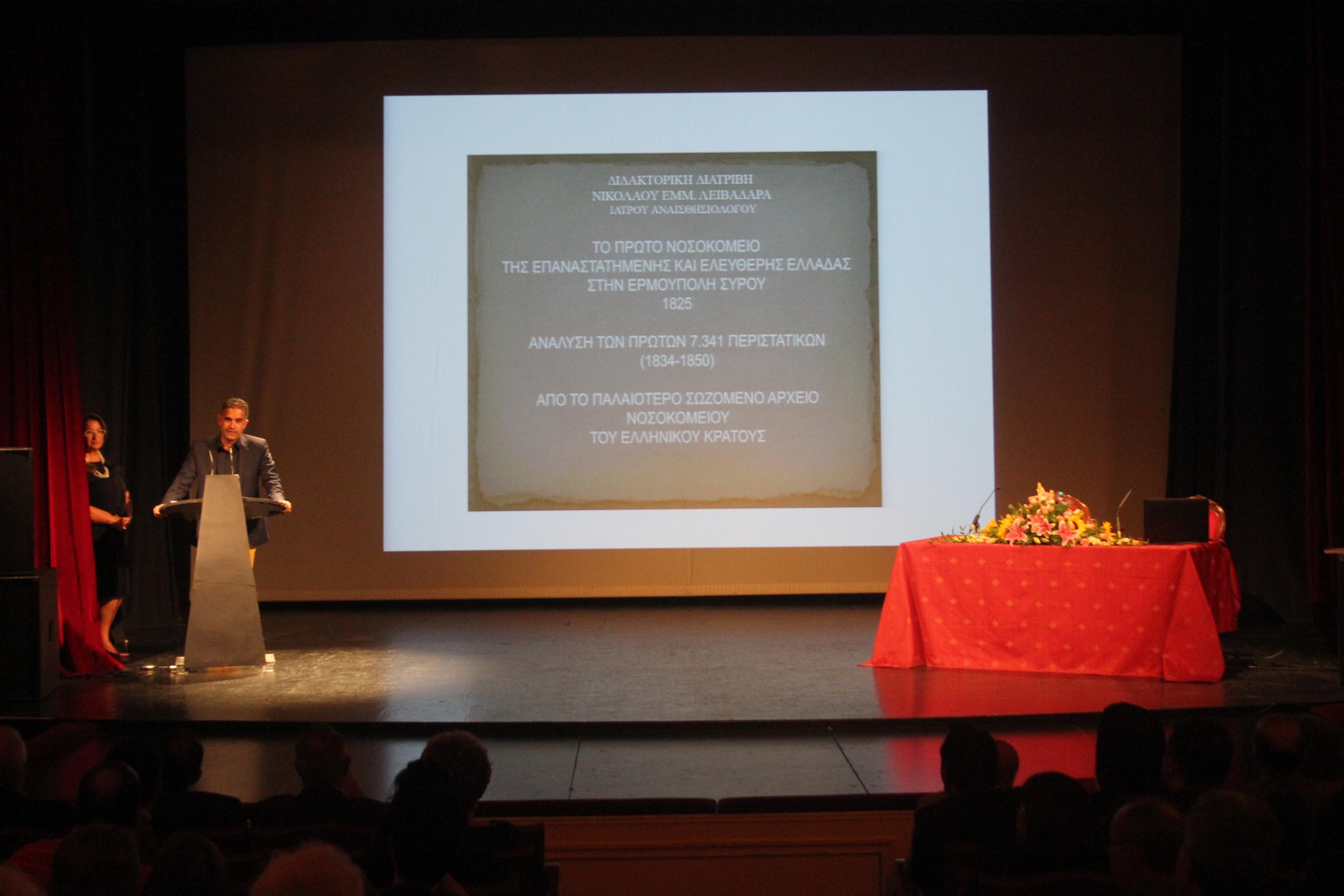Η μοναδική, θαυμαστή και σε πολλούς άγνωστη ιστορία του Νοσοκομείου Σύρου, του πρώτου νοσοκομείου της επαναστατημένης και ελεύθερης Ελλάδας, που ιδρύθηκε και λειτούργησε το 1825, καταγράφεται, αναλύεται και τεκμηριώνεται στη διδακτορική διατριβή του ιατρού αναισθησιολόγου Νικόλαου Λειβαδάρα, που παρουσιάστηκε το βράδυ της Δευτέρας στο Θέατρο «Απόλλων».
