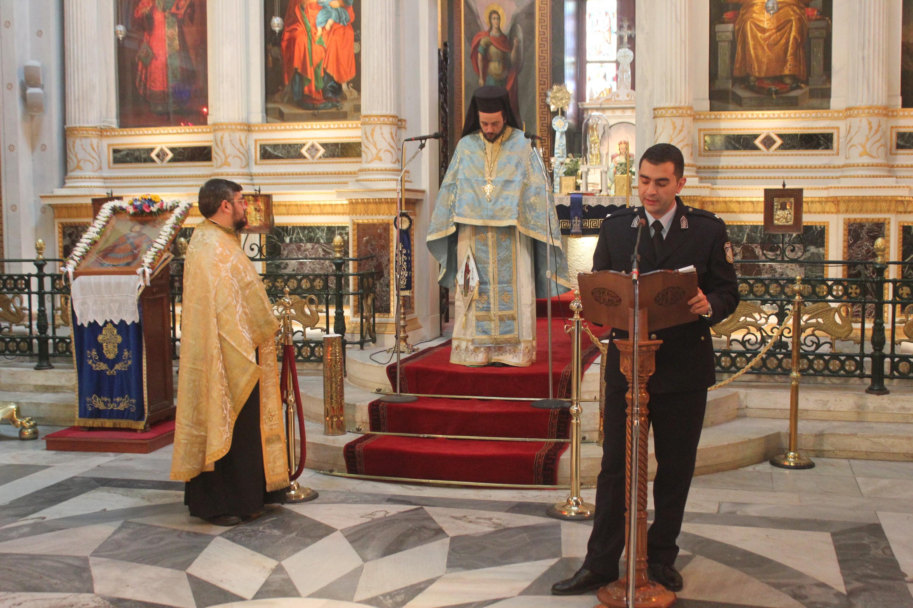 Στο πλαίσιο των εορταστικών εκδηλώσεων, τελέστηκε Θεία Λειτουργία στον Ιερό Ναό Αγίου Νικολάου Ερμουπόλεως, παρουσία του Βικάριου της Καθολικής Επισκοπής Σύρου π. Αντωνίου Βουτσίνου, εκπροσώπων των στρατιωτικών αρχών και των σωμάτων ασφαλείας, της Διοικήτριας του Γενικού Νοσοκομείου Σύρου Μαργαρίτας Μπουραντά, στελεχών της εκπαίδευσης, συνδικαλιστικών ενώσεων του αστυνομικού προσωπικού και ενώσεων αποστράτων.