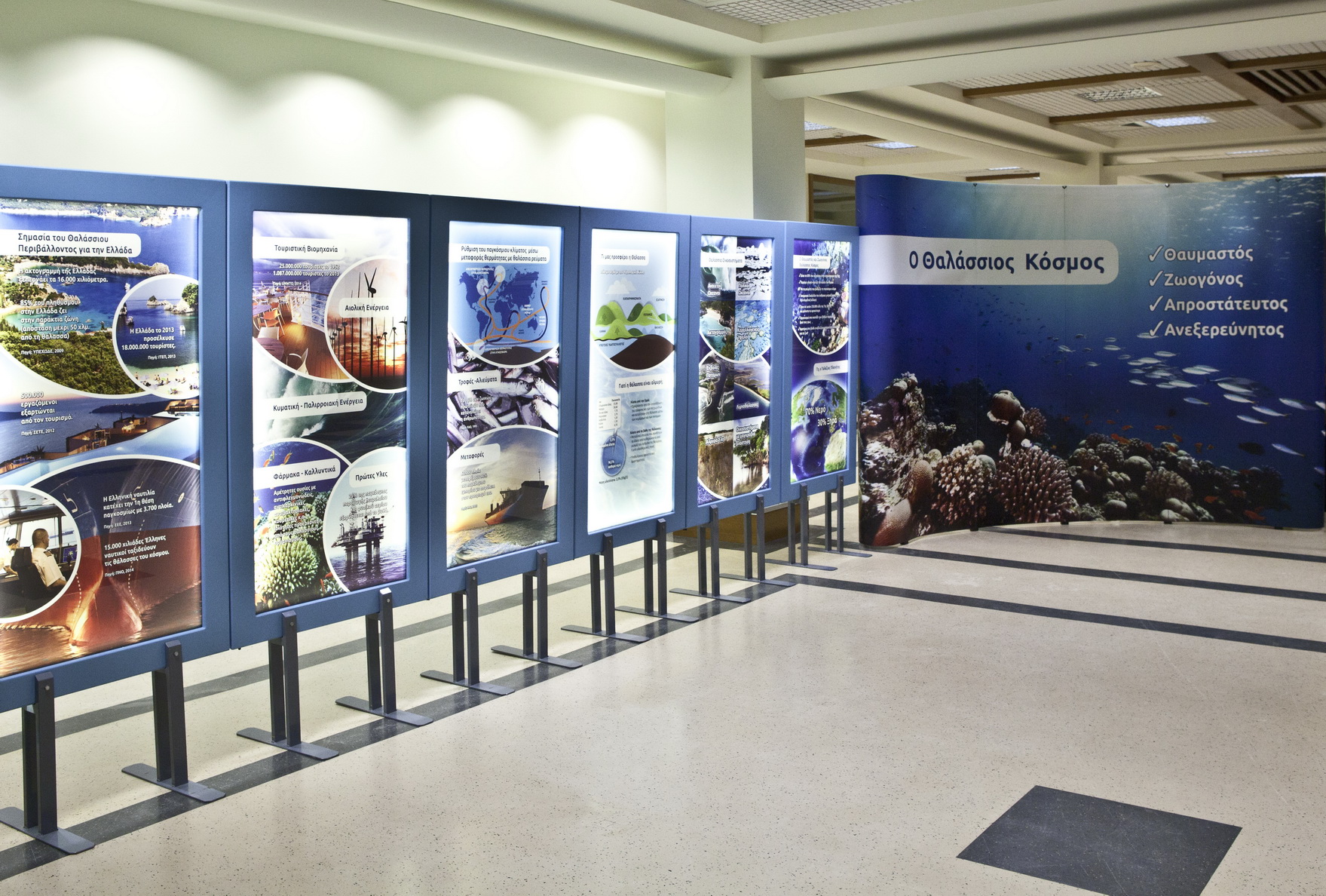 Σε κάθε πόλη, το πρόγραμμα, υπό την αιγίδα του Δήμου, περιλαμβάνει έκθεση εμπλουτισμένη με νέα ευρήματα και επιστημονικά στοιχεία για το θαλάσσιο περιβάλλον και πληροφορίες για τη ναυτιλία, τις επιστήμες και τη μηχανική. Η έκθεση παραμένει για δύο εβδομάδες σε κάθε περιοχή και λειτουργεί τα πρωινά για σχολικές επισκέψεις και τα απογεύματα καθώς και Σαββατοκύριακα για το κοινό. Οι επισκέπτες θα έχουν την ευκαιρία να γνωρίσουν μέσα από αυτήν τον πλούτου του θαυμαστού, ζωογόνου, απροστάτευτου και ανεξερεύνητου θαλάσσιου κόσμου, καθώς και τη σημασία του για τη χώρα μας. Σημειώνεται πως η ακτογραμμή της Ελλάδας ξεπερνάει τα 16.000 χιλιόμετρα. 85% του πληθυσμού ζει στην παράκτια ζώνη (απόσταση μέχρι 50 χλμ. από τη θάλασσα) και σύμφωνα με στοιχεία του Συνδέσμου Ελληνικών Τουριστικών Επιχειρήσεων του 2012, 500.000 εργαζόμενοι εξαρτώνται από τον τουρισμό. Η Ελλάδα το 2013 προσέλκυσε 18.000.000 τουρίστες, ενώ η Ελληνική Ναυτιλία κατέχει την 1η θέση παγκοσμίως με 3.700 πλοία.