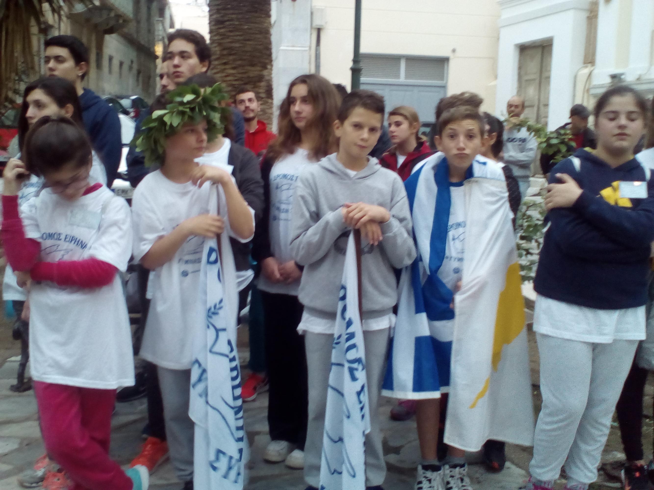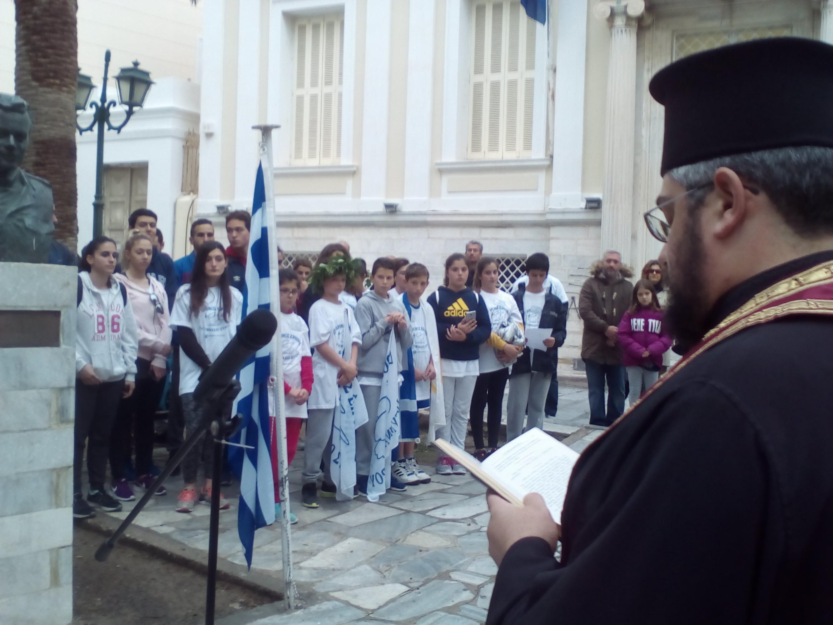 Μαθητές από όλα τα σχολεία της Δευτεροβάθμιας Εκπαίδευσης της Σύρου, καθώς και σπουδαστές της Σχολής του Εμπορικού Ναυτικού διένυσαν την απόσταση των 21,5 χλμ, η οποία καλύφθηκε διαδοχικά, υπό μορφή σκυταλοδρομίας, ανά πεντακόσια μέτρα, εκτός από το τελευταίο κομμάτι της διαδρομής το οποίο διανύθηκε από όλους τους συμμετέχοντες.