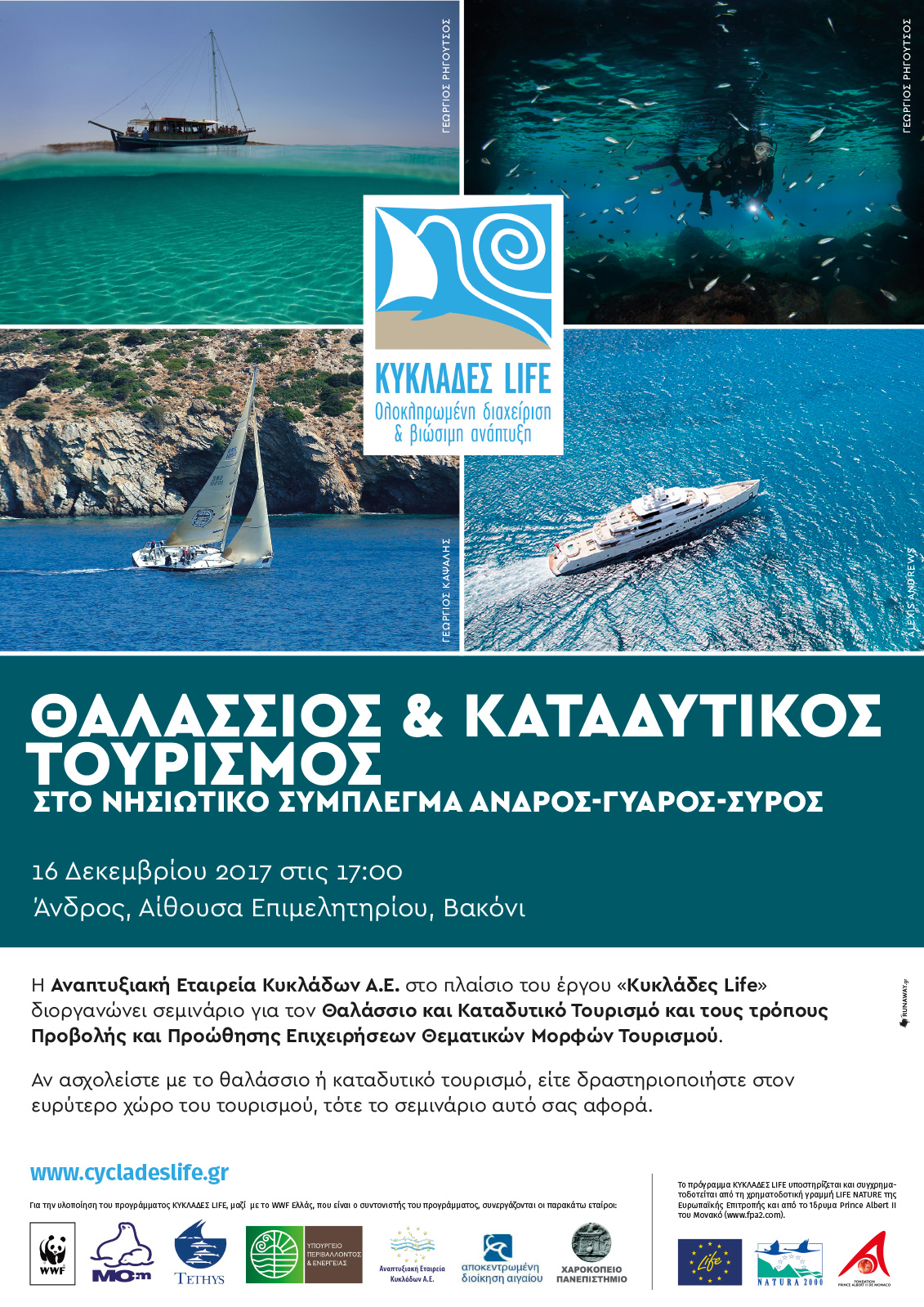 Η Αναπτυξιακή Εταιρεία Κυκλάδων Α.Ε., στο πλαίσιο του έργου «Κυκλάδες Life» στο οποίο συμμετέχει ο Δήμος Άνδρου με εκπρόσωπό του, διοργανώνει σεμινάριο για τον Θαλάσσιο και Καταδυτικό Τουρισμό και τους τρόπους Προβολής και Προώθησης Επιχειρήσεων Θεματικών Μορφών Τουρισμού.