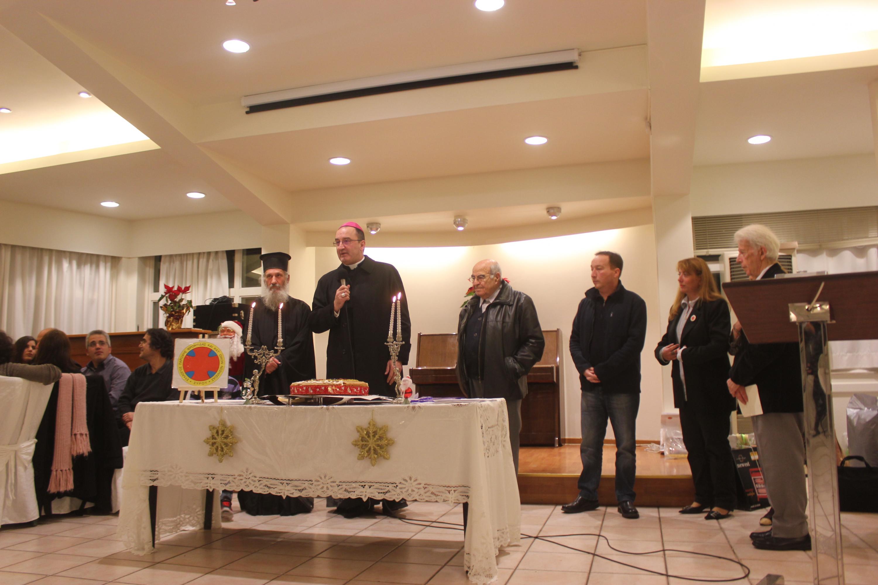 Στο πλαίσιο της εκδήλωσης τιμήθηκαν τέσσερις συμπολίτες μας για την πολύτιμη προσφορά τους προς τον Σύλλογο. Την πίτα ευλόγησαν ο Καθολικός Επίσκοπος Σύρου Σεβ. π. Πέτρος Στεφάνου και ο εκπρόσωπος της Ιεράς Μητρόπολης Σύρου π. Κωνσταντίνος Κοντός.
