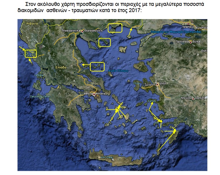 Ειδικά σε ότι αφορά στις διακομιδές ασθενών, στο πλαίσιο του κοινωνικού έργου του ΛΣ-ΕΛ.ΑΚΤ και της υφιστάμενης συνεργασίας με άλλους φορείς, κατόπιν σχετικού αιτήματος του ΕΚΑΒ, ανευρίσκονται μέσω των Λιμενικών Αρχών, κατάλληλα πλωτά μέσα για την πραγματοποίηση διακομιδών ασθενών- τραυματιών από τη νησιωτική χώρα σε λιμένες, όπου βρίσκονται εκείνες οι υγειονομικές μονάδες (όπως νοσοκομεία κ.α.), οι οποίες δύναται να ανταποκριθούν στο περιστατικό. Κατά το έτος 2017, το ΚΕΠΙΧ/ΛΣ-ΕΛ.ΑΚΤ. συνέδραμε συνολικά σε 866 διακομιδές 951 ασθενών, εκ των οποίων οι 262 πραγματοποιήθηκαν με περιπολικό ή ναυαγοσωστικό σκάφος ΛΣ-ΕΛ.ΑΚΤ. Οι 604 λοιπές διακομιδές, εκτελέστηκαν είτε με τη συνδρομή δρομολογημένων Ε/Γ-Ο/Γ πλοίων είτε με ιδιωτικά πλωτά μέσα υπό την παρακολούθηση του ΚΕΠΙΧ/ΛΣ-ΕΛ.ΑΚΤ και τη διαχείριση τοπικά από τις εμπλεκόμενες Λιμενικές Αρχές. Σε κάθε περίπτωση, η τελική απόφαση χρήσης ή μη, του υπό διάθεση πλωτού μέσου, ανήκε στην αποκλειστική αρμοδιότητα του ΕΚΑΒ.