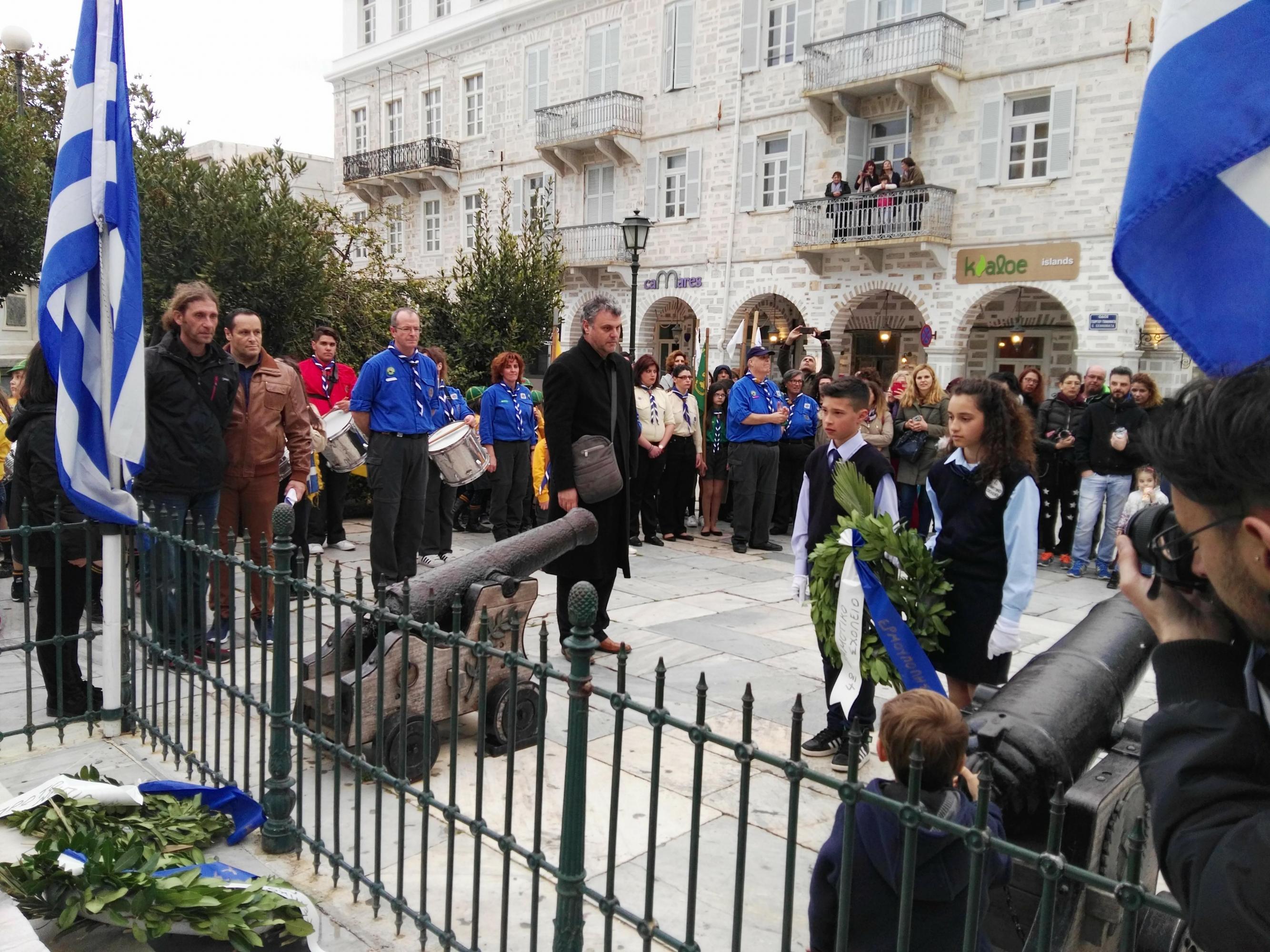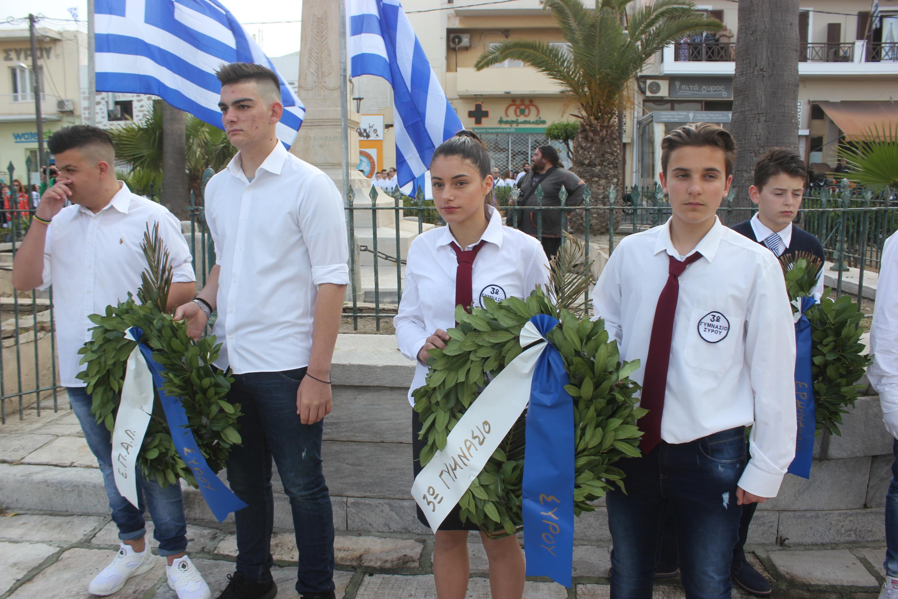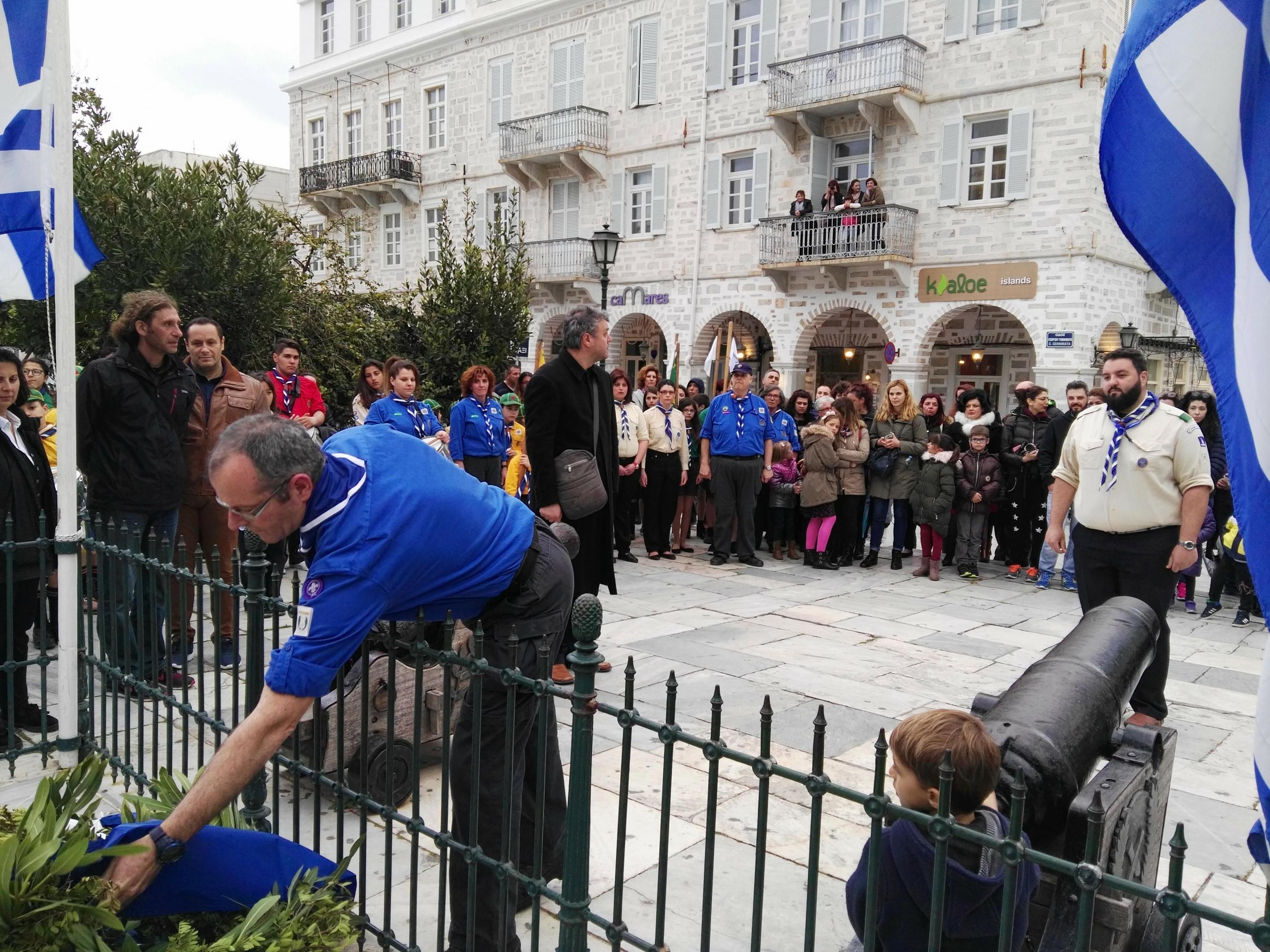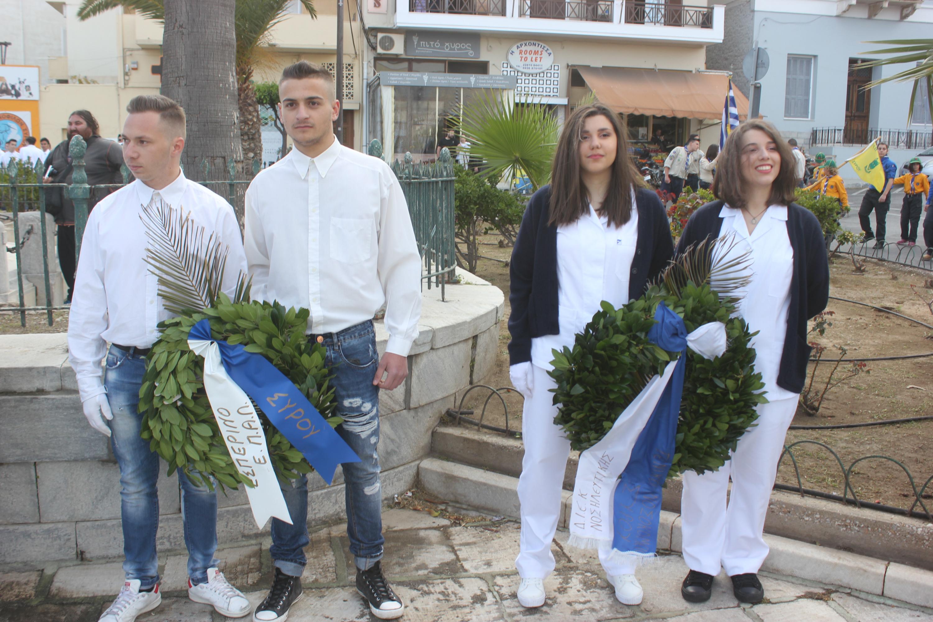 Στη συνέχεια, ακολούθησε κατάθεση στεφάνων στο Μνημείο Πεσόντων Ιερολοχιτών από μαθητές του 1ου Γυμνασίου Σύρου, στο Μνημείο Εθνικής Αντίστασης από μαθητές του 2ου και 3ου Δημοτικού Σχολείου Ερμούπολης και στην προτομή του Πυροπολητή Κανάρη από σπουδαστές της Ακαδημίας Εμπορικού Ναυτικού Σύρου, μαθητές του 2ου Γυμνασίου Σύρου, του Εσπερινού Γυμνασίου (με τάξεις Λυκείου) Σύρου και από το Ναυτικό Όμιλο Σύρου.