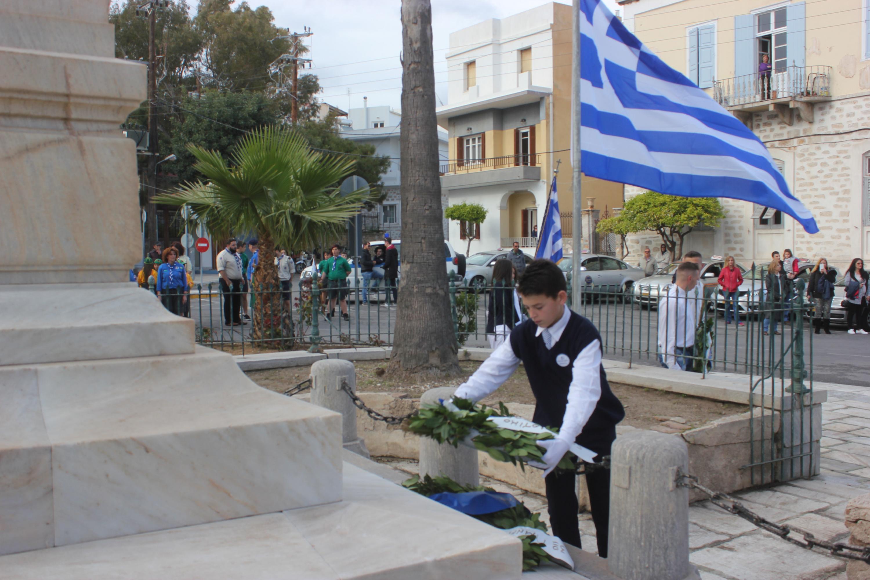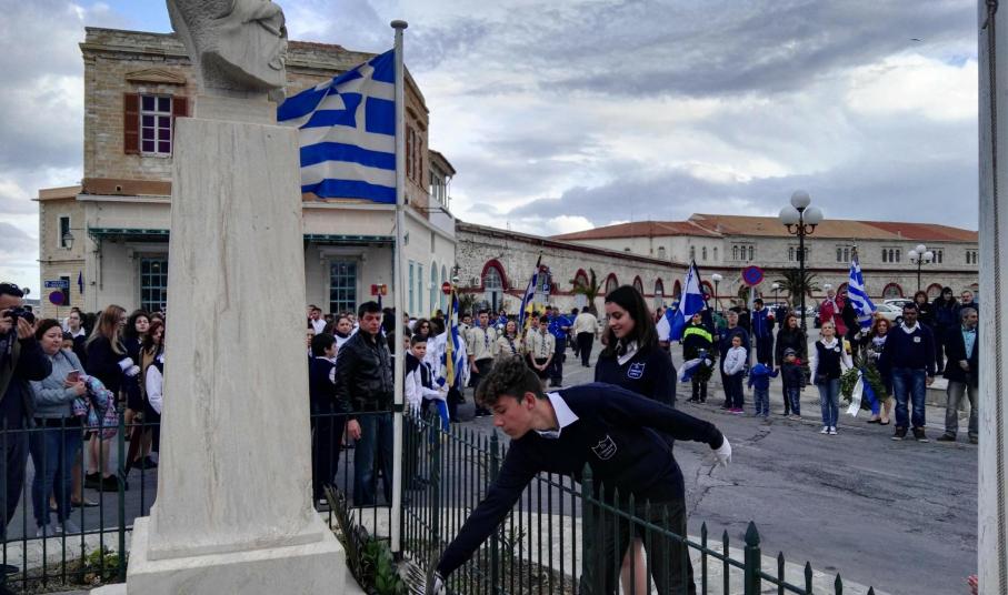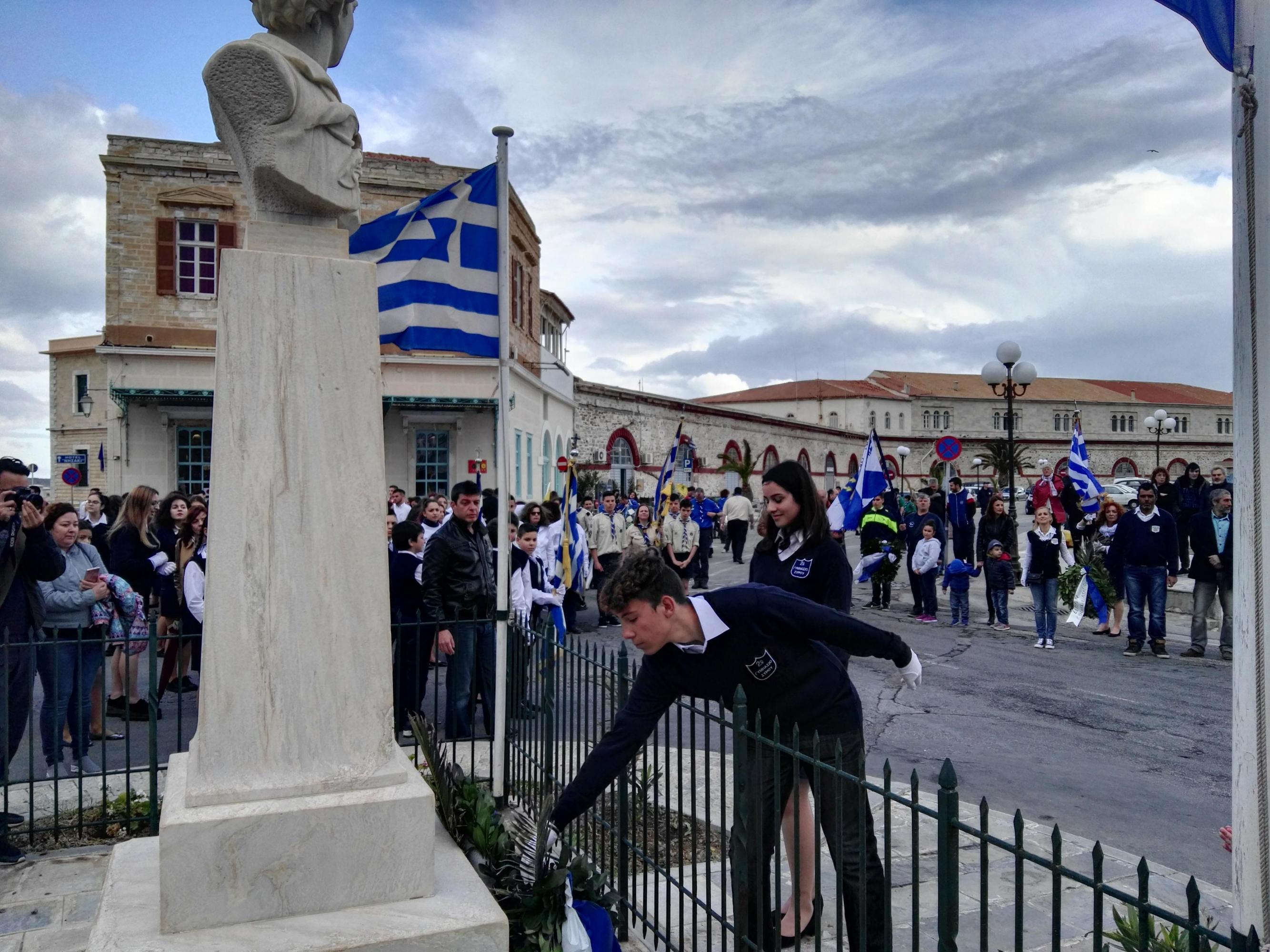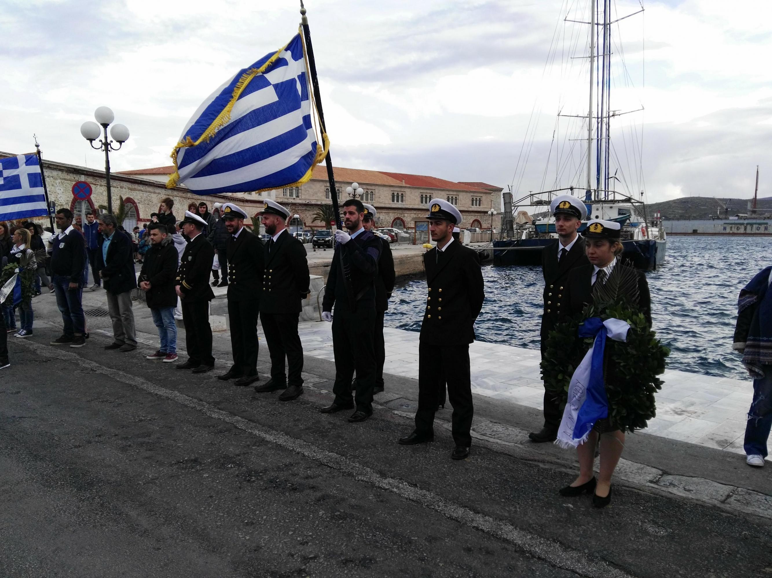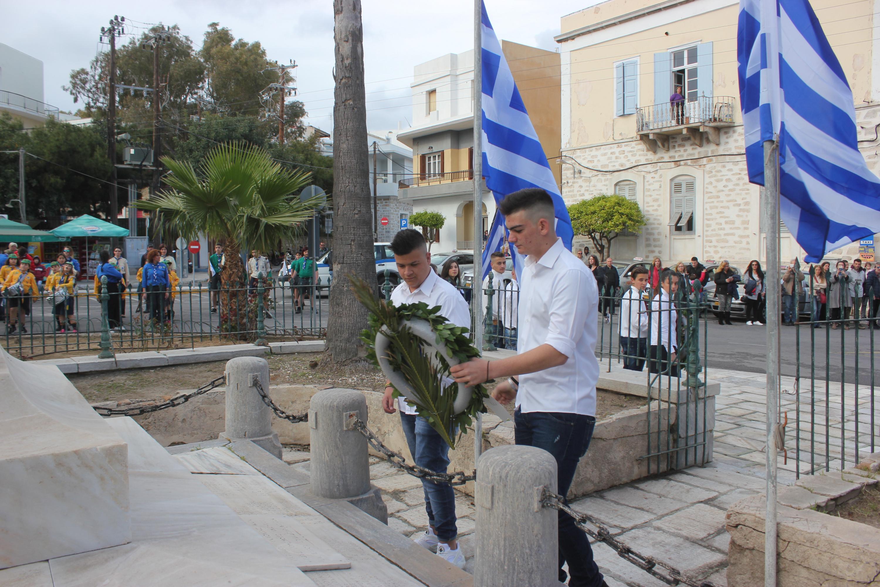Στη συνέχεια, ακολούθησε κατάθεση στεφάνων στο Μνημείο Πεσόντων Ιερολοχιτών από μαθητές του 1ου Γυμνασίου Σύρου, στο Μνημείο Εθνικής Αντίστασης από μαθητές του 2ου και 3ου Δημοτικού Σχολείου Ερμούπολης και στην προτομή του Πυροπολητή Κανάρη από σπουδαστές της Ακαδημίας Εμπορικού Ναυτικού Σύρου, μαθητές του 2ου Γυμνασίου Σύρου, του Εσπερινού Γυμνασίου (με τάξεις Λυκείου) Σύρου και από το Ναυτικό Όμιλο Σύρου.