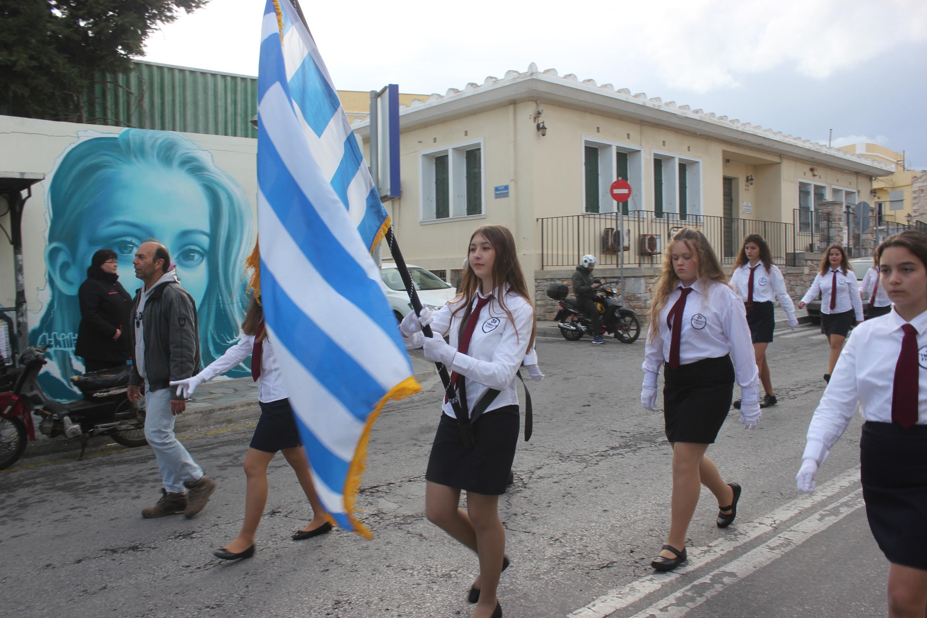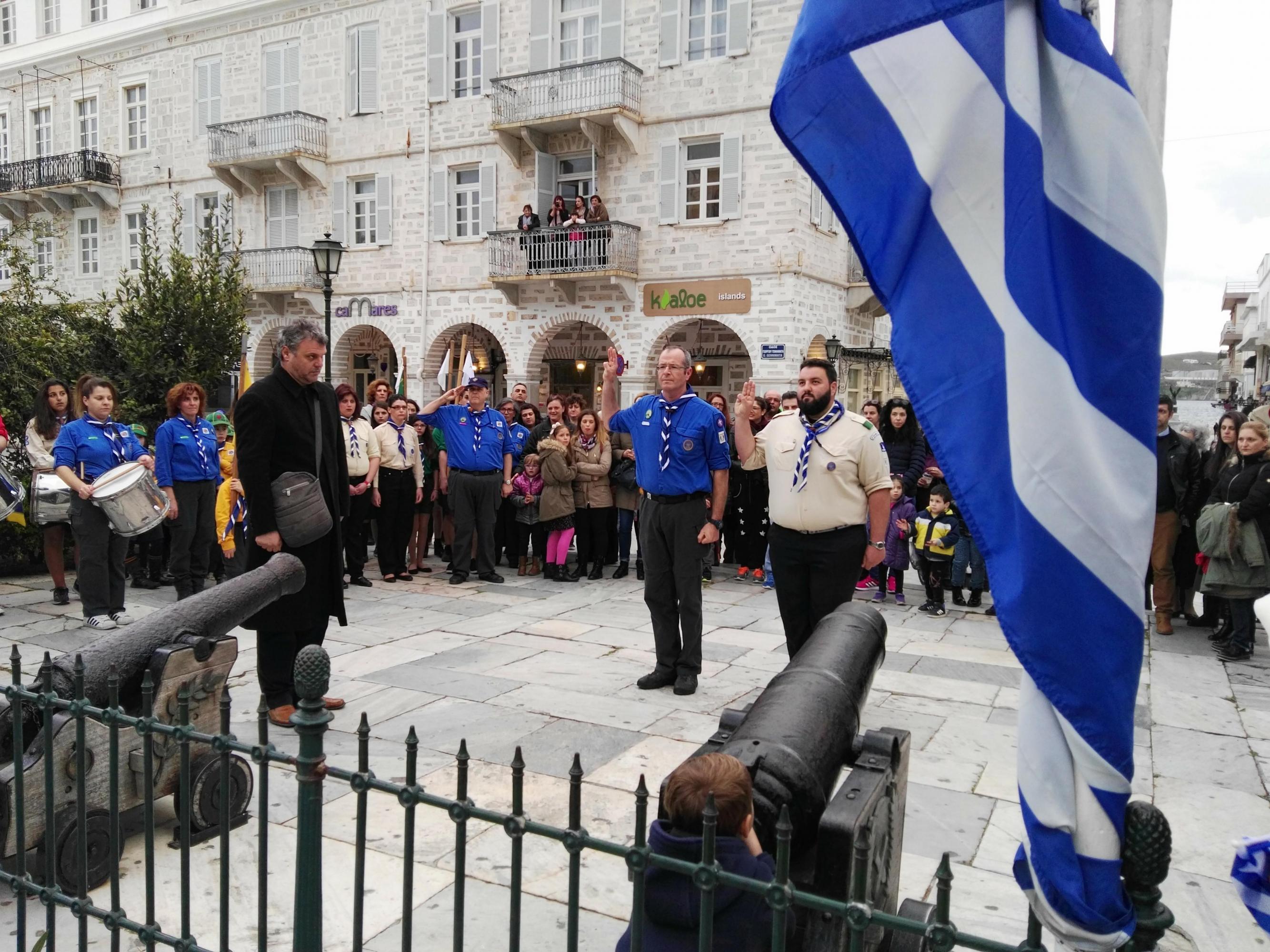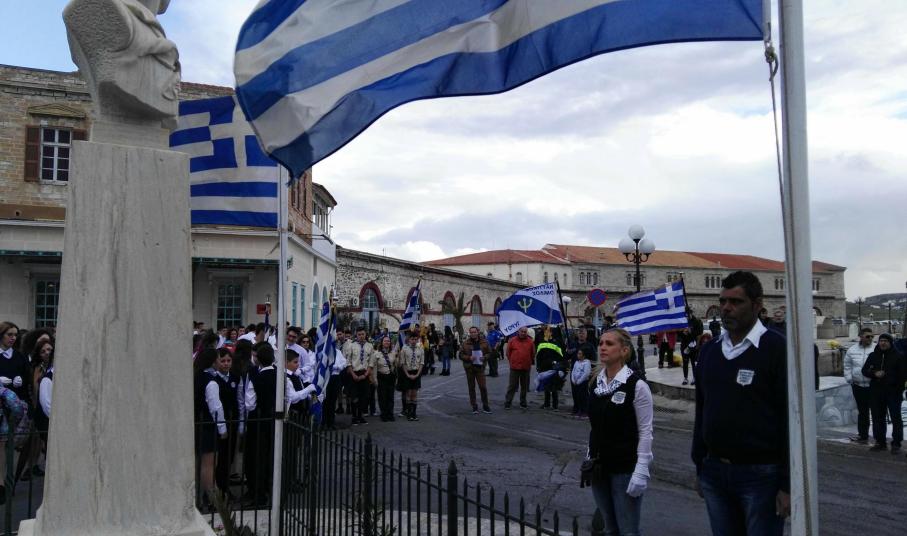 Τυχερά στάθηκαν τα τμήματα μαθητών, σπουδαστών και προσκόπων της Σύρου, τα οποία κατάφεραν να ολοκληρώσουν πριν από λίγα λεπτά την καθιερωμένη στεφάνωση στα μνημεία της Ερμούπολης, πριν από την ακραία επιδείνωση του καιρού και την έναρξη της ισχυρής βροχόπτωσης.