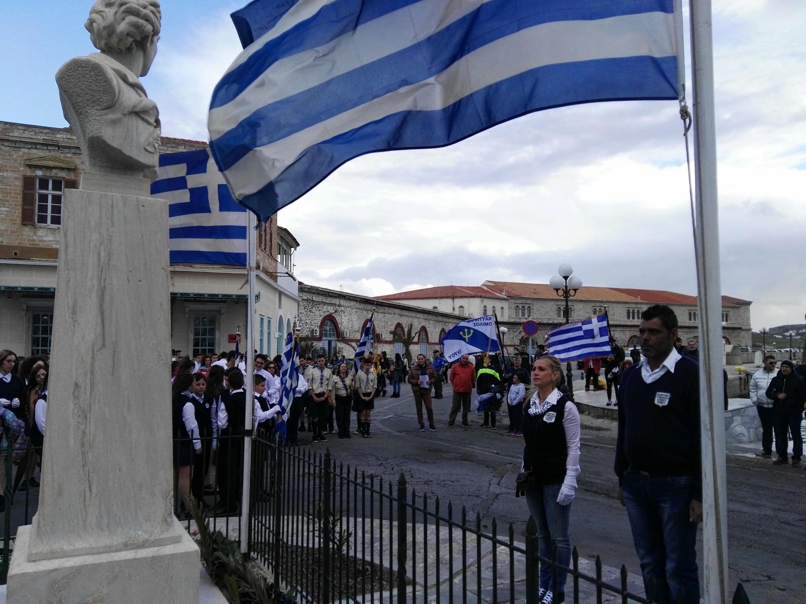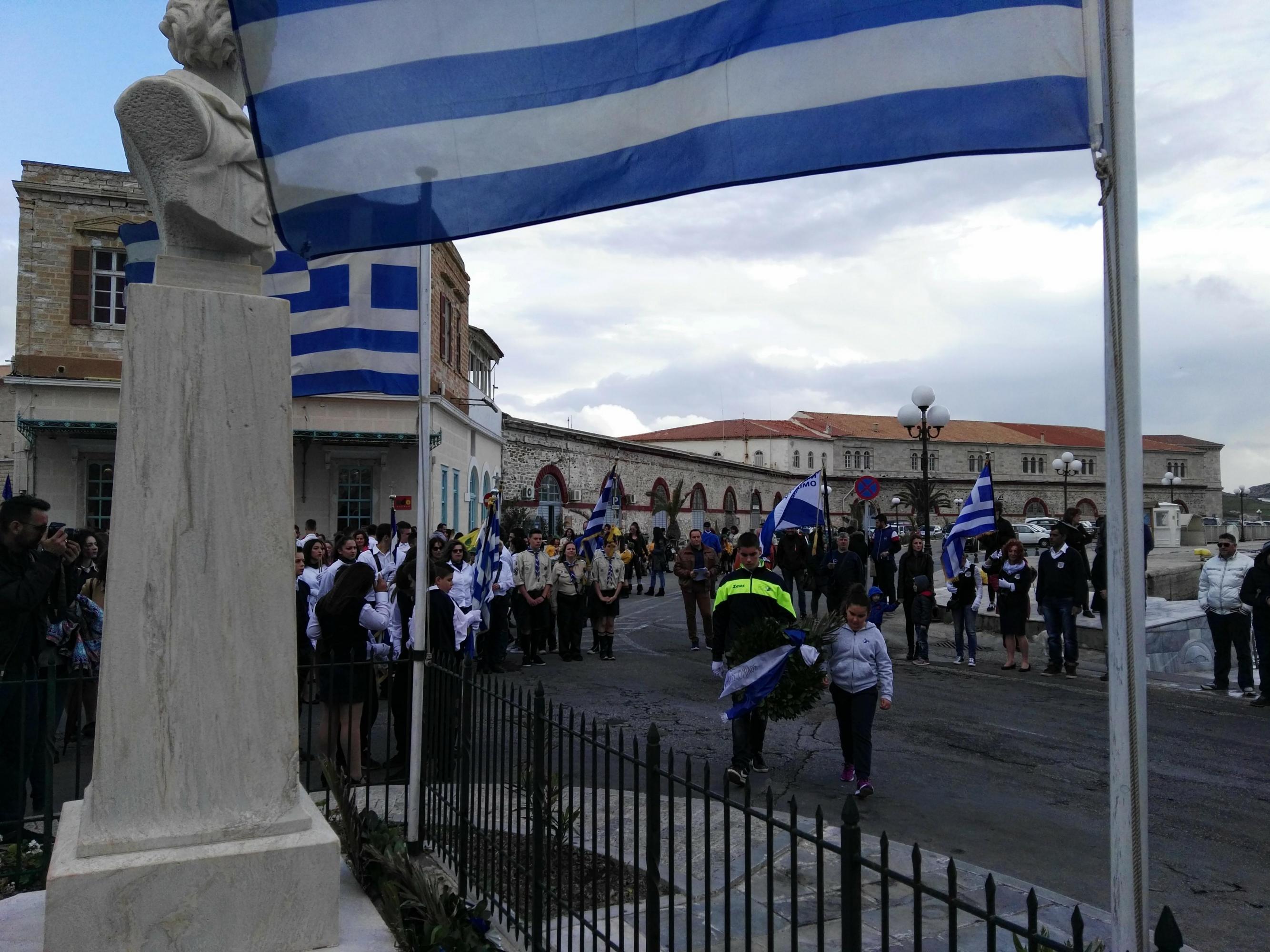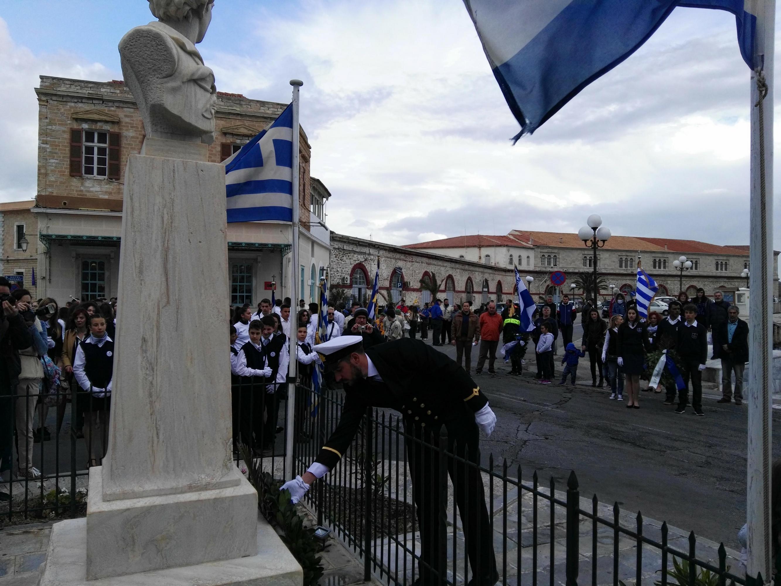 Η στεφάνωση ολοκληρώθηκε, όπως κάθε χρόνο, στον Αδριάντα του Ναυάρχου Μιαούλη από μαθητές του Γενικού Λυκείου Σύρου, του 4ου Δημοτικού Σχολείου Ερμούπολης και από το Σώμα Ελλήνων Προσκόπων.