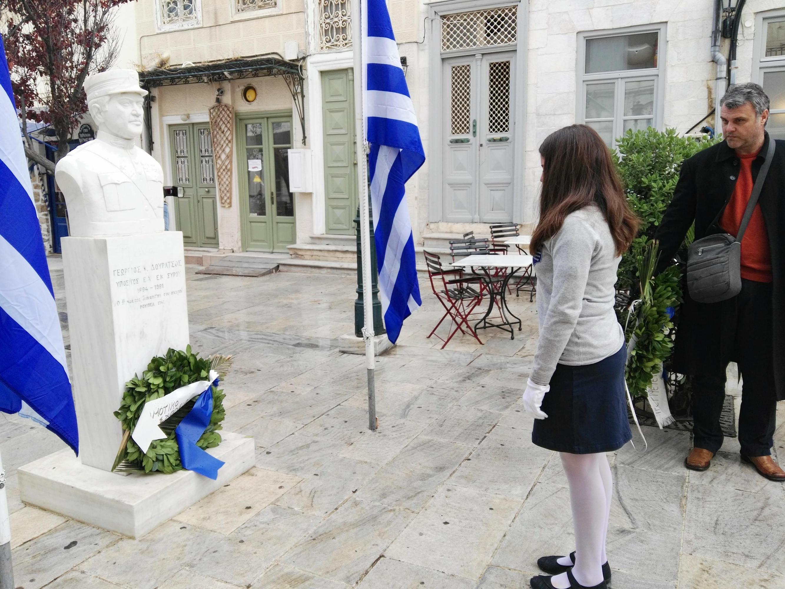 Συγκεκριμένα, στο Μνημείο Μικρασιατικής Μνήμης από τους μαθητές του 6ου Δημοτικού Σχολείου Ερμούπολης και το Σύλλογο Μικρασιατών Ερμούπολης Σύρου, στην προτομή του Ταγματάρχη Γεωργίου Δουράτσου από μαθητές του 1ου Δημοτικού Σχολείου Ερμούπολης και στο Ηρώο των Πεσόντων από μαθητές του ΕΠΑΛ Σύρου, του 3ου Γυμνασίου Σύρου, του 5ου Δημοτικού Σχολείου Ερμούπολης, του Εσπερινού ΕΠΑΛ Σύρου και από σπουδάστριες του ΔΙΕΚ του Γενικού Νοσοκομείου Σύρου.