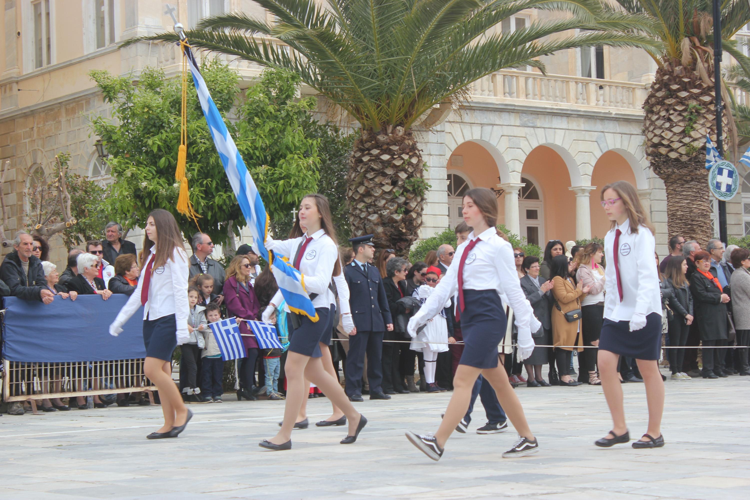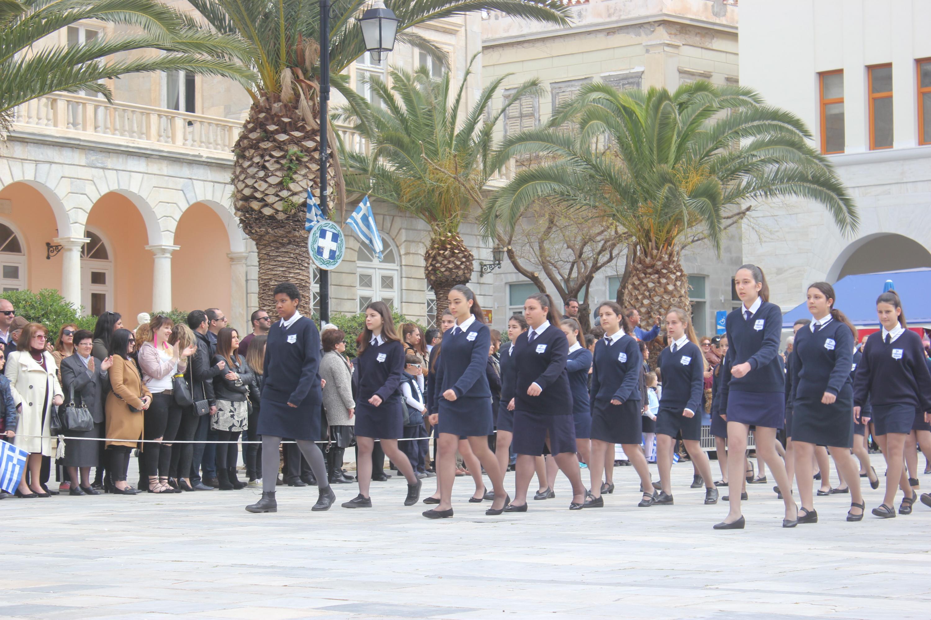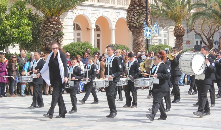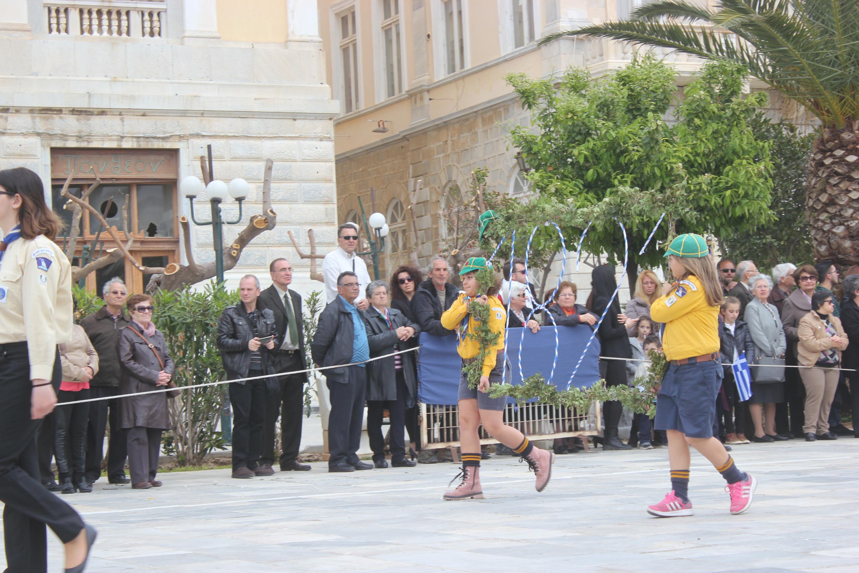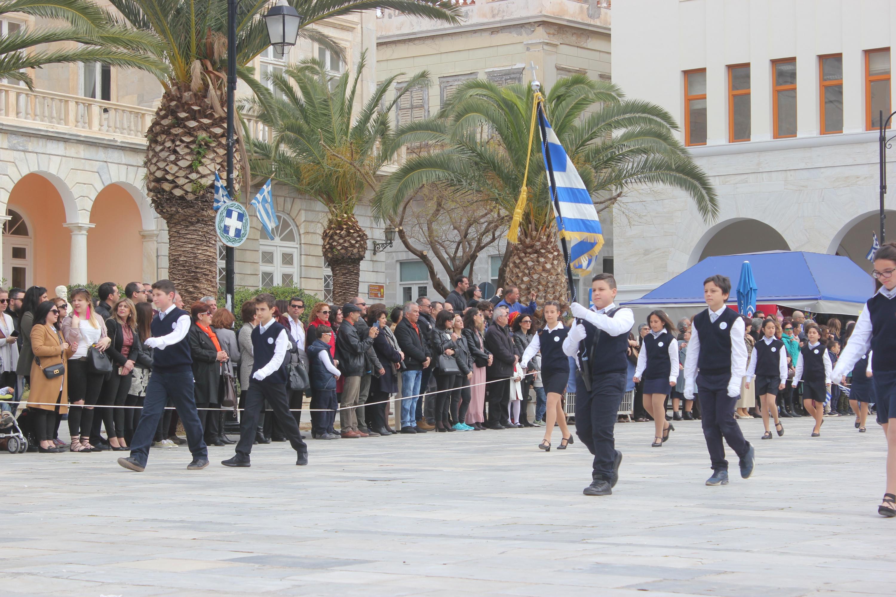 Με σύμμαχο τον καλό καιρό, τμήματα των σχολείων πρωτοβάθμιας και δευτεροβάθμιας εκπαίδευσης, αθλητικοί και πολιτιστικοί σύλλογοι, σπουδαστές της Ακαδημίας Εμπορικού Ναυτικού Σύρου καθώς και διμοιρία του Τάγματος Εθνοφυλακής Ερμούπολης απέτισαν φόρο τιμής στους ήρωες του 1821, εισπράττοντας το θερμό χειροκρότημα του κόσμου, που είχε συρρεύσει από νωρίς στην πλατεία Μιαούλη.