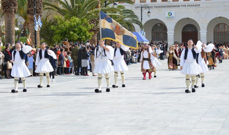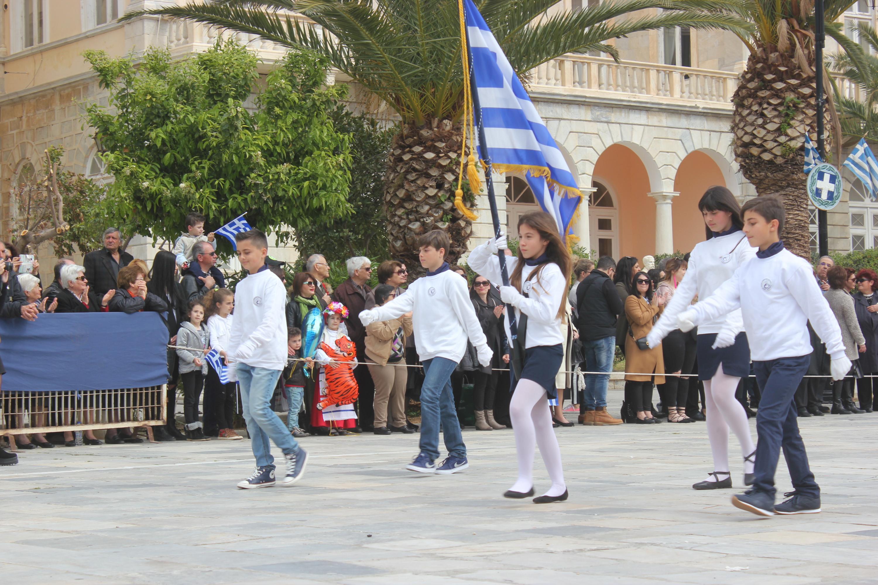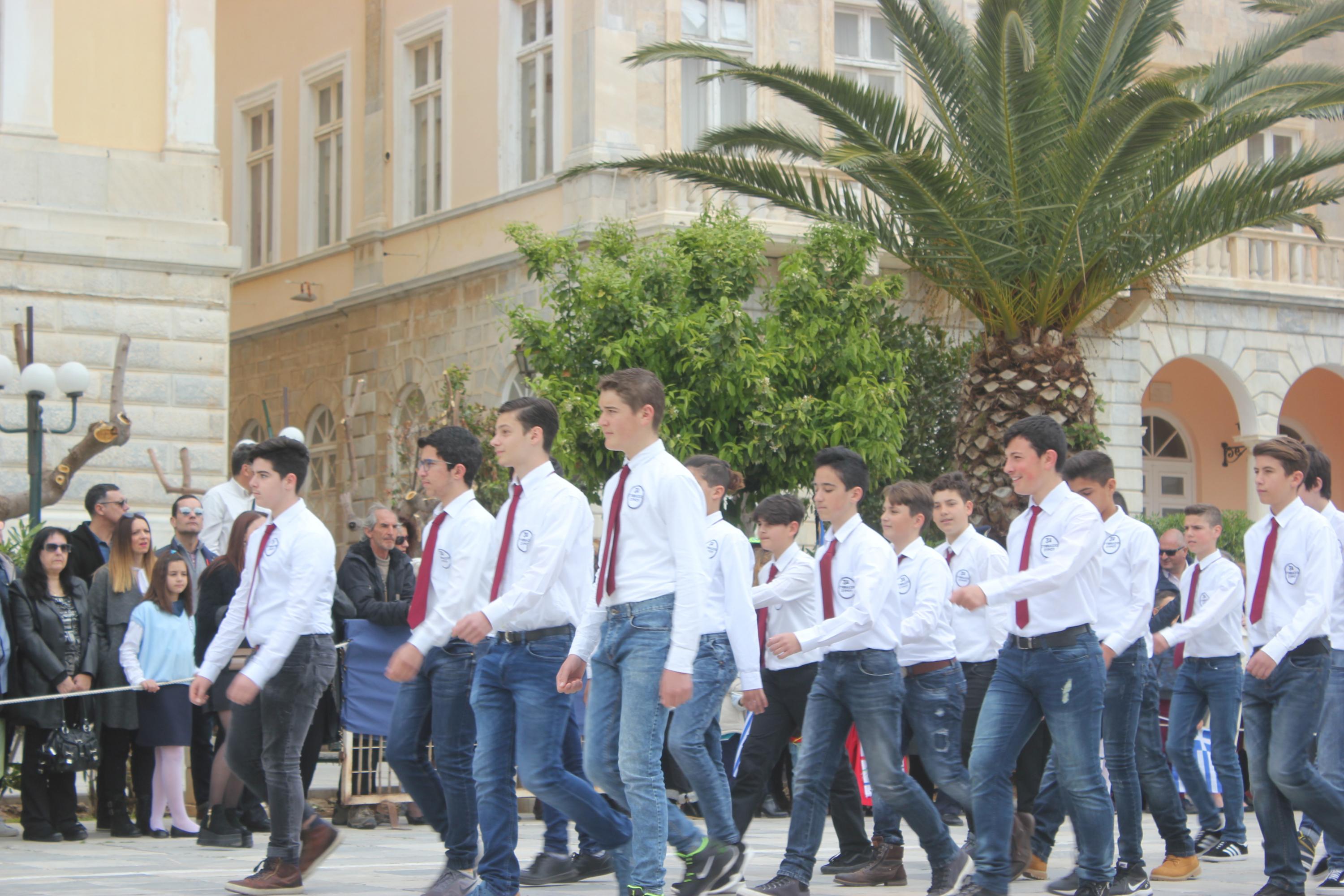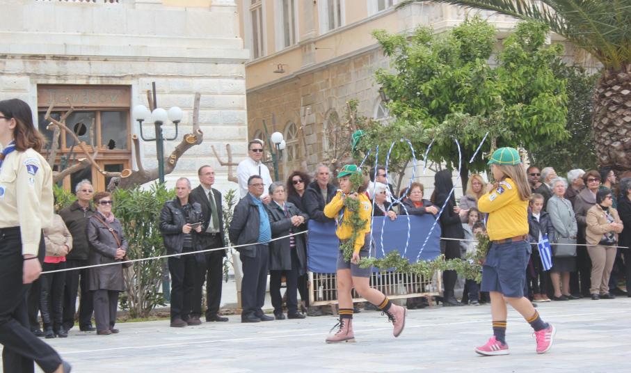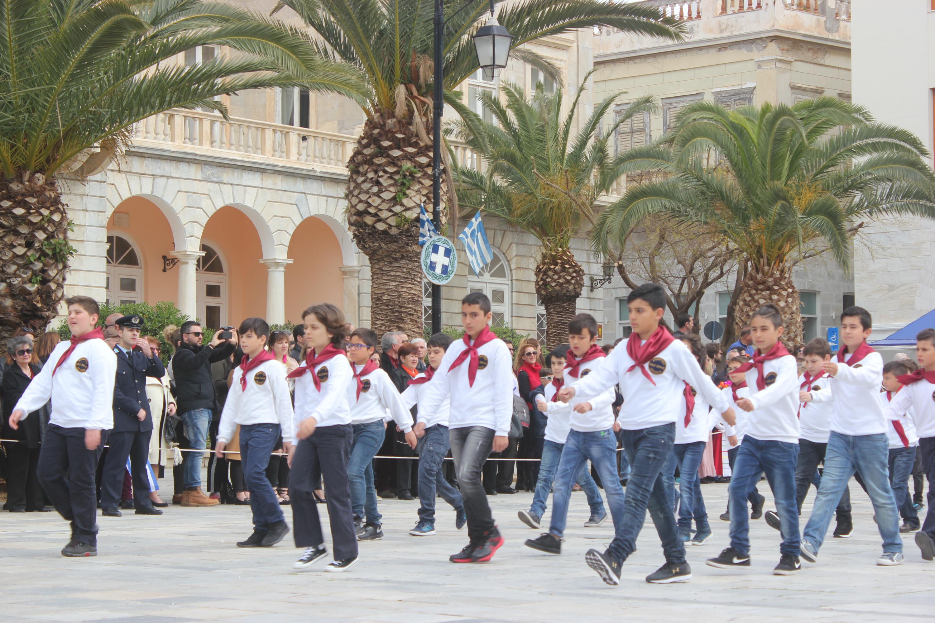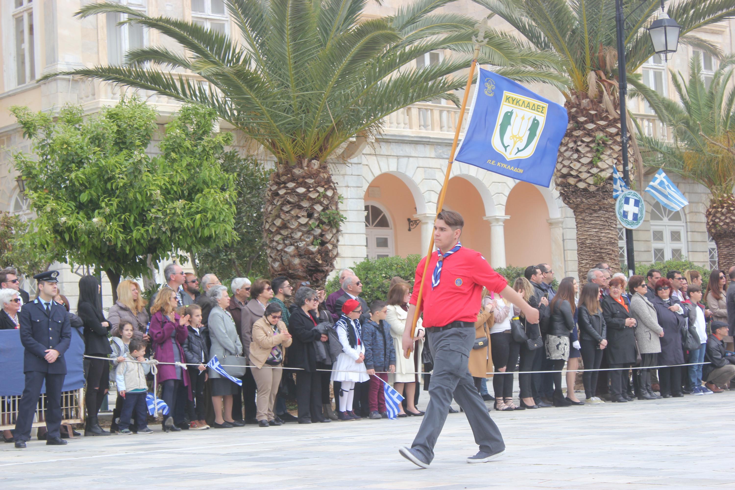 Με σύμμαχο τον καλό καιρό, τμήματα των σχολείων πρωτοβάθμιας και δευτεροβάθμιας εκπαίδευσης, αθλητικοί και πολιτιστικοί σύλλογοι, σπουδαστές της Ακαδημίας Εμπορικού Ναυτικού Σύρου καθώς και διμοιρία του Τάγματος Εθνοφυλακής Ερμούπολης απέτισαν φόρο τιμής στους ήρωες του 1821, εισπράττοντας το θερμό χειροκρότημα του κόσμου, που είχε συρρεύσει από νωρίς στην πλατεία Μιαούλη.
