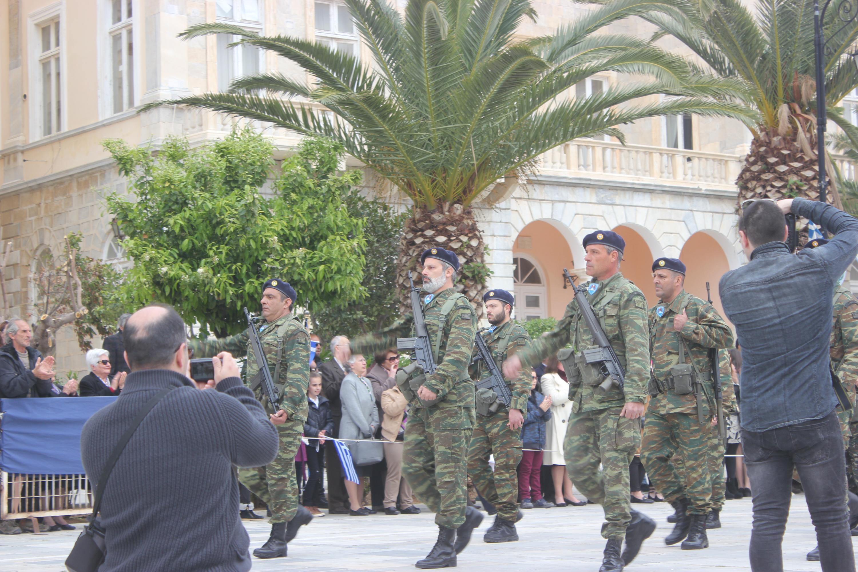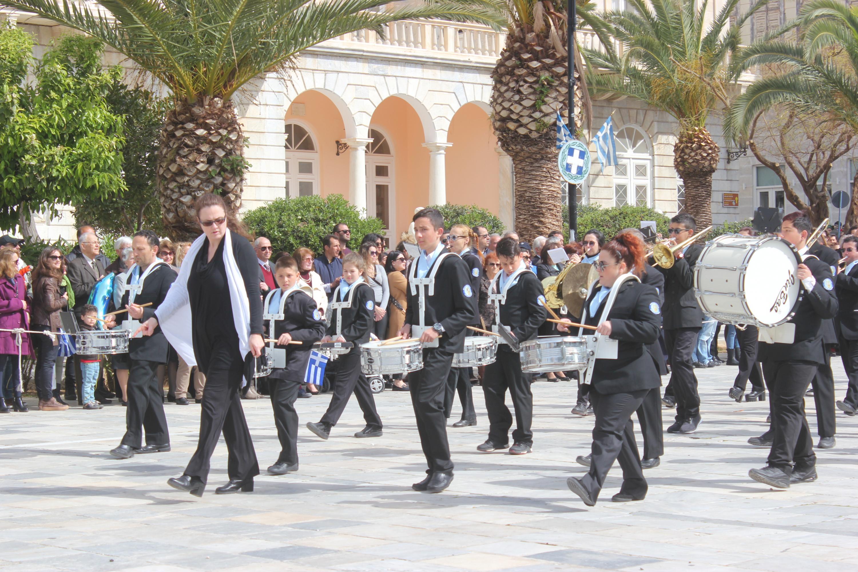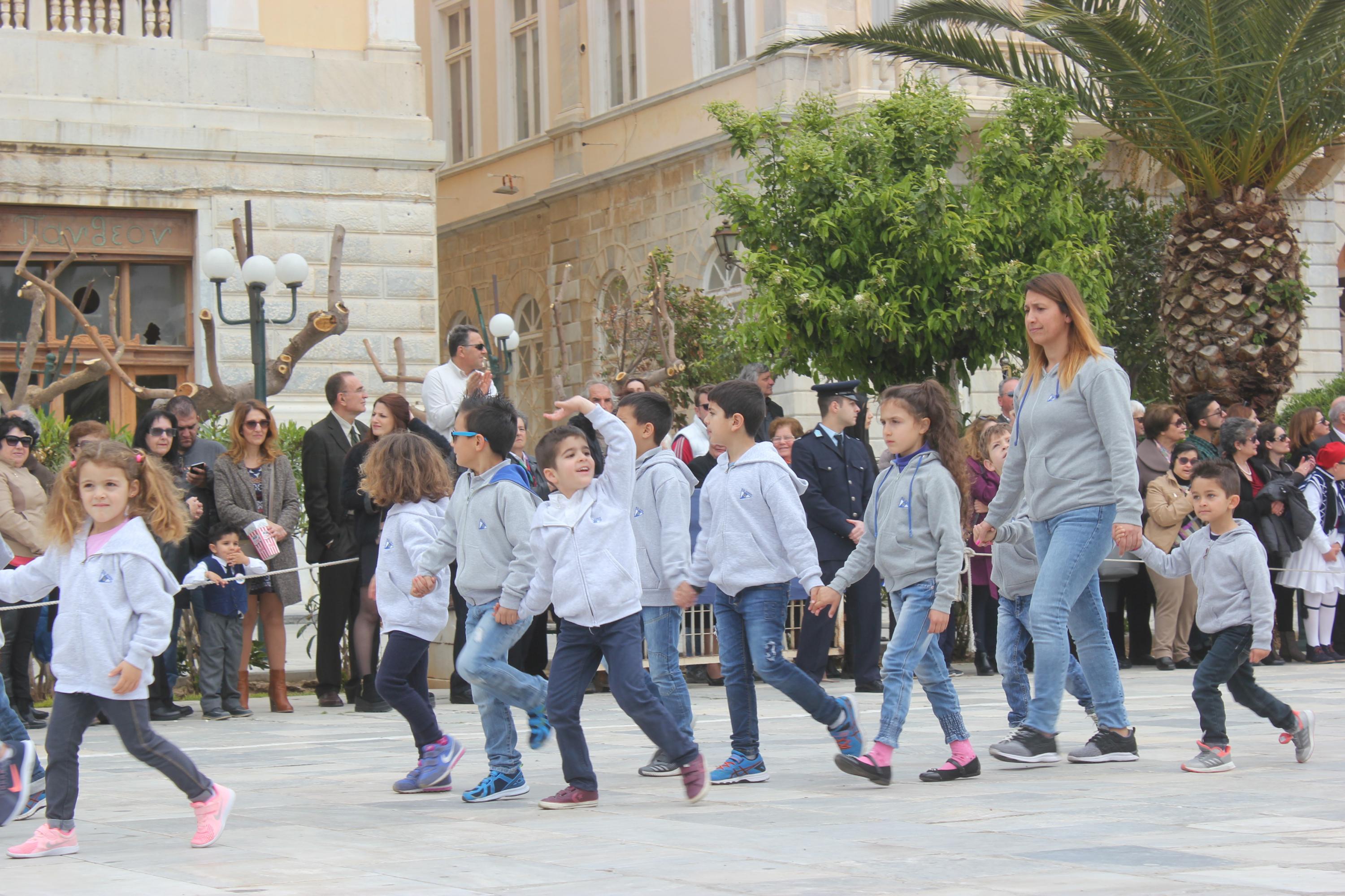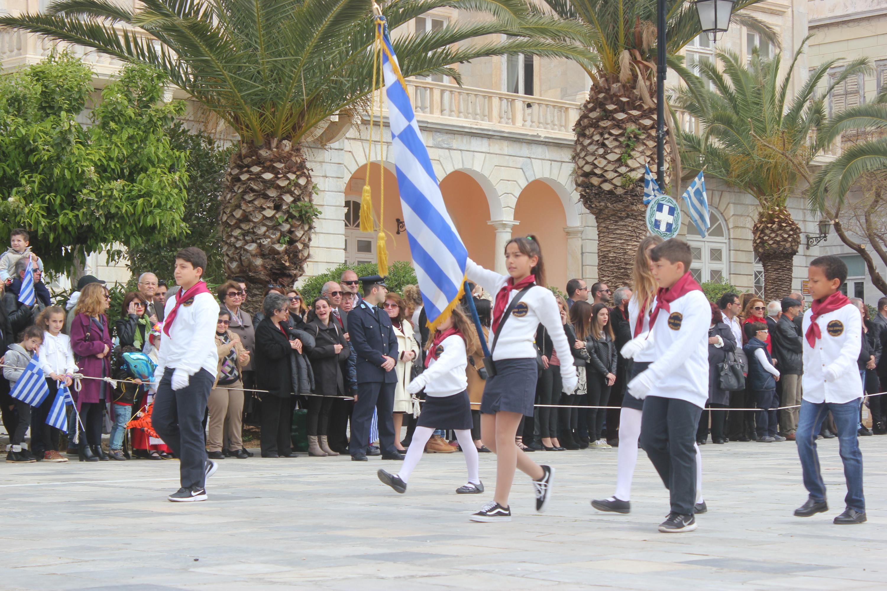 Με σύμμαχο τον καλό καιρό, τμήματα των σχολείων πρωτοβάθμιας και δευτεροβάθμιας εκπαίδευσης, αθλητικοί και πολιτιστικοί σύλλογοι, σπουδαστές της Ακαδημίας Εμπορικού Ναυτικού Σύρου καθώς και διμοιρία του Τάγματος Εθνοφυλακής Ερμούπολης απέτισαν φόρο τιμής στους ήρωες του 1821, εισπράττοντας το θερμό χειροκρότημα του κόσμου, που είχε συρρεύσει από νωρίς στην πλατεία Μιαούλη.
