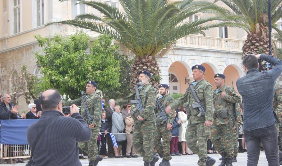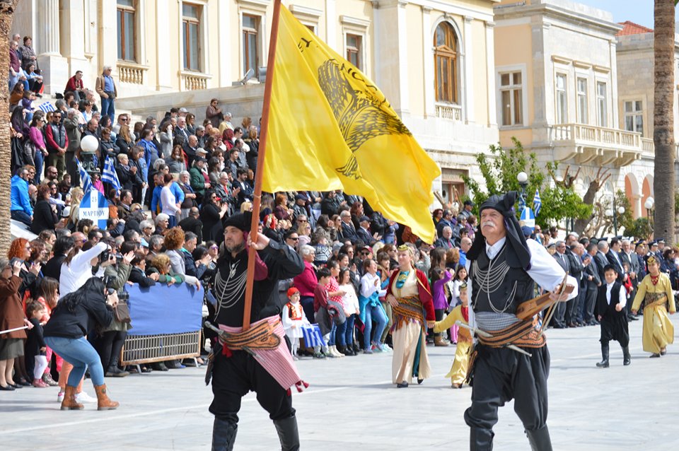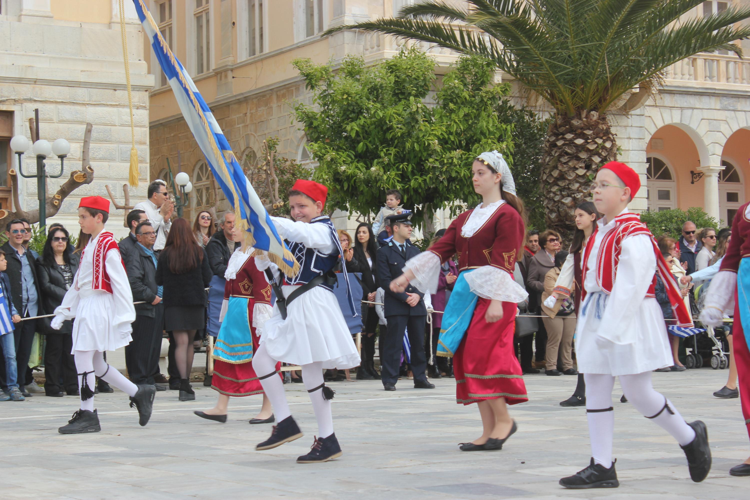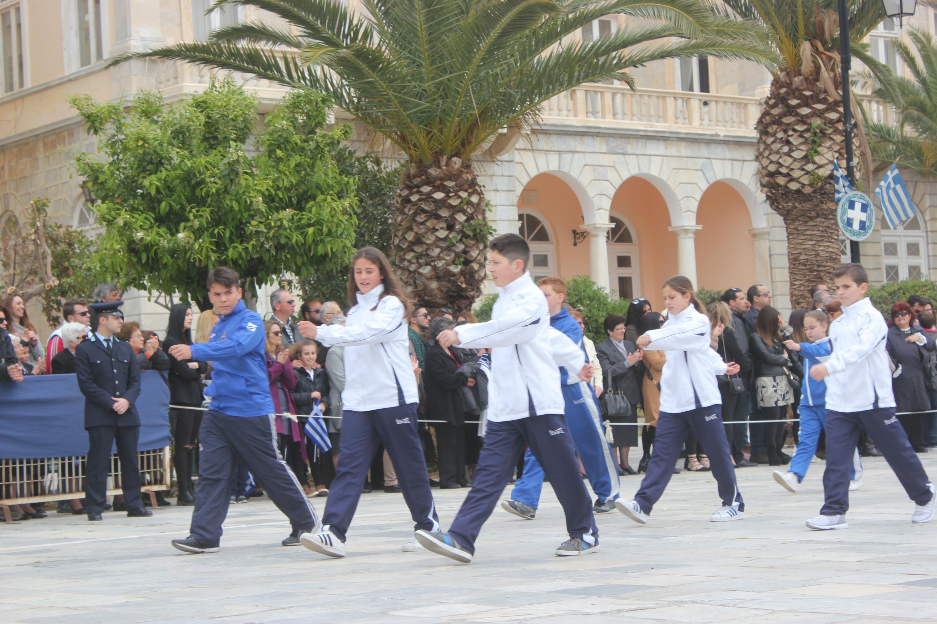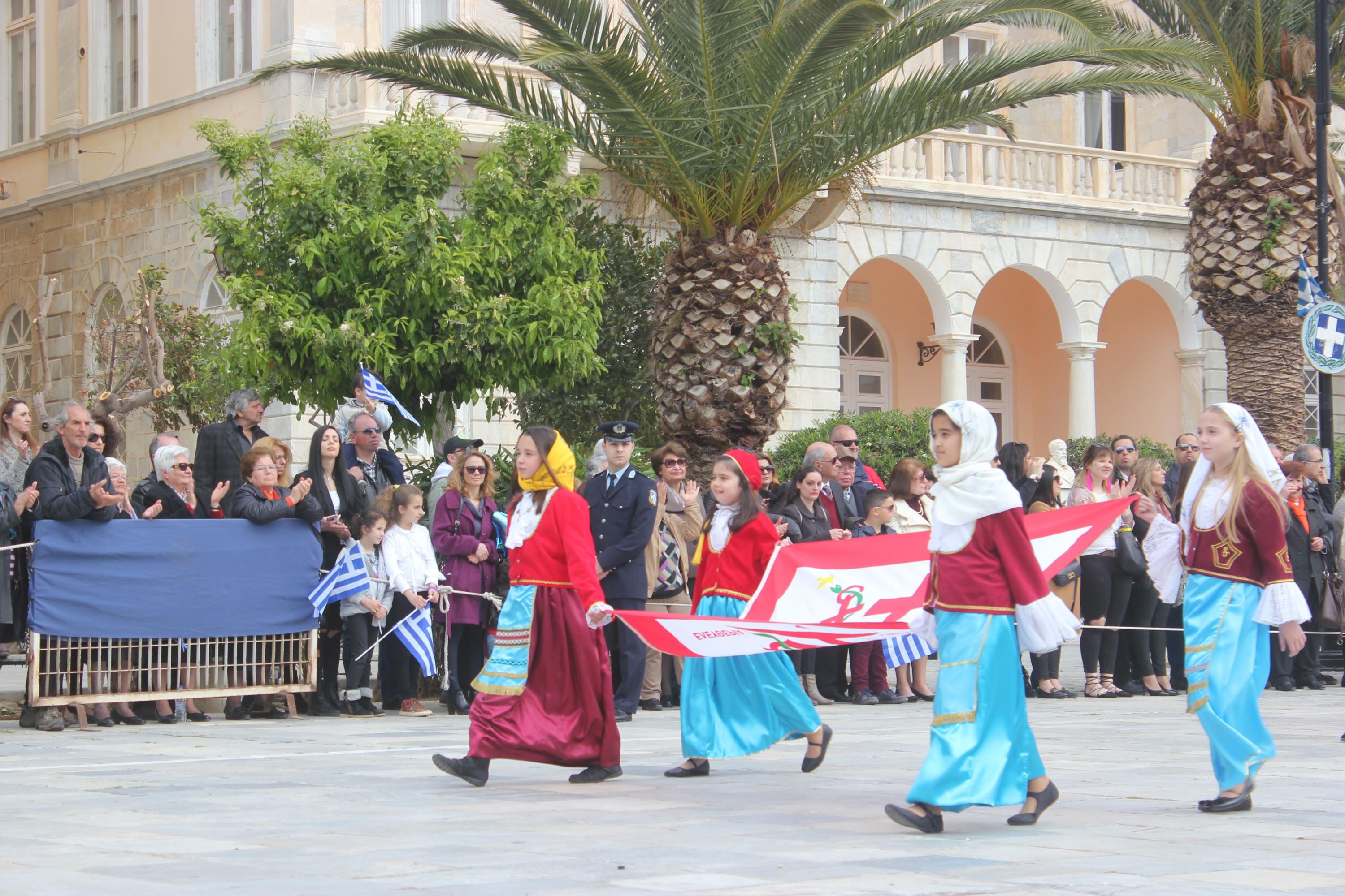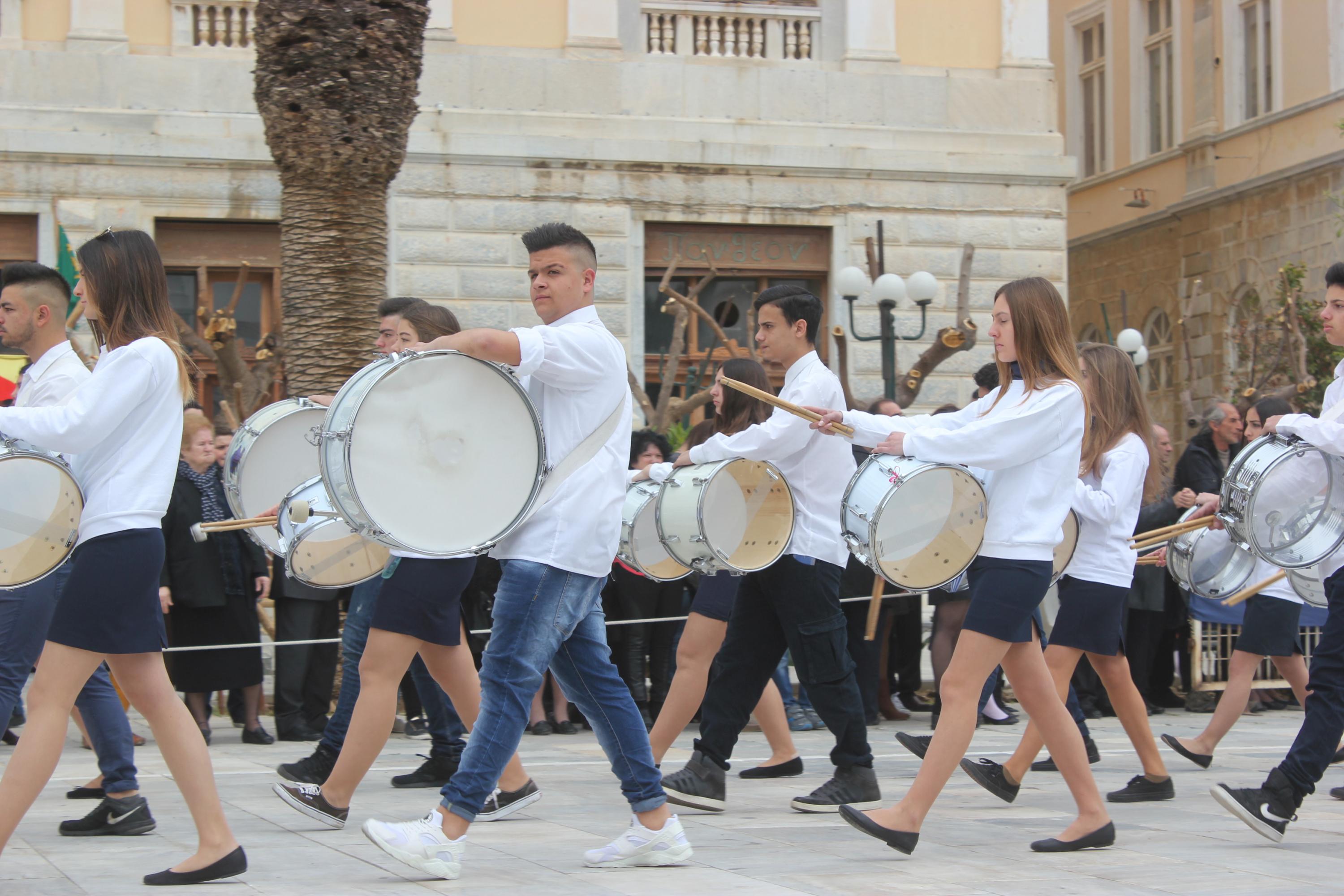 Με σύμμαχο τον καλό καιρό, τμήματα των σχολείων πρωτοβάθμιας και δευτεροβάθμιας εκπαίδευσης, αθλητικοί και πολιτιστικοί σύλλογοι, σπουδαστές της Ακαδημίας Εμπορικού Ναυτικού Σύρου καθώς και διμοιρία του Τάγματος Εθνοφυλακής Ερμούπολης απέτισαν φόρο τιμής στους ήρωες του 1821, εισπράττοντας το θερμό χειροκρότημα του κόσμου, που είχε συρρεύσει από νωρίς στην πλατεία Μιαούλη.